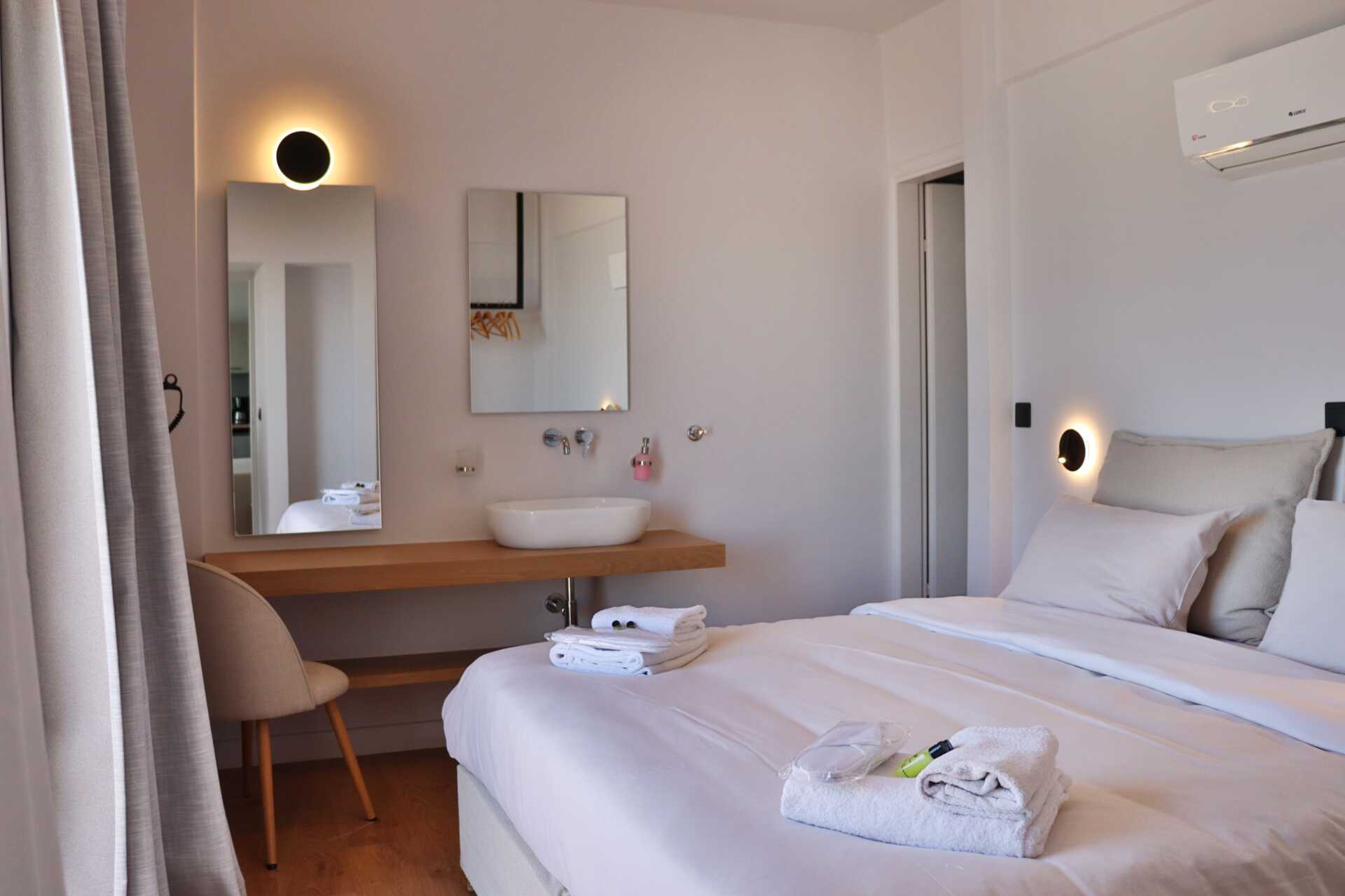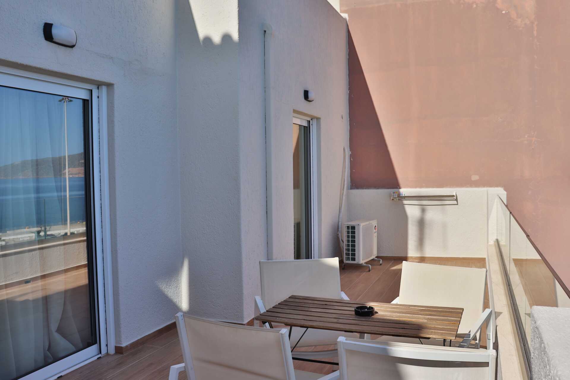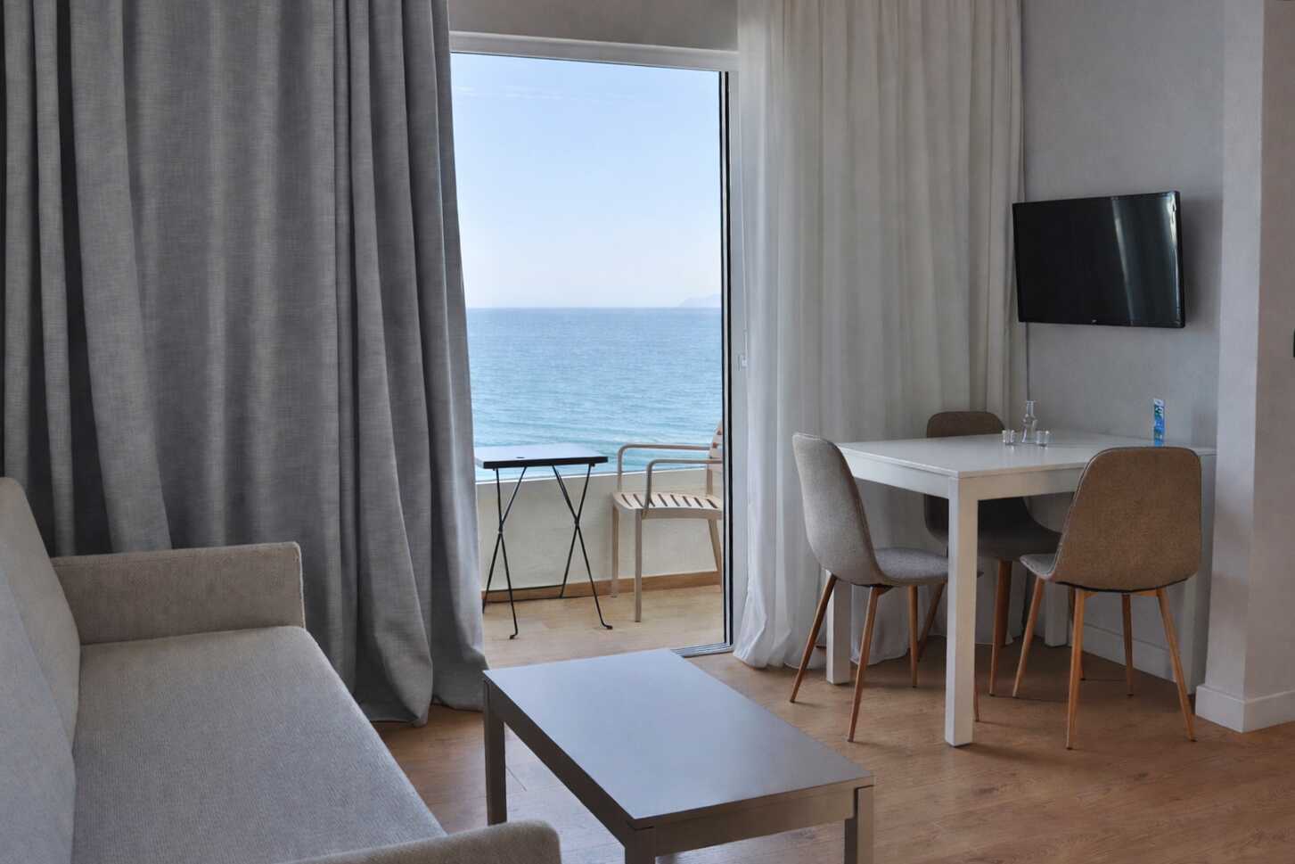 Kaksio parvekkella tai terassilla ja merinäköala. Makuuhuone ja yhdistetty olohuone ja minikeittiö. Parivuode tai kaksi yhden hengen sänkyä. lisävuodemahdollisuus vuodesohvaan, jossa on ulosvedettävä sänky. Minikeittiössä keittolevyt, jääkaappi, vedenkeitin, kahvinkeitin ja yksinkertainen keittiövarustus. Maksuton wifi, ilmastointi ja tallelokero. Tv paikallisilla kanavilla. Hiustenkuivain. Suihku ja wc. Siivous 6 krt/viikko.