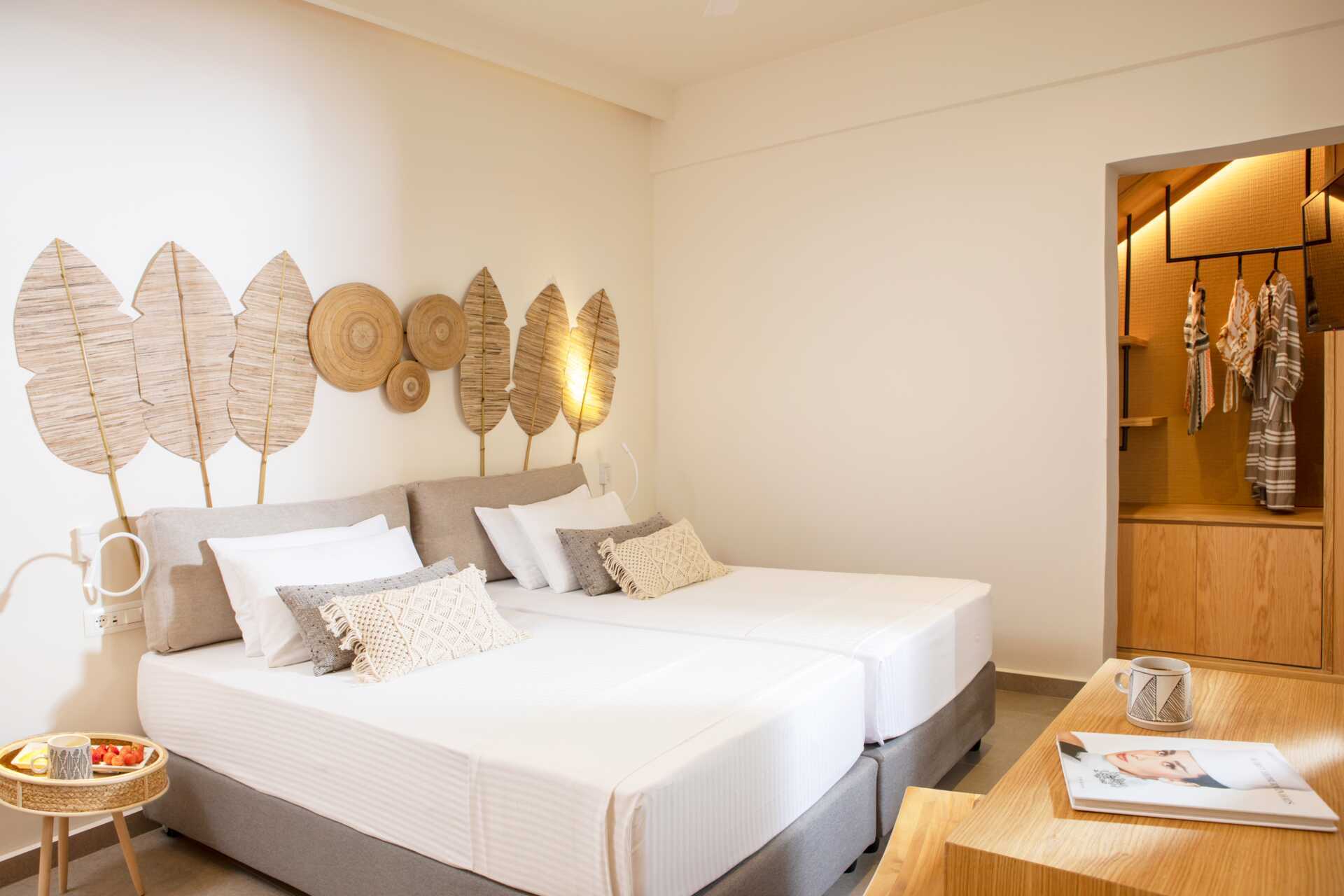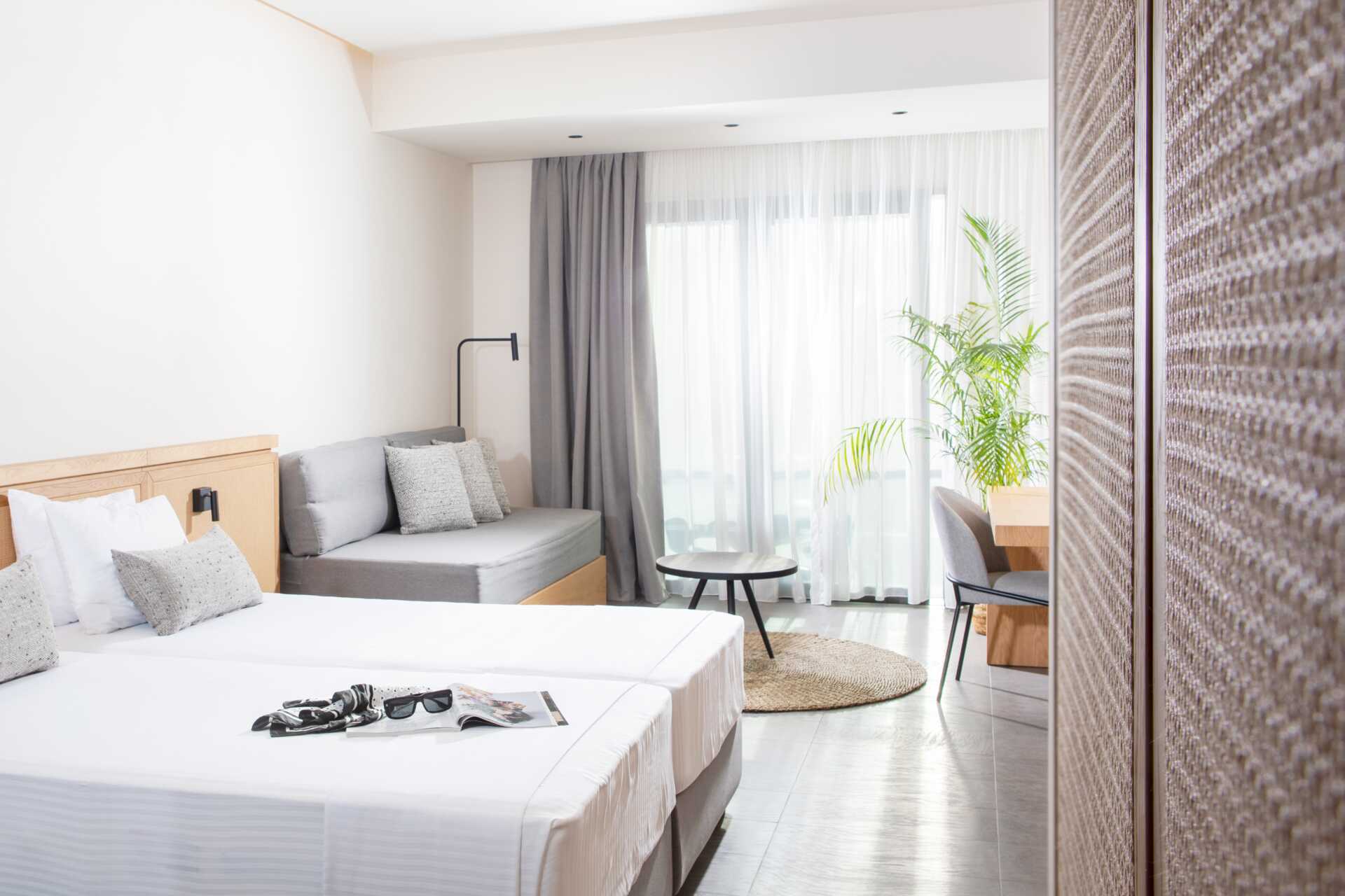 Perhehuoneessa parveke ja rajoitetulla merinäköala. Huoneet sijaitsevat Almyrida Beachillä. Parivuoteella ja vuodesohvalla varustettu makuutila voidaan erottaa liukuovella tilasta, jossa on toinen vuodesohva. Maksuton wifi ja ilmastointi. Tallelokero lisämaksulla. Jääkaappi. Tv kansainvälisillä kanavilla on saatavilla sekä makuuhuoneessa että tilaan, jossa on vuodesohva. Hiustenkuivain. Kylpyhuoneessa amme/suihku ja wc. Hyttysverkko parvekkeen ovessa. Siivous 7 krt/viikko.