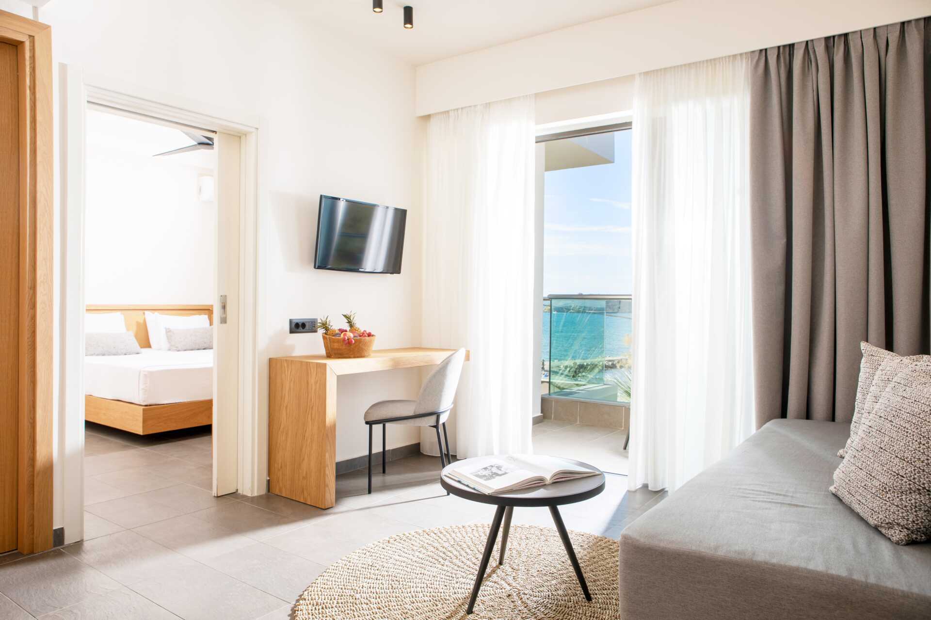 Kahden huoneen sviitti parvekkeella ja merinäköalalla. Sviitit sijaitsevat Almyrida Residencessä. Yksi makuuhuone ja olohuone. Parivuode tai kaksi yhden hengen sänkyä. Lisävuodemahdollisuus vuodesohvasta. Maksuton wifi ja ilmastointi. Tallelokero lisämaksusta. Jääkaappi. Jokaisessa huoneessa on televisio kansainvälisillä kanavilla. Hiustenkuivain. Kylpyhuoneessa suihku ja wc. Siivous 7 krt/viikko. Maksuttomat allaspyyhkeet huoneessa saavuttaessa.