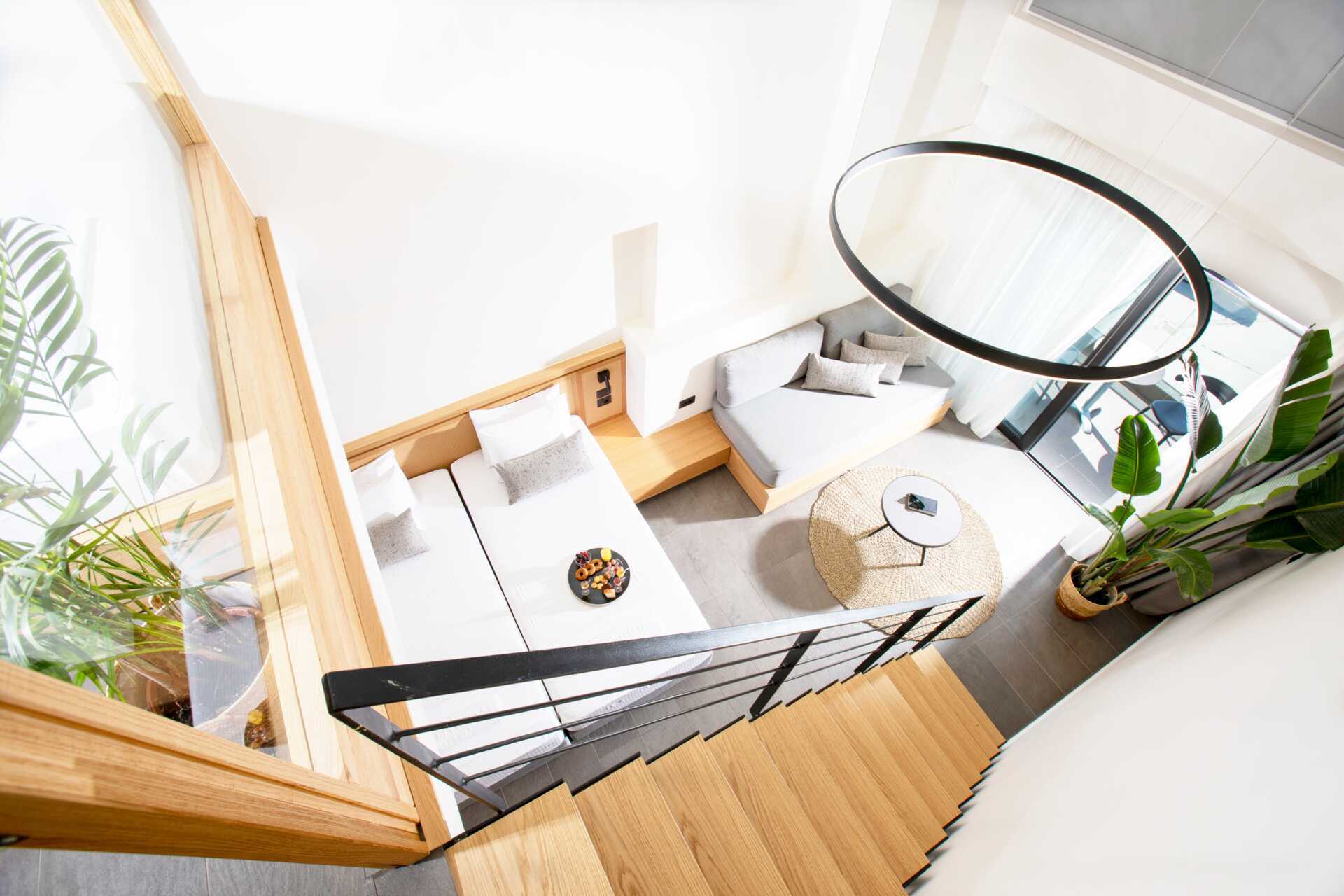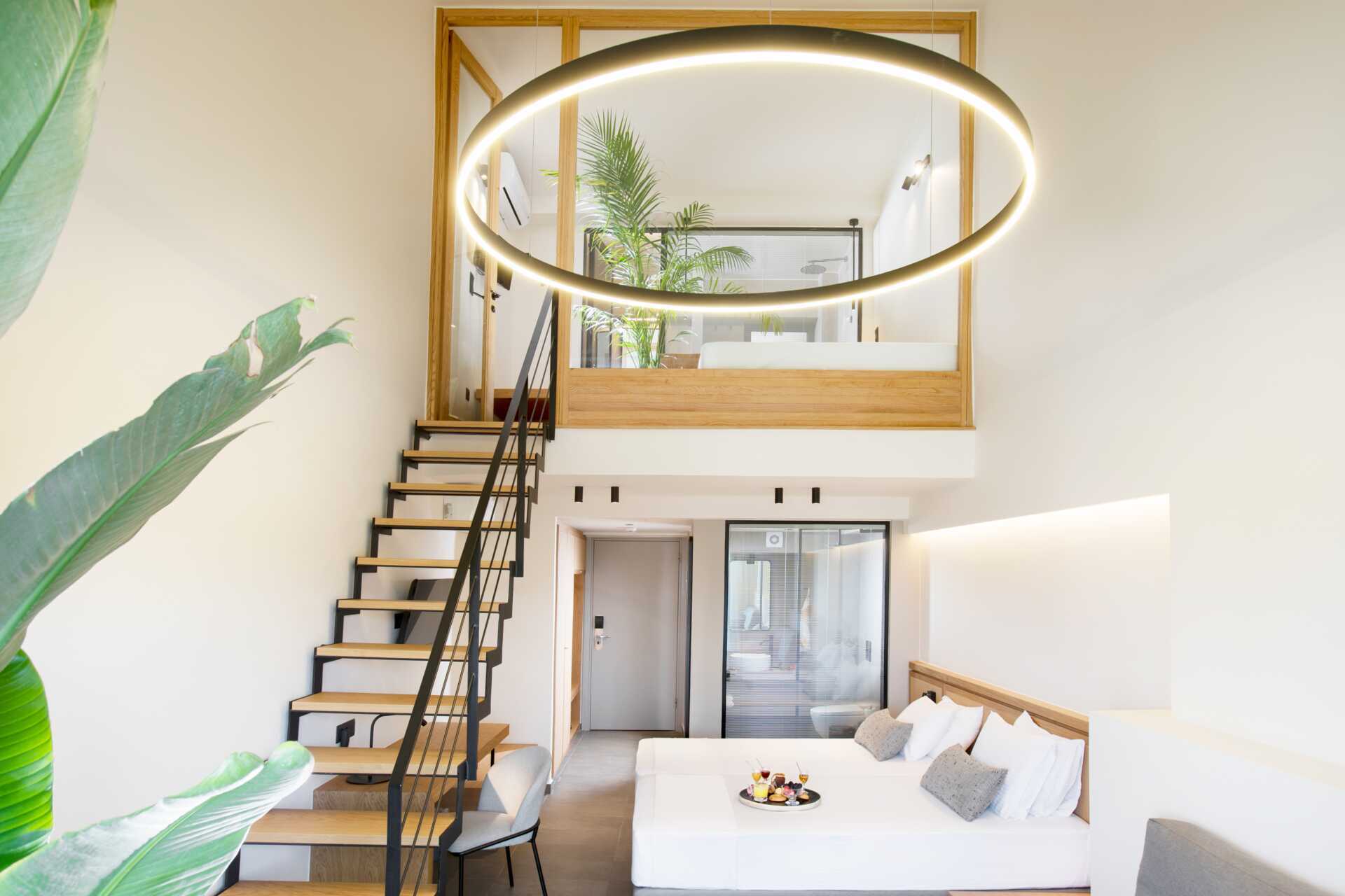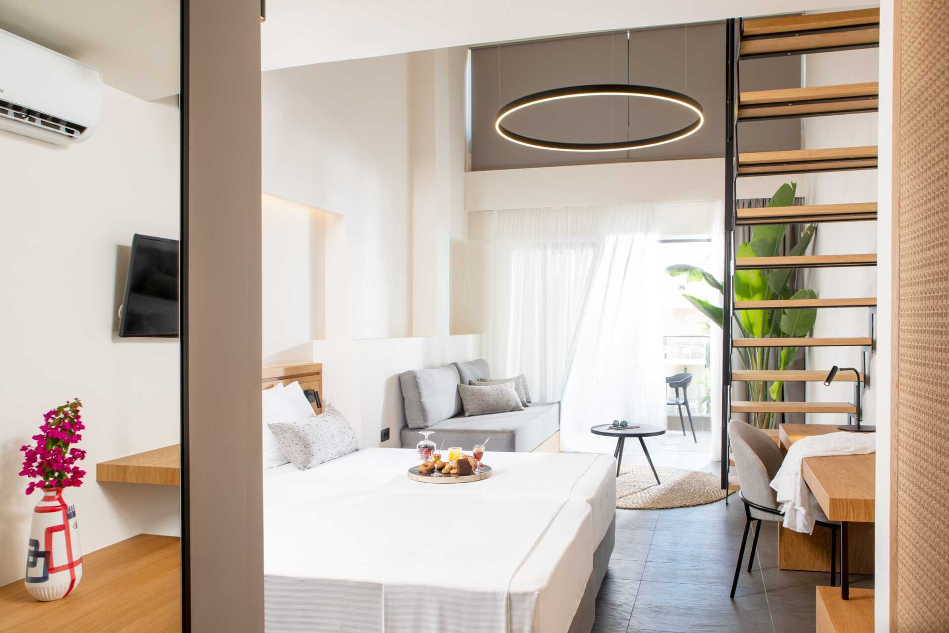 Kahden hengen huoneessa joka on kahdessa kerroksessa on parveke ja rajoitettu merinäköala. Huoneet sijaitsevat Almyrida Residencessä. Sisääntulokerroksessa on kylpyhuone ja lisävuodemahdolisuus kahdessa parivuoteessa ja vuodesohvalla. Yläkerrassa on makuuhuone parivuoteella ja kylpyhuone suihkulla. Huoneiden välissä on lasiovet ja ikkunat. Maksuton wifi ja ilmastointi. Tallelokero lisämaksulla. Jääkaappi, kahvinkeitin ja vedenkeitin. Tv kansainvälisillä kanavilla molemmissa kerroksissa. Hiustenkuivain. Siivous 7 krt/viikko. Allaspyyhkeet maksutta, ja ne ovat huoneessa saavuttaessa.