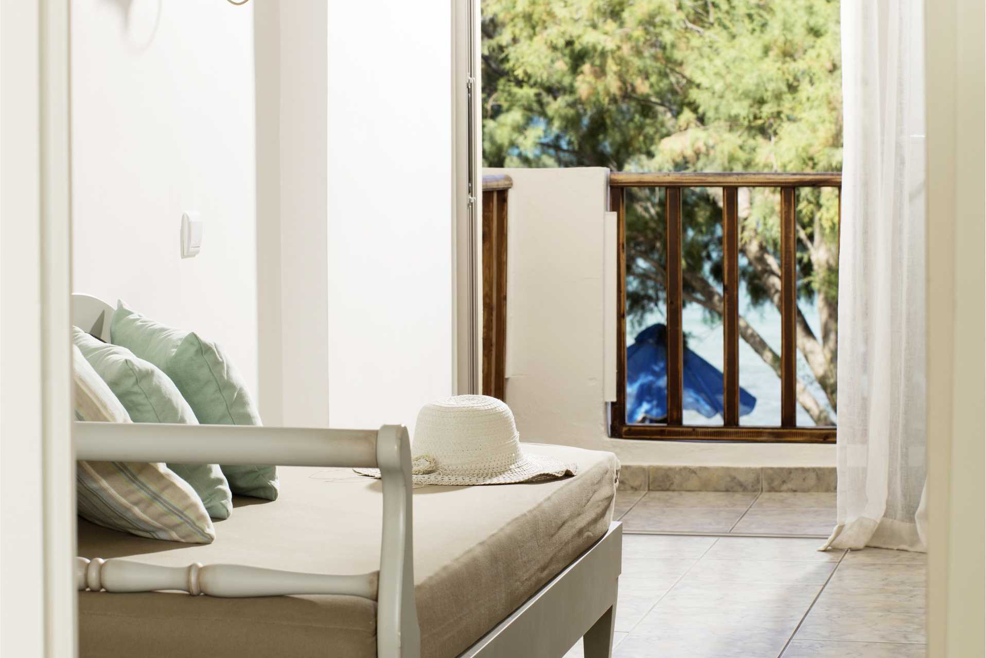 Kahden hengen huone parvekkeella, osassa huoneista rajoitettu merinäköala. Huoneet sijaitsevat Almyrida Beachissa. Parivuode tai kaksi yhden hengen vuodetta. Lisävuodemahdollisuus vuodesohvasta. Maksuton wifi ja ilmastointi. Tallelokero lisämaksusta. Jääkaappi. Tv kansainvälisillä kanavilla. Hiustenkuivain. Kylpyamme/suihku ja wc. Hyttysverkko parvekkeen ovessa. Siivous 7 krt/viikko.