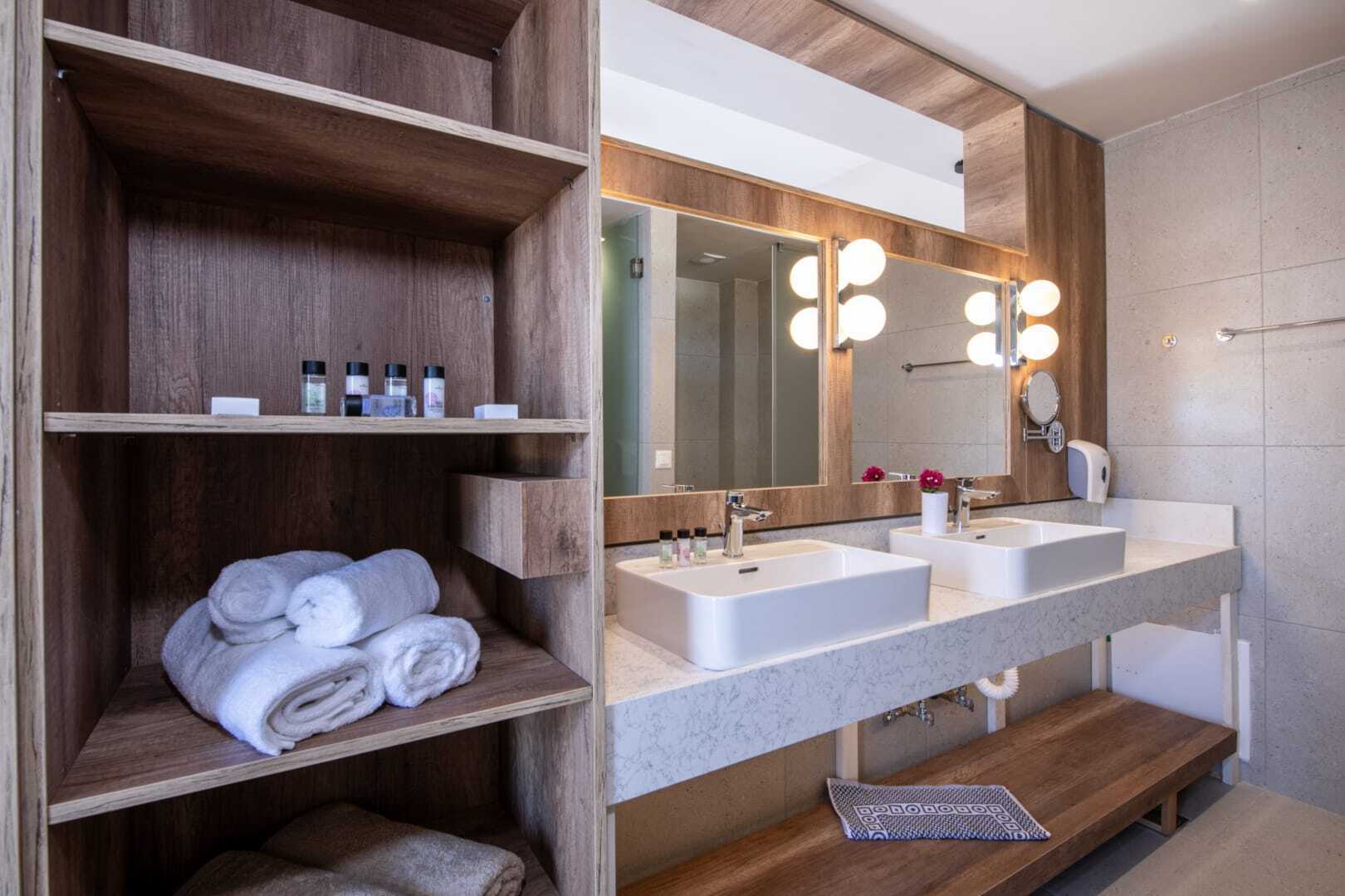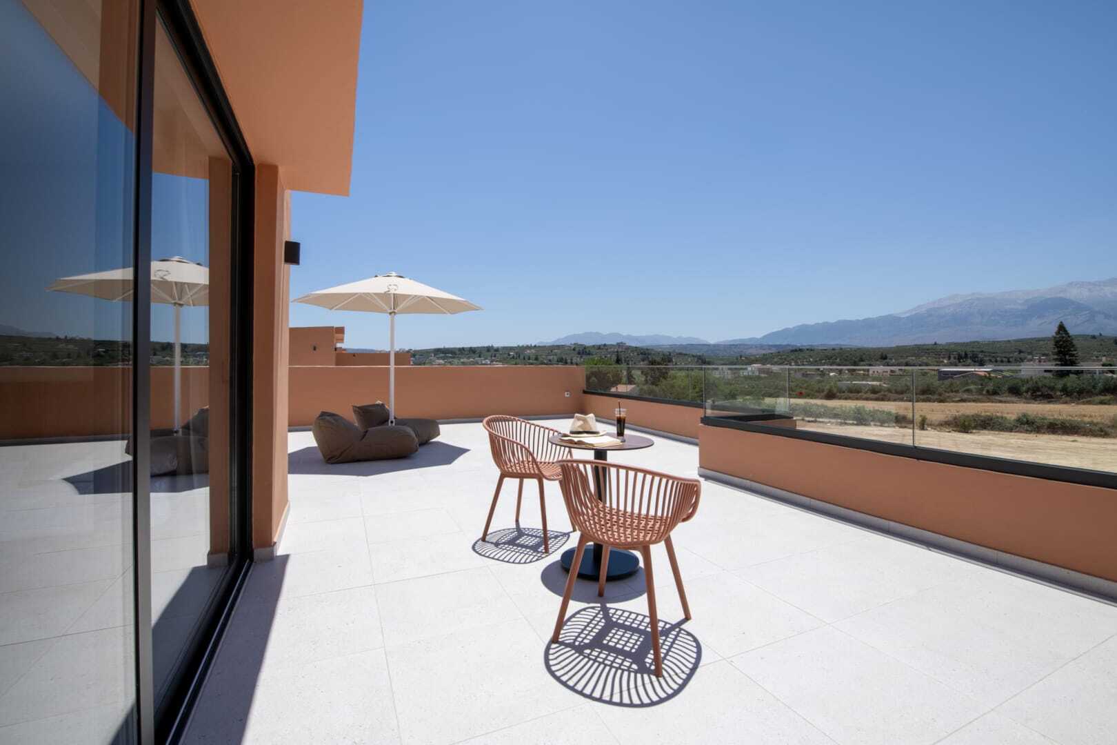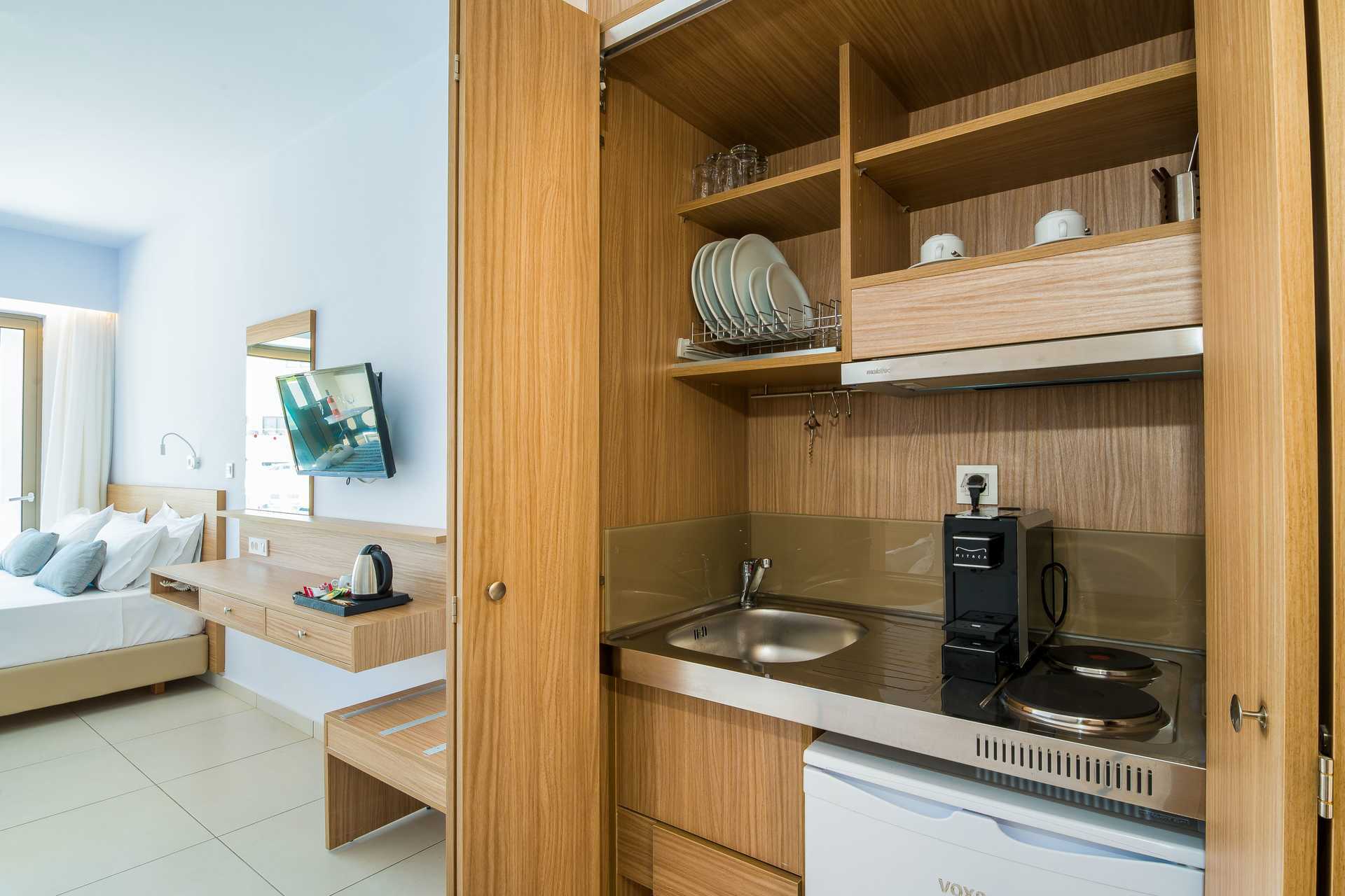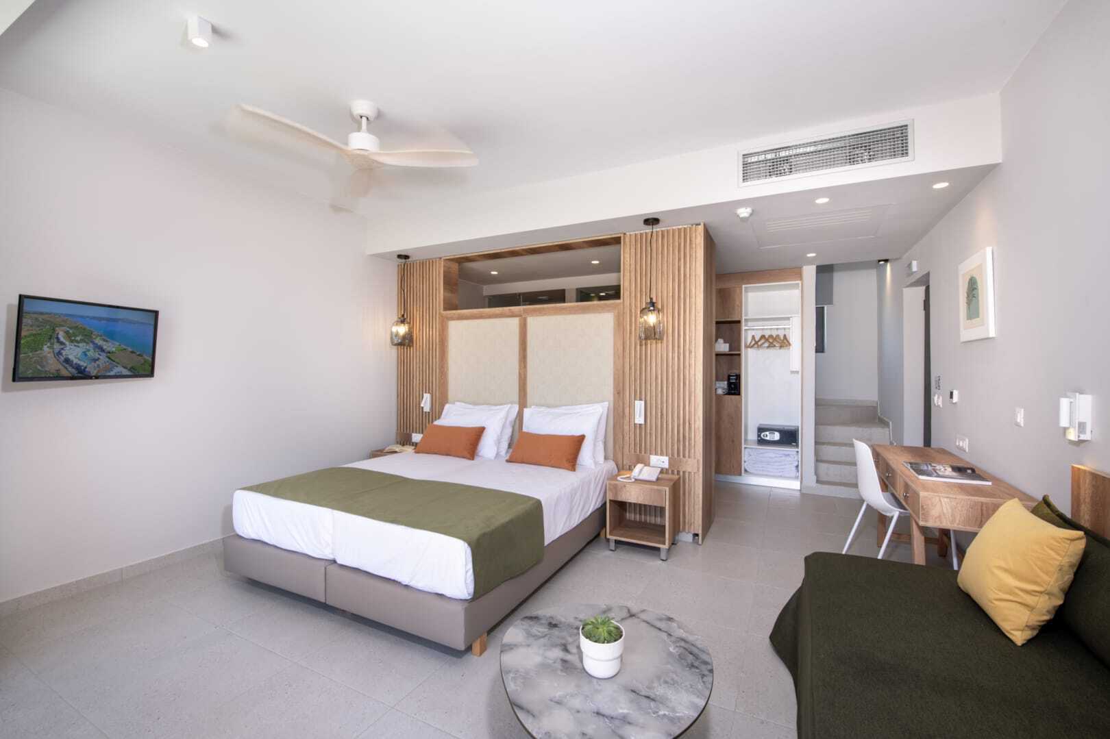 Superior-yksiö, parvekkeella tai terassilla, joista osasta on merinäköala. Huoneistot sijaitsevat South Wing -hotelliosassa. Huoneisto voidaan jakaa liukuovella, ja muodostaa makuuhuoneen parivuoteella tai kahdella yhden hengen vuoteella ja olohuoneen kahdella vuodesohvalla. Maksuton wifi, ilmastointi ja tallelokero. Kattotuuletin. Minikeittiössä keittolevyt, jääkaappi, Nespresso-kahvikone, vedenkeitin, kahvia ja teetä sekä yksinkertainen keittiövarustus. Ulkoruokailutila. Tv kansainvälisillä kanavilla, yksi makuuhuoneessa ja yksi olohuoneessa. Hiustenkuivain. Suihku ja wc. Siivous 7 krt/viikko.