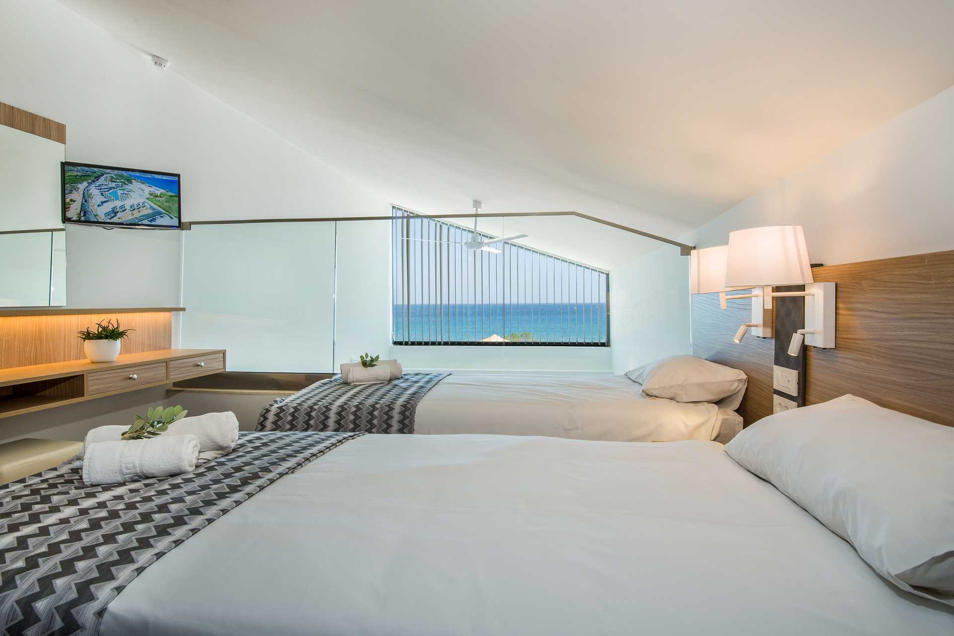 Kaksikerroksinen yksiö, parvekkeella ja rajoitetulla merinäköalalla. Huoneistot sijaitsevat North Wingissä. Avoin pohjaratkaisu kerrosten välillä. Huoneistot sijaitsevat rantarakennuksessa. Sisääntulokerroksessa on yhdistetty makuuhuone/olohuone/minikeittiö ja kylpyhuone, jossa kylpyamme ja wc. Kaksi erillistä sänkyä. Yläkerran makuuparvella on parivuode. Lisävuodemahdollisuus taitettavaan sänkyyn. Maksuton wifi, ilmastointi ja tallelokero. Kattotuuletin. Minikeittiössä keittolevyt, jääkaappi, Nespresso-kahvikone, vedenkeitin ja yksinkertainen keittiövarustus. Ruokailutila parvekkeella. Tv kansainvälisillä kanavilla molemmissa kerroksissa. Hiustenkuivain. Amme ja wc. Siivous 7 krt/viikko.