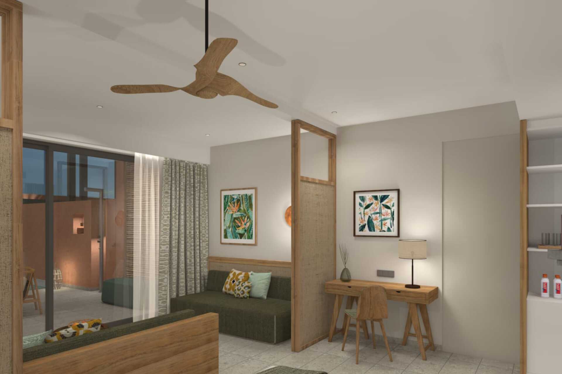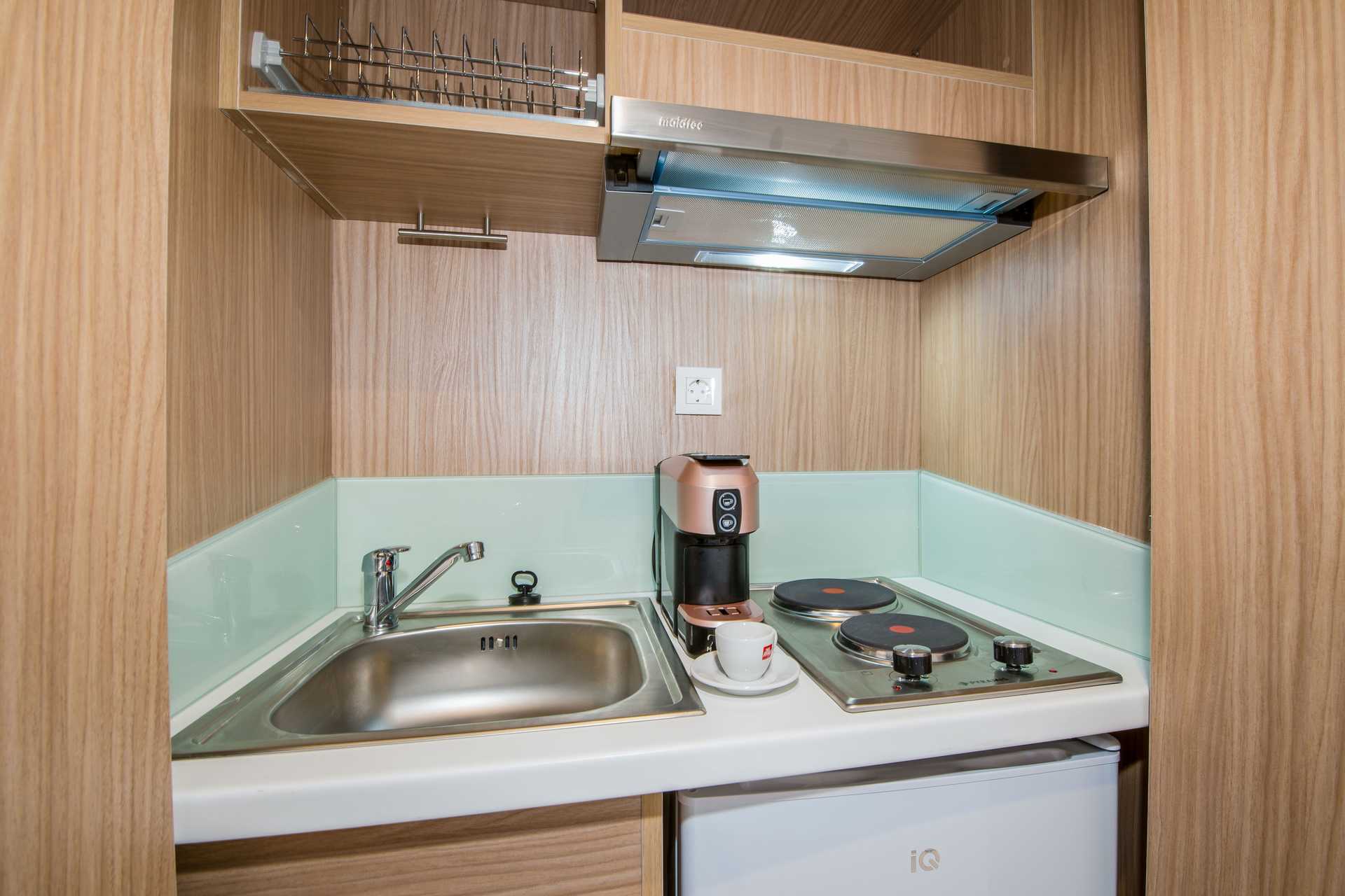 Yksiö, parvekkeella tai terassilla. Asunnoissa on erilaisia pohjaratkaisuja, ja ne voivat sijaita sekä etelä- että pohjoissiivessä. Yhdistetty makuuhuone ja minikeittiö. Huoneisto voidaan jakaa liukuovella, ja muodostaa makuuhuoneen parivuoteella tai kahdella yhden hengen vuoteella ja olohuoneen kahdella vuodesohvalla. Minikeittiössä keittolevyt, jääkaappi, vedenkeitin, Nespresso-kahvinkeitin ja yksinkertainen keittivarustus. Ulkoruokailutila. Maksuton wifi, ilmastointi ja tallelokero. Kattotuuletin. Tv kansainvälisillä kanavilla. Hiustenkuivain. Amme ja wc. Siivous 7 krt/viikko.
