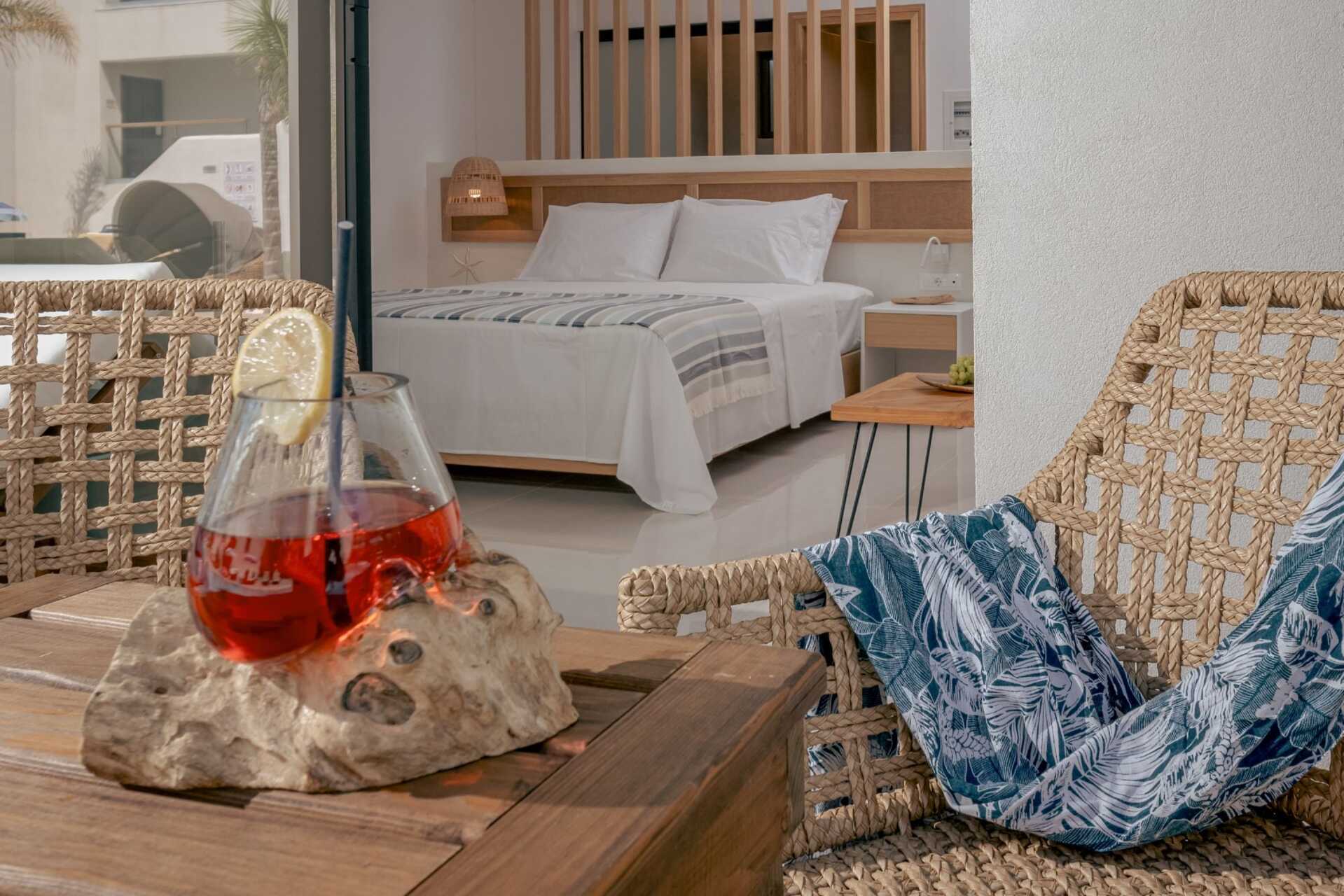 Deluxe-huone, jossa on terassi ja allaspääsy jaetulle uima-altaalle. Terassilla on pieni pöytä, kaksi aurinkotuolia ja tikkaat alas altaaseen. Yhdistetty makuuhuone ja minikeittiö. Parivuode. Minikeittiössä keittolevyt, uuni, jääkaappi, vedenkeitin, leivänpaahdin ja yksinkertainen keittiövarustus. Maksuton wifi, ilmastointi ja tallelokero. Jääkaappi. Tv kansainvälisillä kanavilla. Hiustenkuivain. Kylpyhuoneessa suihku ja wc. Siivous 7 krt/viikko.