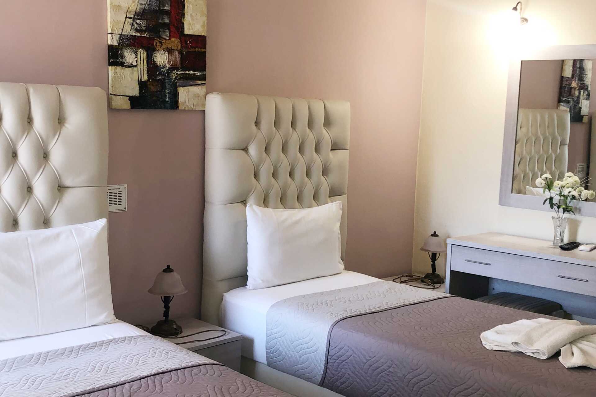 Kahden hengen huoneita parvekkeella. Parivuode tai erilliset vuoteet. Maksuton wifi. Ilmastointi lisämaksusta. Jääkaappi. Tv paikallisilla kanavilla. Hiustenkuivain. Kylpyhuone, jossa suihku ja wc. Siivous 3 krt/viikko. Alle 2-vuotiaat lapset katsotaan lisävuoteessa majoittuviksi henkilöiksi.