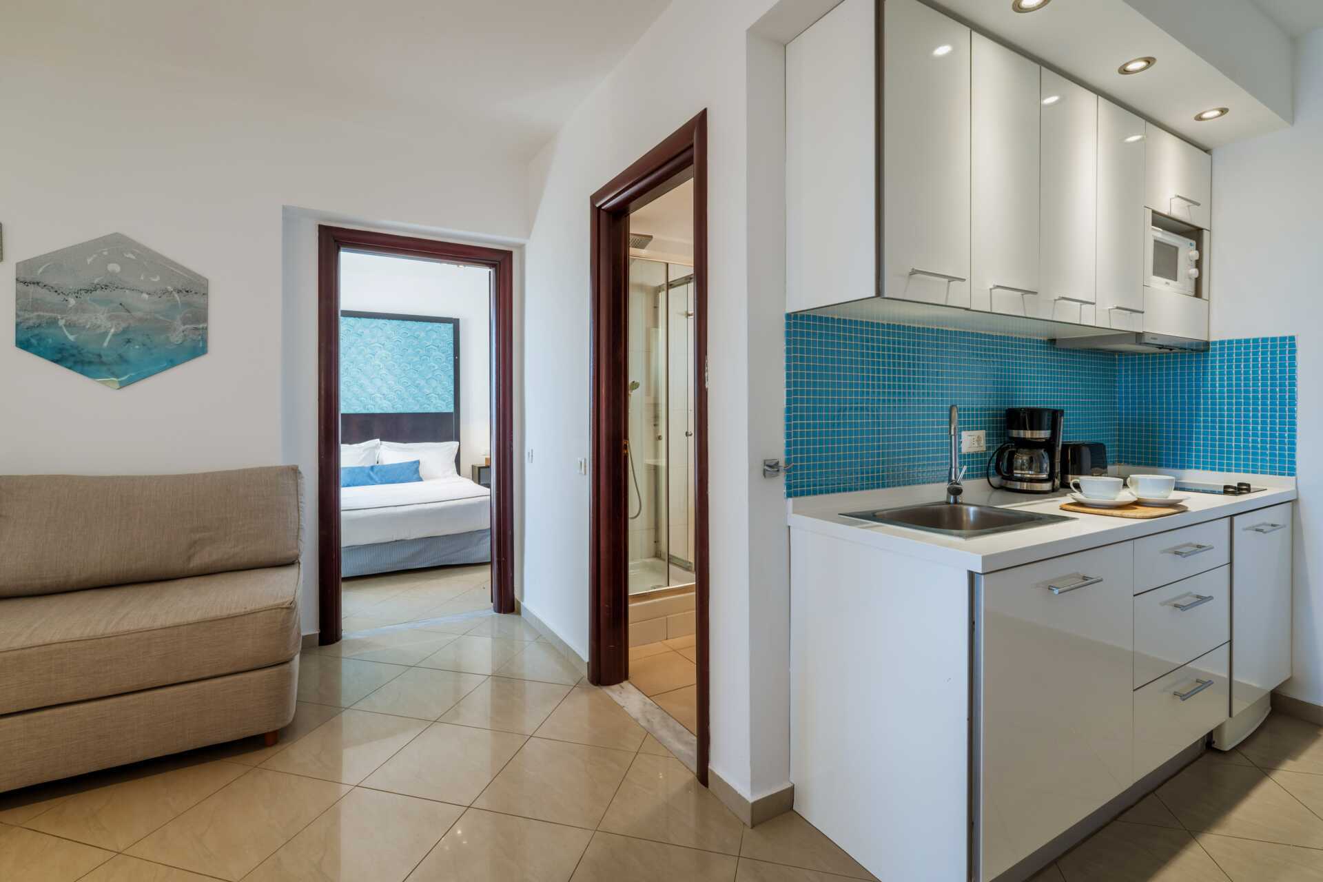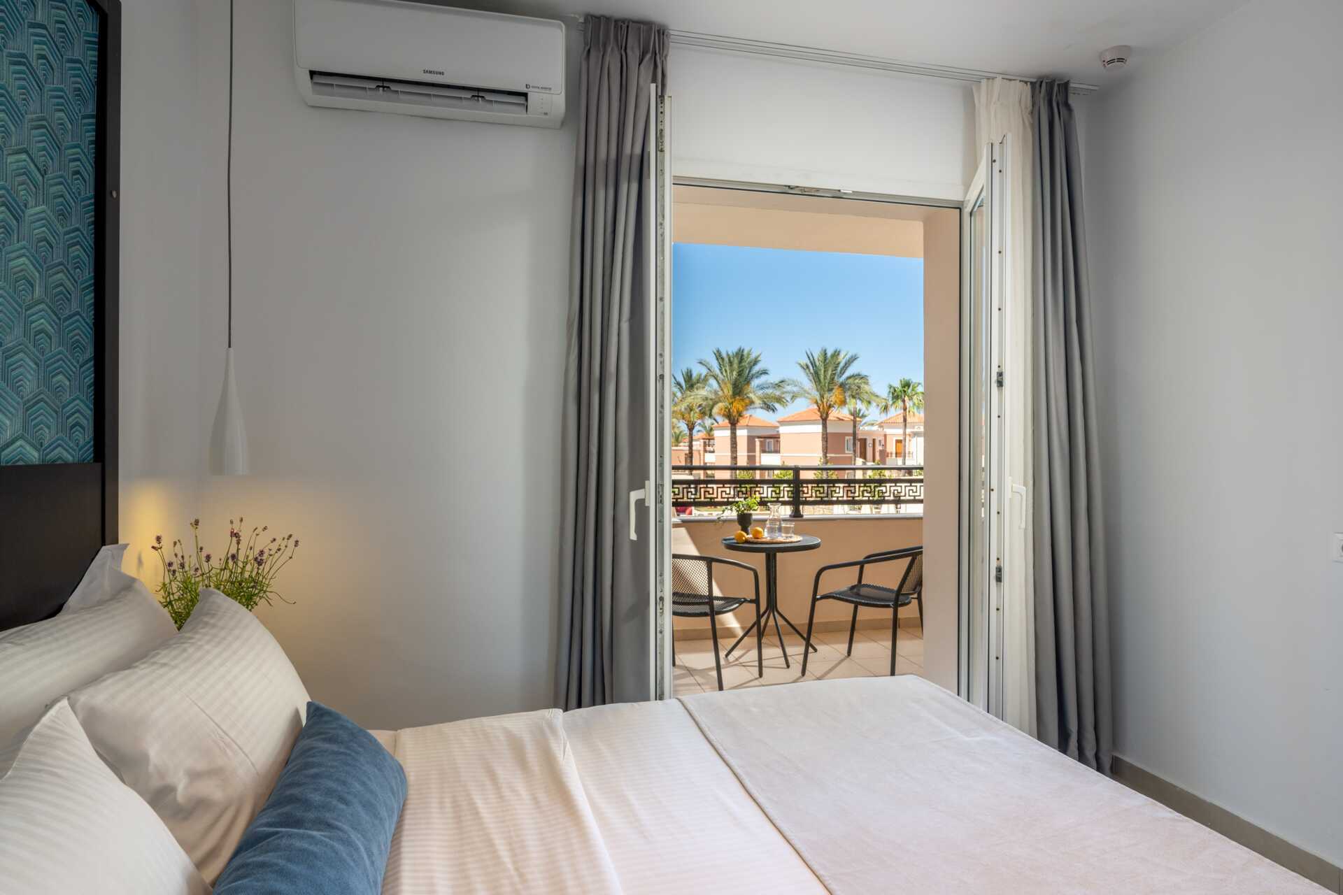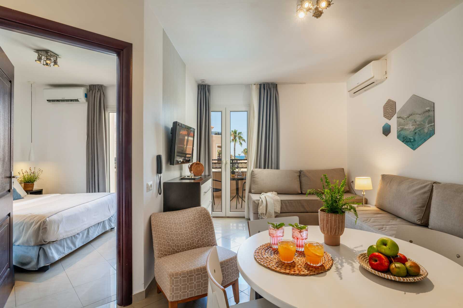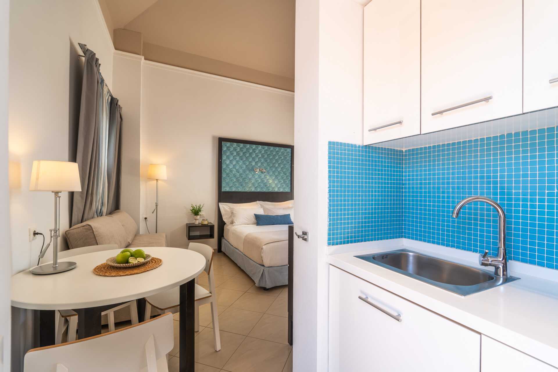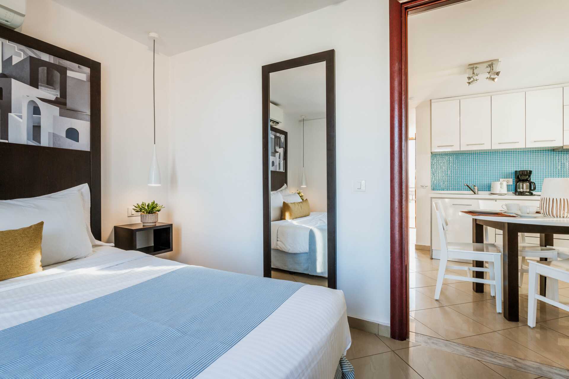 Kaksio parvekkeella, joista osasta on rajoitettu merinäköala tai merinäköala. Huoneistot sijaitsevat hotellin Aphrodite-osassa, lähempänä merta. Kolmen hengen huoneet ovat kooltaan n. 28-30 neliömetriä, neljän hengen huoneet noin 30-40 neliömetriä. Makuuhuone sekä yhdistetty olohuone ja minikeittiö. Parivuode. Lisävuodemahdollisuus vuodesohvaan. Minikeittiössä jääkaappi, keittolevyt, kahvinkeitin, vedenkeitin, leivänpaahdin ja yksinkertainen keittiövarustus. Maksuton wifi, ilmastointi ja tallelokero. Tv kansainvälisillä kanavilla. Hiustenkuivain. Kylpyhuoneessa suihku ja wc. Siivous 6 krt/viikko.
