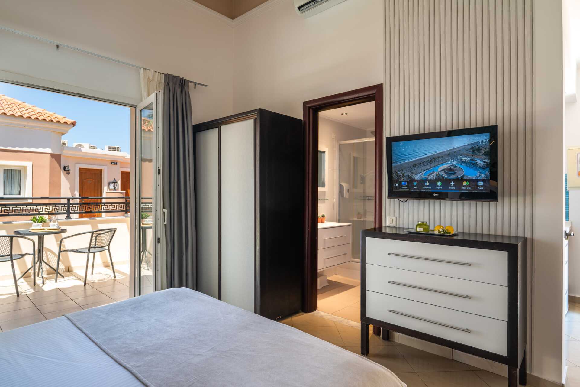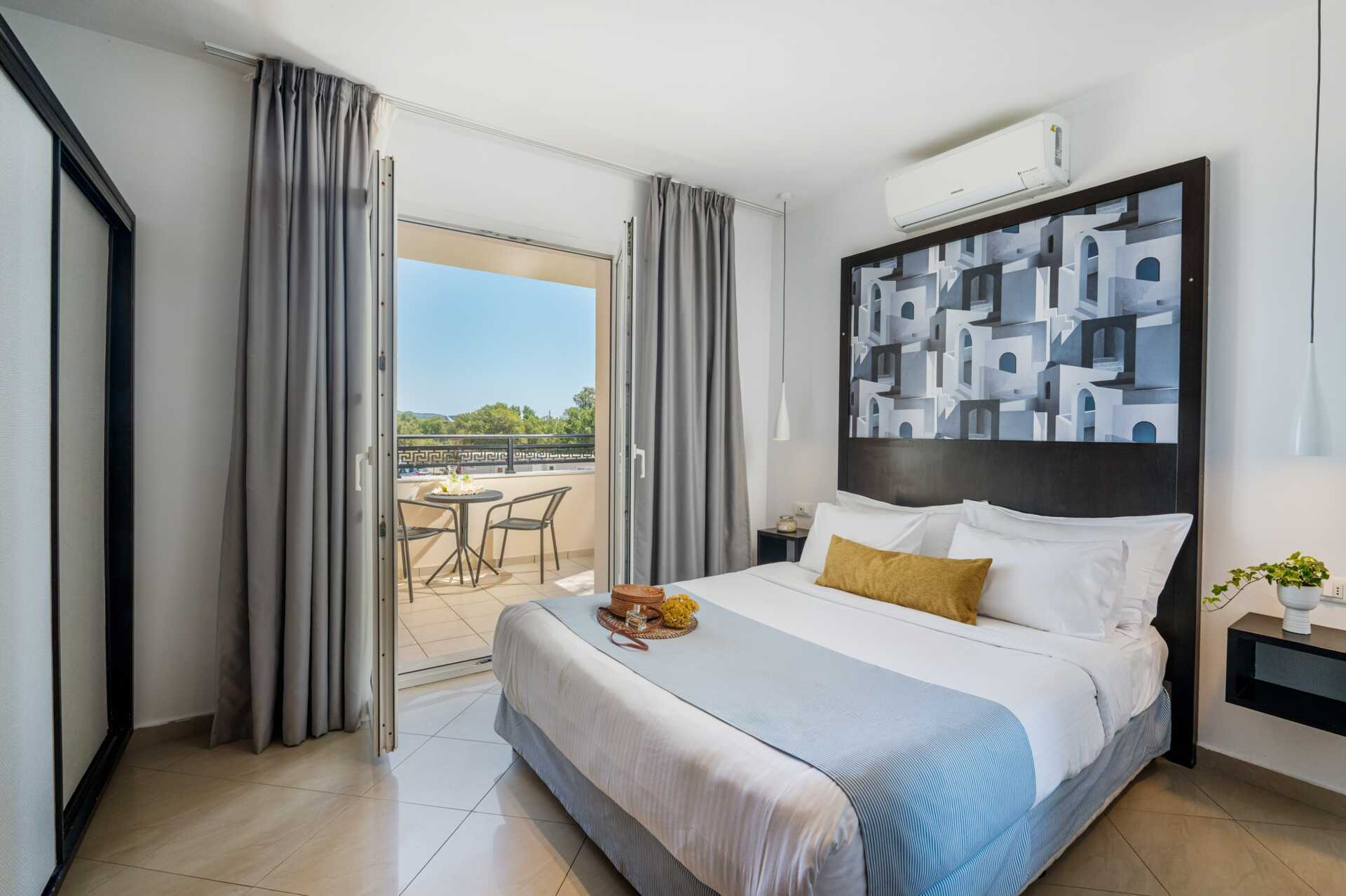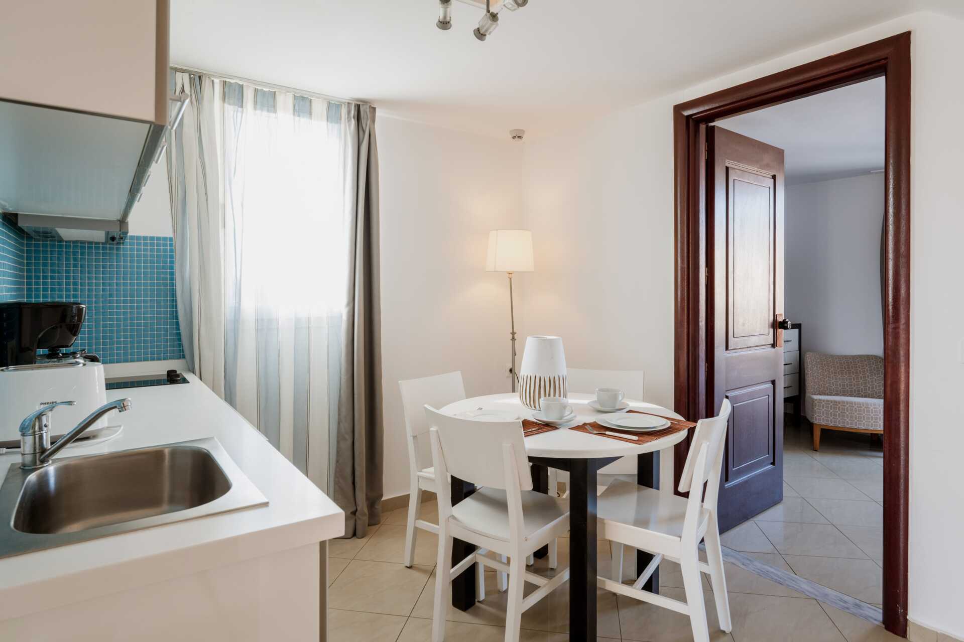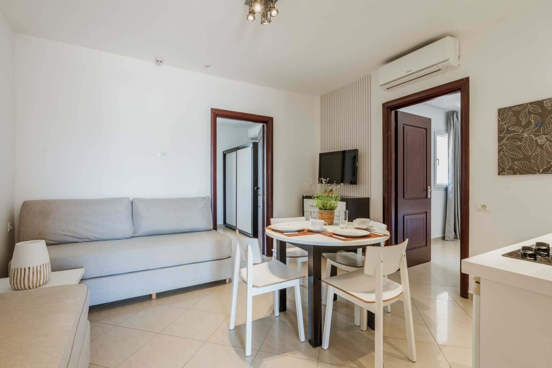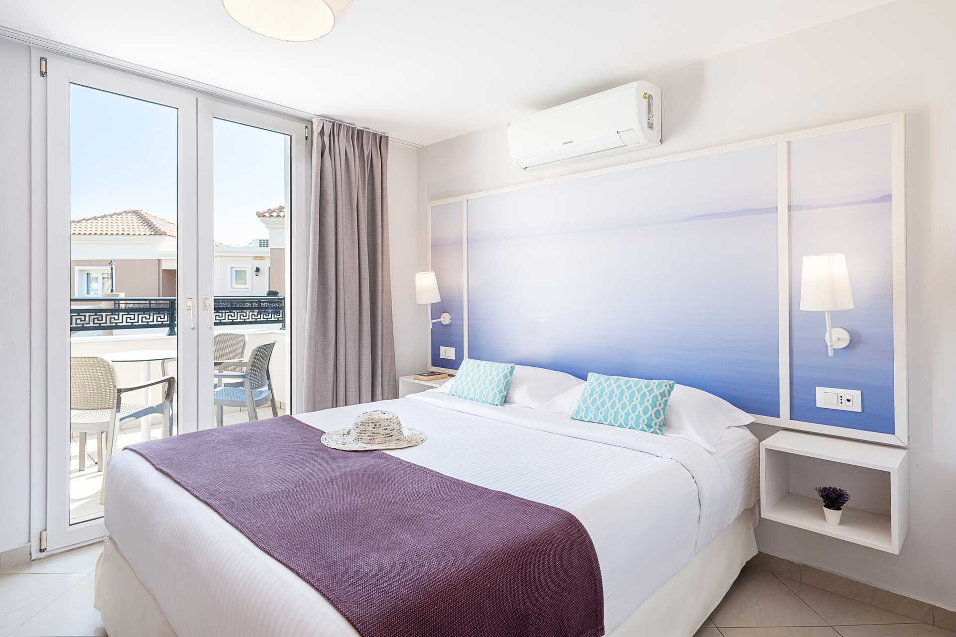 Kaksio parvekkeella, joista osasta on rajoitettu merinäköala tai merinäköala. Huoneistot sijaitsevat hotellin Aphrodite-osassa, lähempänä merta. Kolmen hengen huoneet ovat kooltaan n. 28-30 neliömetriä, neljän hengen huoneet noin 30-40 neliömetriä. Makuuhuone sekä yhdistetty olohuone ja minikeittiö. Parivuode. Lisävuodemahdollisuus vuodesohvaan. Minikeittiössä jääkaappi, keittolevyt, kahvinkeitin, vedenkeitin, leivänpaahdin ja yksinkertainen keittiövarustus. Maksuton wifi, ilmastointi ja tallelokero. Tv kansainvälisillä kanavilla. Hiustenkuivain. Kylpyhuoneessa suihku ja wc. Siivous 6 krt/viikko.
