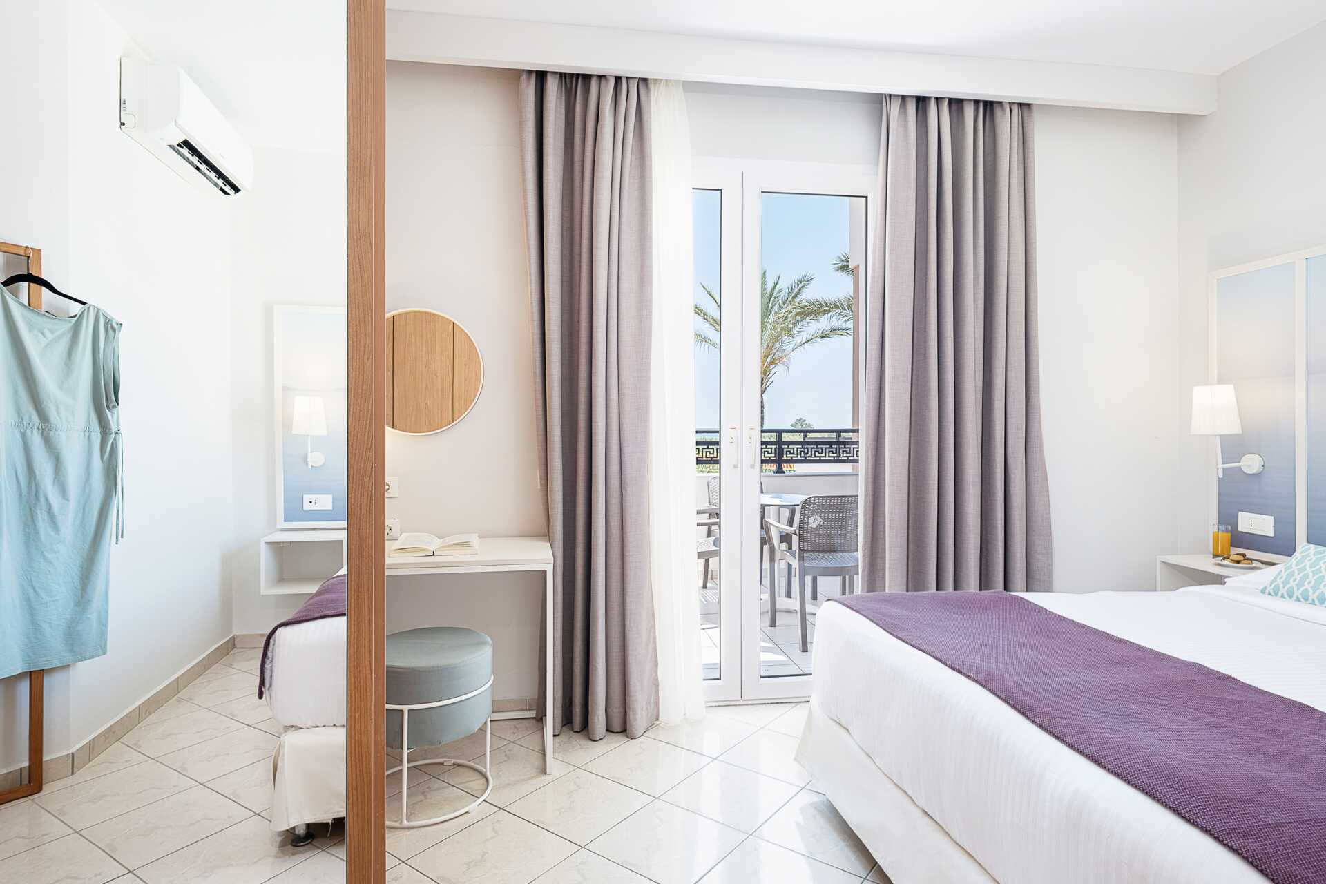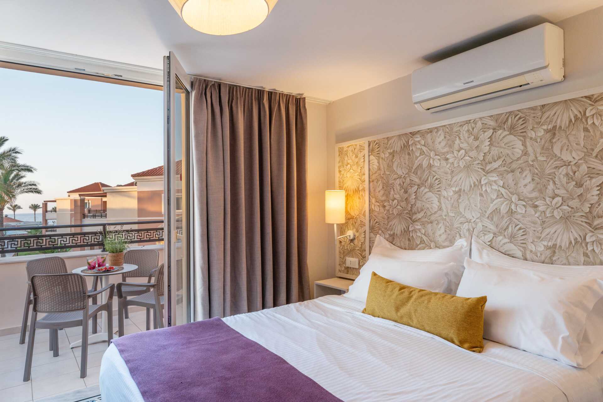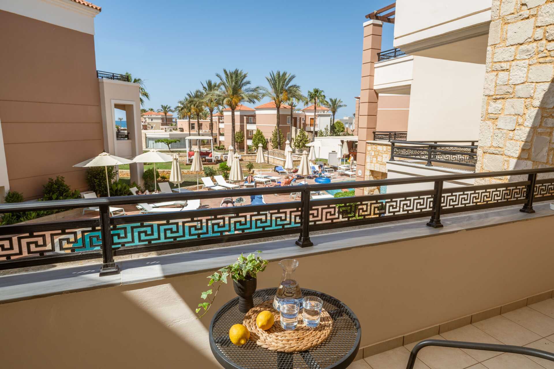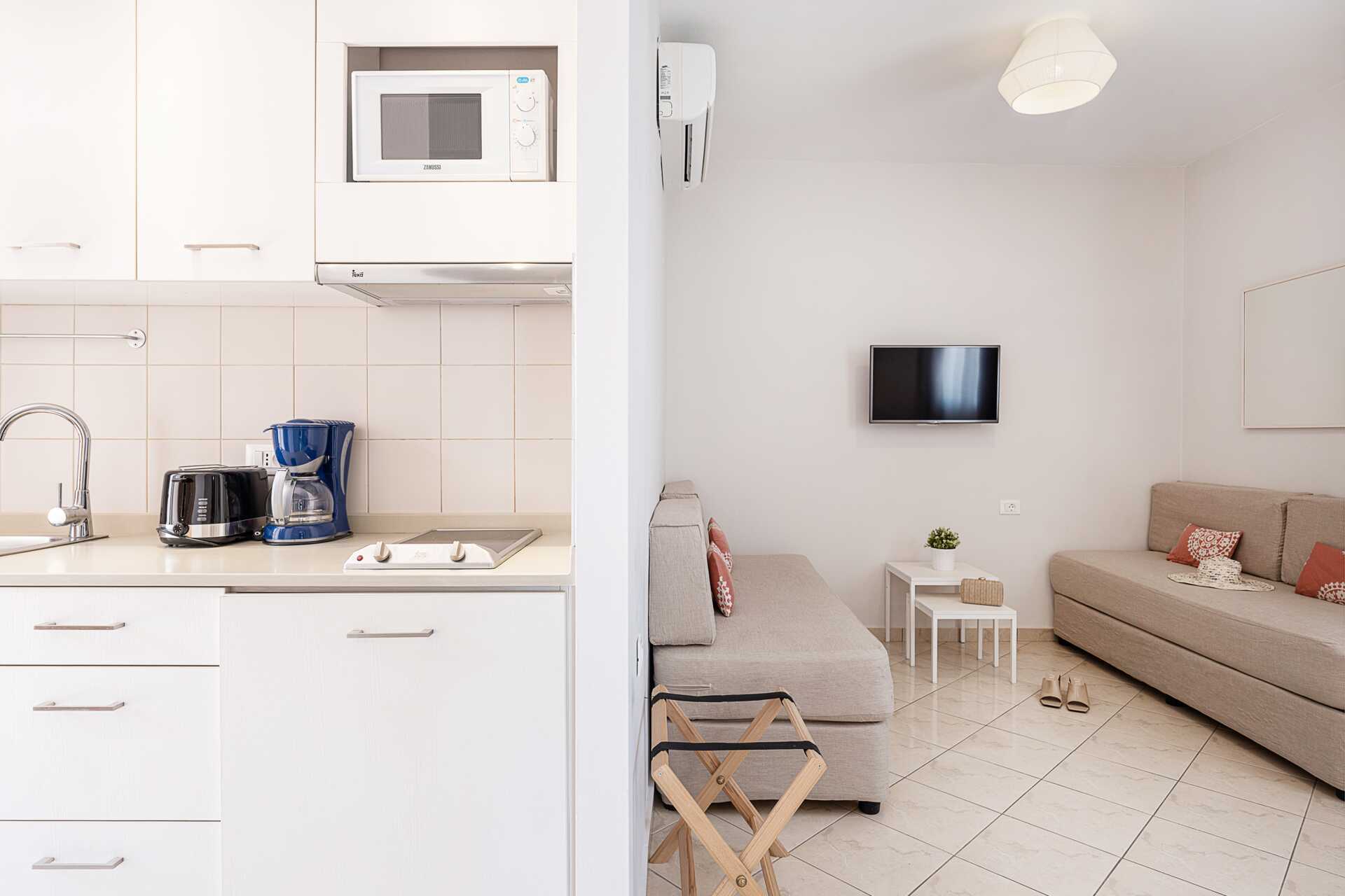 Kaksio parvekkeella, joista osasta on rajoitettu merinäköala tai merinäköala. Huoneistot sijaitsevat hotellin Aphrodite-osassa, lähempänä merta. Kolmen hengen huoneet ovat kooltaan n. 28-30 neliömetriä, neljän hengen huoneet noin 30-40 neliömetriä. Makuuhuone sekä yhdistetty olohuone ja minikeittiö. Parivuode. Lisävuodemahdollisuus vuodesohvaan. Minikeittiössä jääkaappi, keittolevyt, kahvinkeitin, vedenkeitin, leivänpaahdin ja yksinkertainen keittiövarustus. Maksuton wifi, ilmastointi ja tallelokero. Tv kansainvälisillä kanavilla. Hiustenkuivain. Kylpyhuoneessa suihku ja wc. Siivous 6 krt/viikko.
