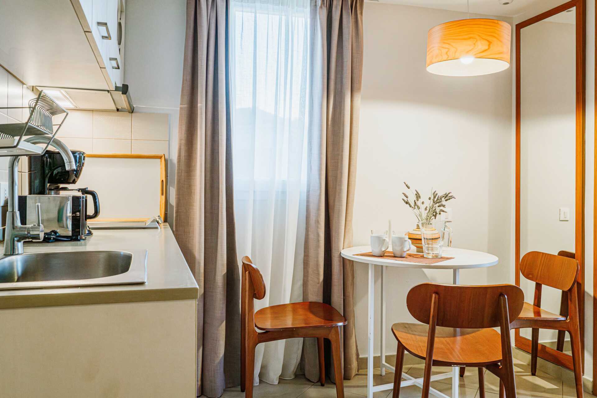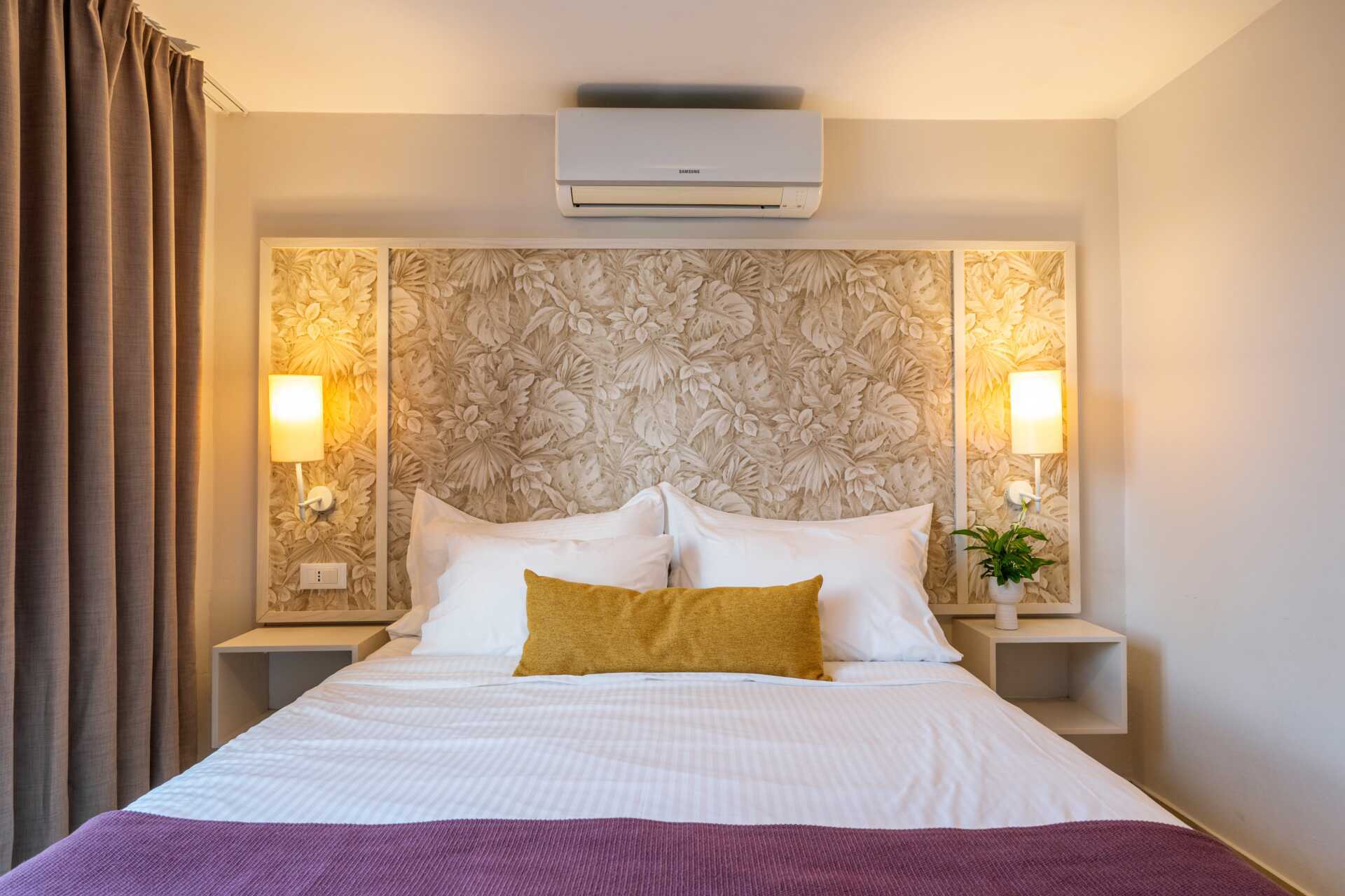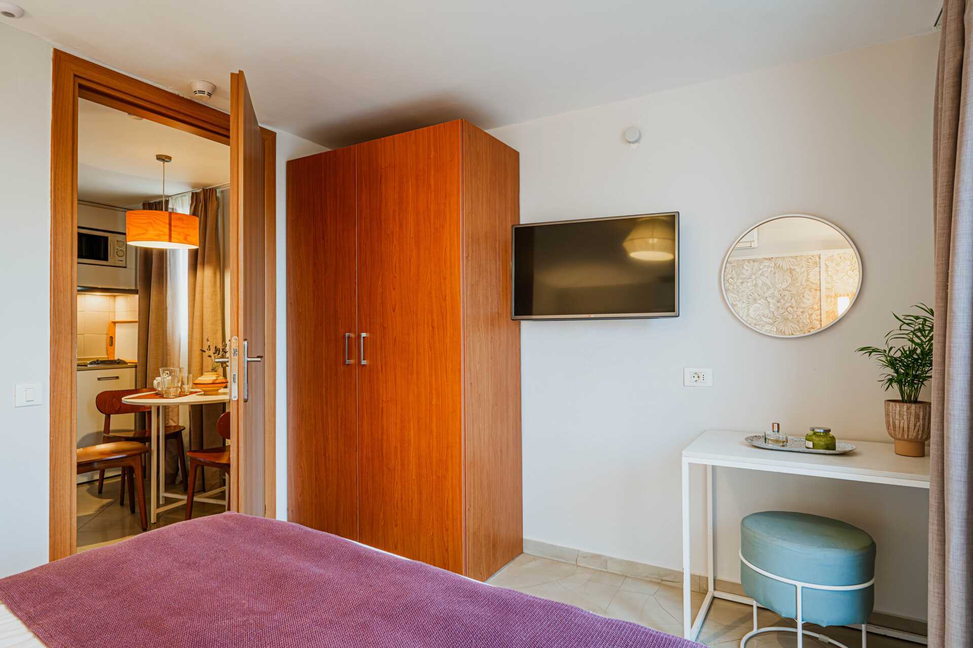Yhden huoneen huoneisto parvekkeella, joista osasta on näkymät uima-altaalle. Huoneistot sijaitsevat hotellin Olympus-osassa. Makuuhuone yhdistetty minikeittiöön. Parivuode. Lisävuodemahdollisuus vuodesohvaan. Minikeittiössä jääkaappi, keittolevyt, kahvinkeitin, vedenkeitin, leivänpaahdin ja yksinkertainen keittiövarustus. Maksuton wifi, ilmastointi ja tallelokero. Tv kansainvälisillä kanavilla. Hiustenkuivain. Kylpyhuoneessa suihku ja wc. Siivous 6 krt/viikko.