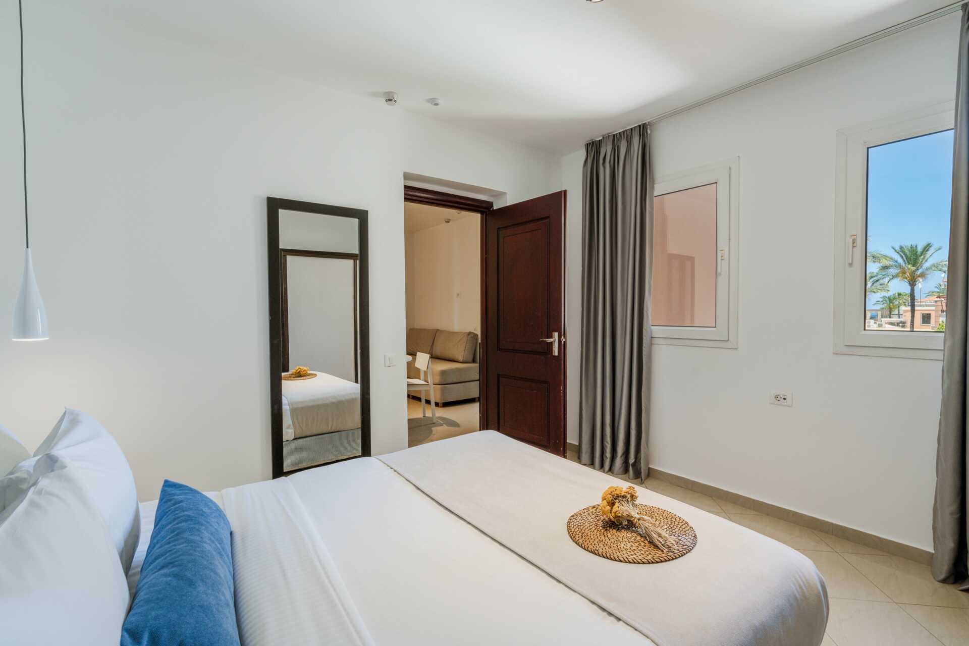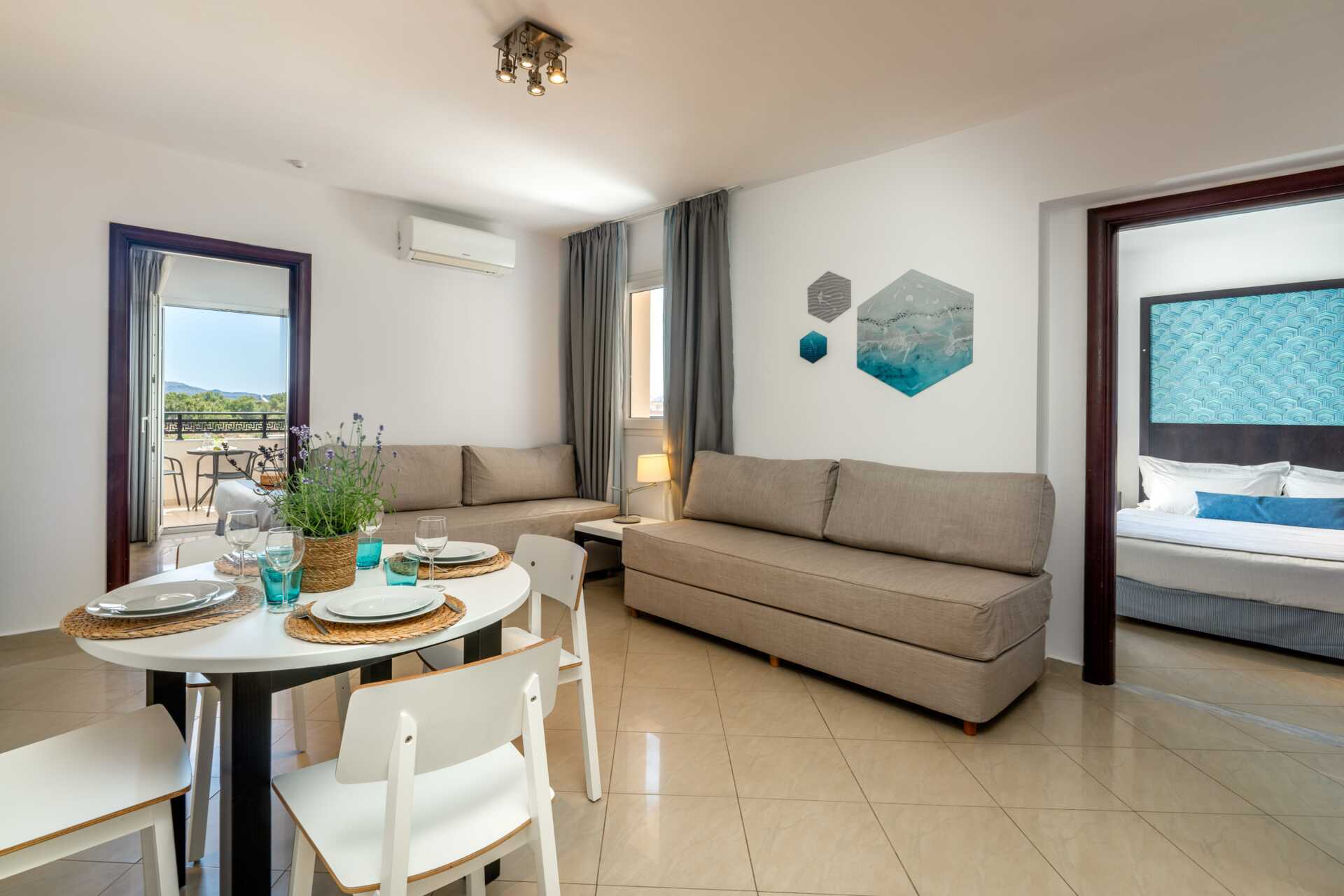 Kolmioita parvekkeella, joista osasta on merinäköala tai rajoitettu merinäköala. Huoneistot sijaitsevat hotellin Aphrodite-osassa, lähempänä merta. Kaksi makuuhuonetta sekä yhdistetty olohuone/minikeittiö. Parivuode kummassakin makuuhuoneessa. Lisävuodemahdollisuus vuodesohvasta. Minikeittiössä jääkaappi, keittolevyt, kahvinkeitin, leivänpaahdin ja yksinkertainen keittiövarustus. Maksuton wifi, ilmastointi ja tallelokero. Tv kansainvälisillä kanavilla. Hiustenkuivain. Kylpyhuoneessa suihku ja wc. Siivous 6 krt/viikko.