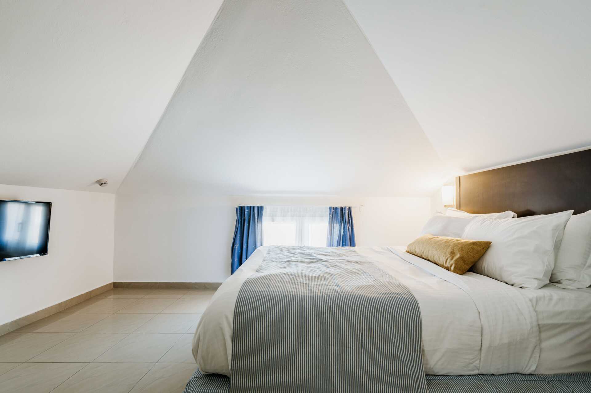Kaksikerroksinen kaksio parvekkeella tai terassilla. Tämä huoneistotyyppi löytyy sekä Olympuksen että Aphrodite-osan puolelta, lähempänä merta. Pohjakerroksessa on minikeittiö ja makuuhuone parivuoteella. Yläkerrassa on mahdollisuus lisävuoteisiin makuuparven vuodesohviin. Minikeittiössä jääkaappi, keittolevyt, kahvinkeitin, vedenkeitin, leivänpaahdin ja yksinkertainen keittiövarustus. Maksuton wifi, ilmastointi ja tallelokero. Tv kansainvälisillä kanavilla. Hiustenkuivain. Kylpyhuoneessa suihku ja wc. Siivous 6 krt/viikko.