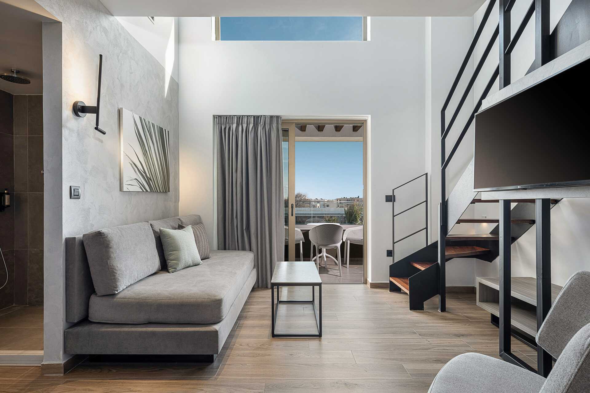 Kaksikerroksinen juniorsviitti. Parveke rajoitetulla merinäköalalla. Alakerrassa on olohuone ja kylpyhuone, yläkerrassa parivuode tai kaksi yhden hengen vuodella. Avoin pohjaratkaisu kerrosten välissä. Lisävuodemahdollisuus vuodesohvasta. Maksuton wifi, ilmastointi ja tallelokero. Jääkaappi. Tv kansainvälisillä kanavilla. Kylpytakki ja tossut. Suihku ja wc. Siivous 7 krt/viikko.