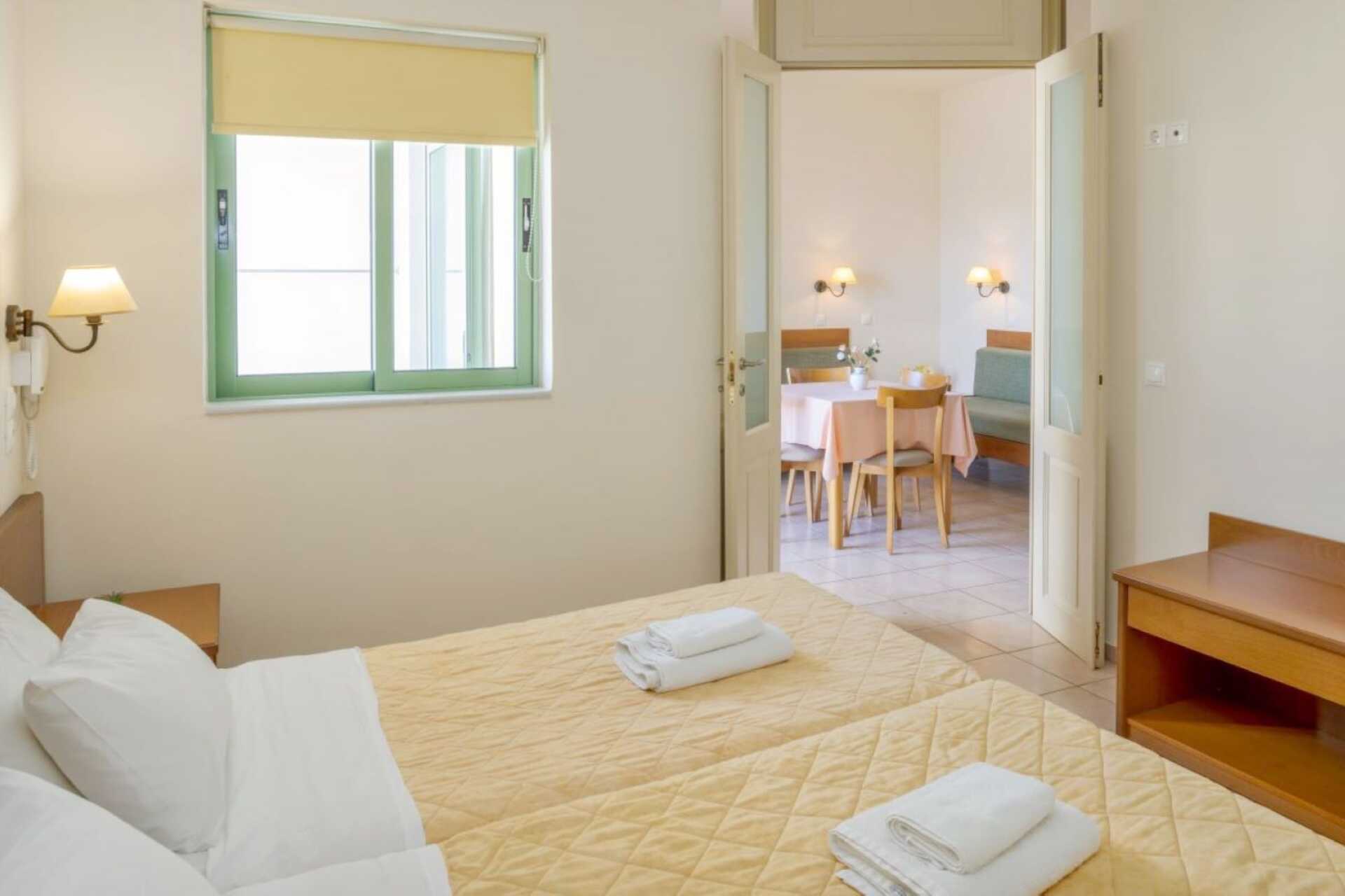 Kaksio parvekkeella. Yhdistetty makuuhuone ja olohuone. Parivuode. Mahdollisuus kahdelle lisävuoteelle kahdessa seinään kiinnitetyssä vuodesohvassa. Minikeittiössä on keittolevyt, jääkaappi ja yksinkertainen keittiövarustus. Maksuton wifi. Ilmastointi ja tallelokero lisämaksusta. Tv kansainvälisillä kanavilla. Hiustenkuivain. Kylpyamme tai suihku ja wc. Siivous 3 krt/viikko.