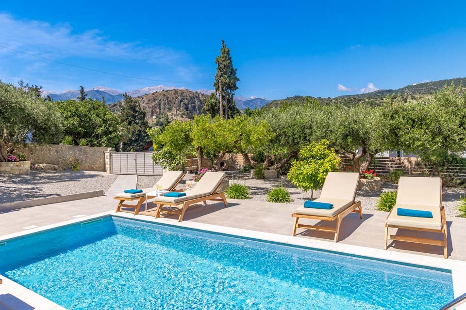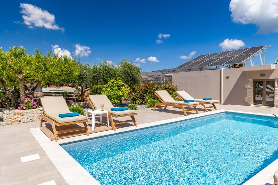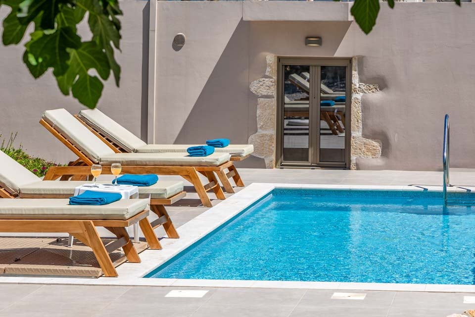 Kun haluat aloittaa lomasi oikein, ei ole parempaa paikkaa kuin oma uima-allas. Anna kaikkien huoliesi huuhtoutua pois kirkkaan siniseen veteen ja tunne paahtavan Kreetan auringon paisteen yllesi. On helppo päästää irti kaikista arjen stressistä, kun otat aurinkoa tässä vesiparatiisissa. Vietä iltapäivien ajan yhdessäoloa läheistesi kanssa. Kun kerran pidätte hauskaa auringon alla, tunnit hupenevat nopeasti! Pidä silmällä kaikkia vesileikkejä rannan turvasta käsin uima-altaan aurinkotuoleilla – täydellinen paikka ruskettumiseen ja lomahehkun luomiseen, joka tekee kaikki kotona kateellisiksi. Yhdistä tämä runsaisiin kuviin, joissa rentoudut uima-altaalla, ja he pyytävät mukaan seuraavalle huvilalomallesi!
