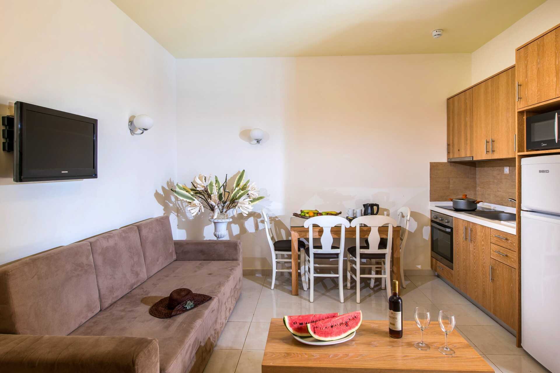 Kaksio parvekkeella tai terassilla. Makuuhuone sekä yhdistetty olohuone ja minikeittiö. Kaksi yhden hengen sänkyä. Lisävuodemahdollisuus kahteen vuodesohvaan. Minikeittiö, jossa keittolevyt, jääkaappi ja pakastin, vedenkeitin, mikroaaltouuni ja peruskeittiövälineet. Maksuton wifi. Ilmastointi ja tallelokero lisämaksusta. Tv kansainvälisillä kanavilla. Hiustenkuivain. Kylpyamme tai suihku ja wc. Siivous 2 krt/viikko.