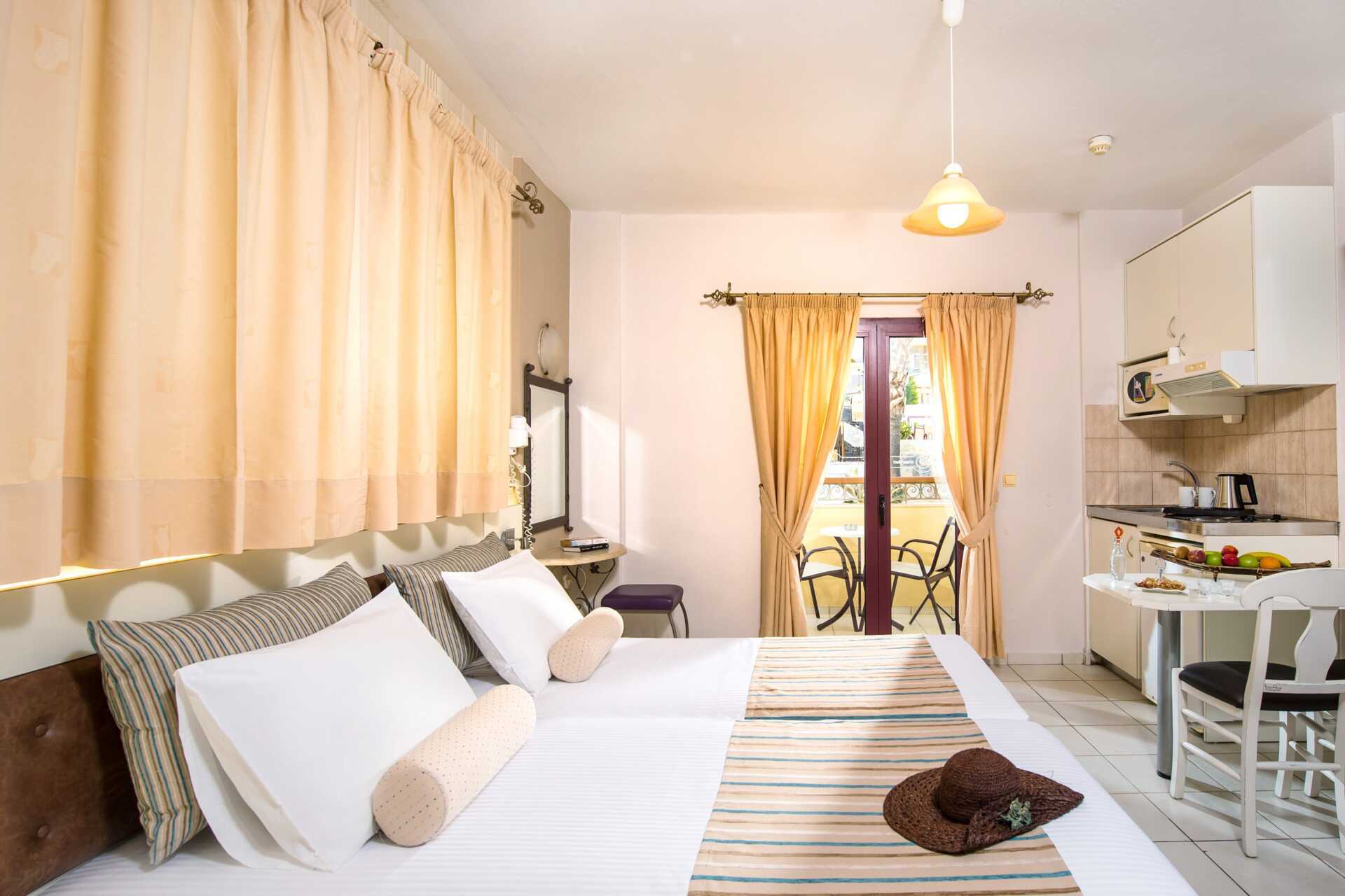 Yksiö, parvekkeella tai terassilla. Yhdistetty makuuhuone ja minikeittiö. Parivuode tai kaksi yhden hengen sänkyä. Mahdollisuus lisävuoteeseen nojatuolissa tai kokoontaitettavassa sängyssä. Minikeittiö, jossa keittolevyt, jääkaappi, mikroaaltouuni, vedenkeitin ja peruskeittiövälineet. Maksuton wifi. Ilmastointi ja tallelokero lisämaksusta. Tv kansainvälisillä kanavilla. Hiustenkuivain. Kylpyhuoneessa suihku ja wc. Siivous 2 krt/viikko.
