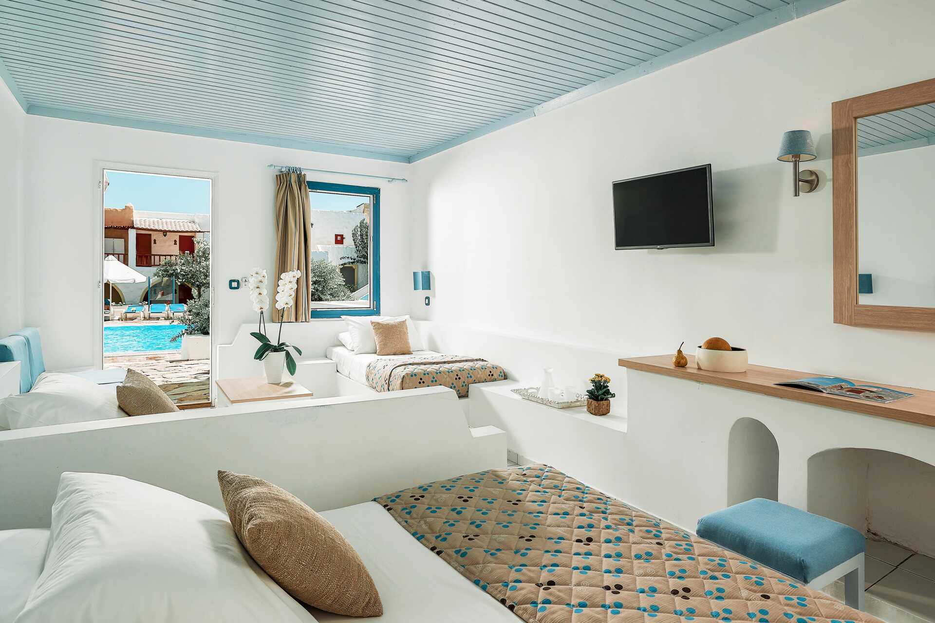 Perhehuone, jossa on parveke tai terassi, osassa merinäköala. Parivuode tai kaksi yhden hengen vuodetta. Lisävuodemahdollisuus kahdesta vuodesohvasta. Maksuton wifi, ilmastointi ja tallelokero. Minibaari, täytetään joka toinen päivä. Vedenkeitin, kahvia ja teetä. Tv kansainvälisillä kanavilla. Hiustenkuivain. Kylpyamme ja wc. Siivous 7 krt/viikko. Alle 2-vuotiaat lapset katsotaan lisävuoteessa majoittuviksi henkilöiksi.