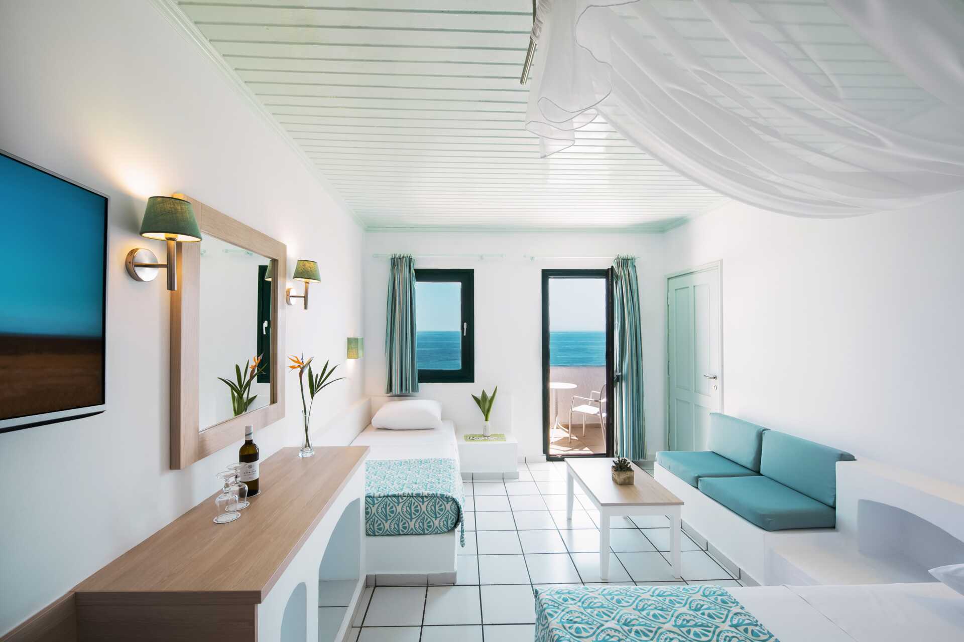Bungalow Seafront, jossa parveke tai terassi merinäköalalla. Huoneet sijaitsevat ensimmäisessä kerroksessa merelle päin. Yksi parivuode tai kaksi erillistä vuodetta. Lisävuodemahdollisuus vuodesohvasta. Maksuton wifi, ilmastointi ja tallelokero. Minibaari sisältyy hintaan ja täytetään joka toinen päivä. Vedenkeitin, kahvia ja teetä. Tv kansainvälisillä kanavilla. Hiustenkuivain. Kylpyhuoneessa amme ja wc. Siivous 7 krt/viikko. Alle 2-vuotiaat lapset lasketaan lisävuoteella majoittuviksi henkilöiksi.
