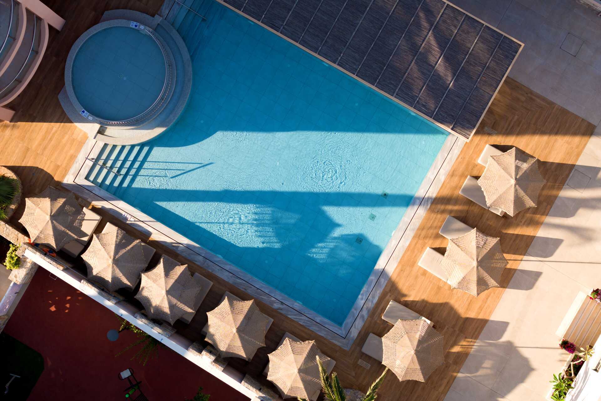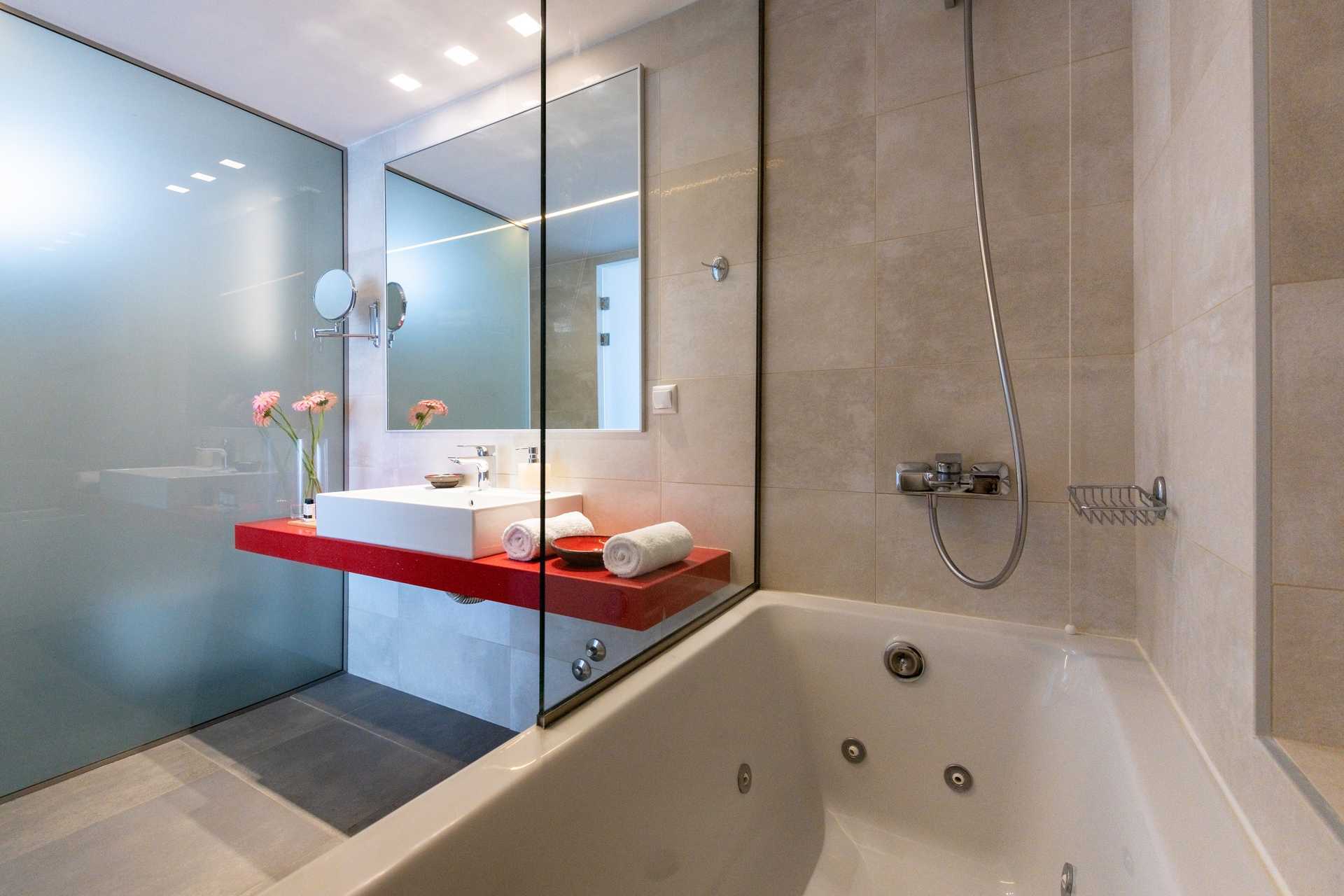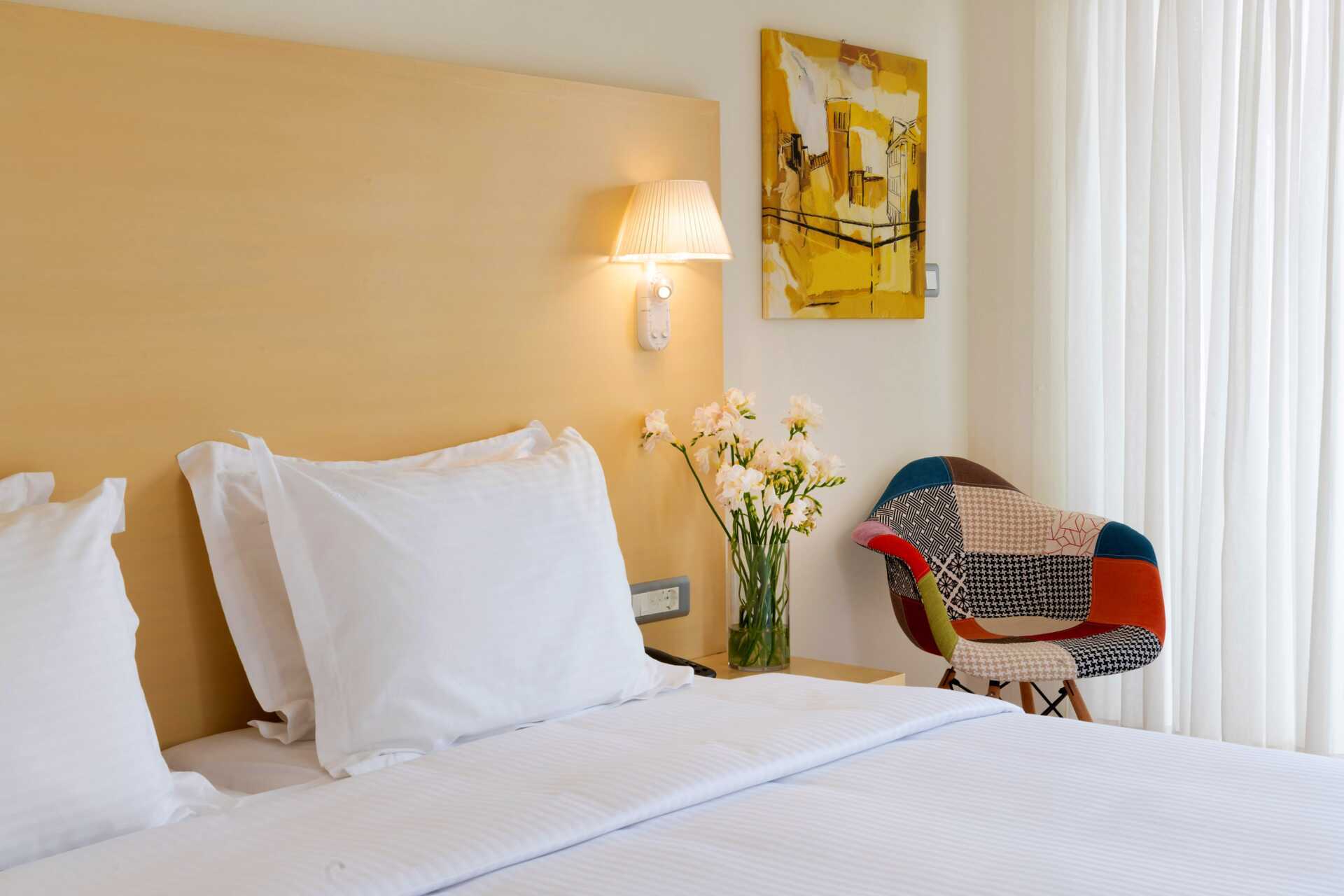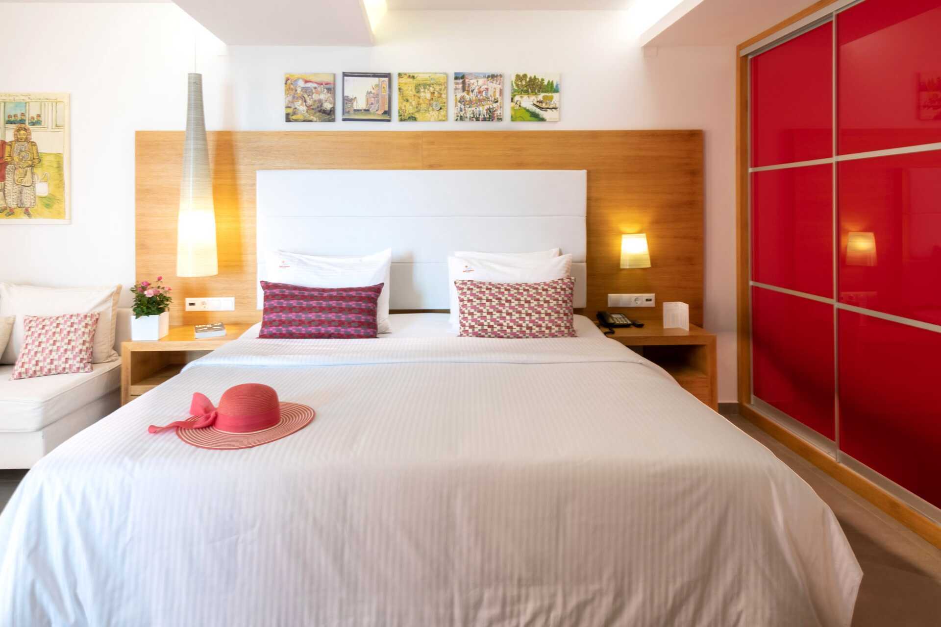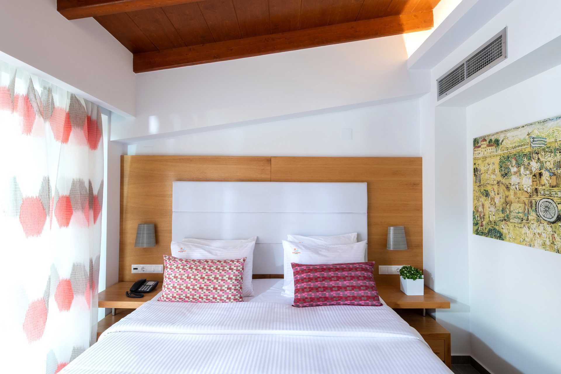 Kahden hengen huone parvekkeella tai terassilla. Parivuode tai kaksi yhden hengen sänkyä. Maksuton wifi, tallelokero ja ilmastointi. Jääkaappi – vesipullo sisältyy hintaan ja täytetään päivittäin. Vedenkeitin, kahvia ja teetä. Nespresso-kahvinkeitin - kapselit maksutta. Tv kansainvälisillä kanavilla. Hiustenkuivain. Kylpyamme tai suihku ja wc. Siivous 7 krt/viikko. Alle 2-vuotiaat lapset lasketaan lisävuoteella majoittuviksi henkilöiksi.