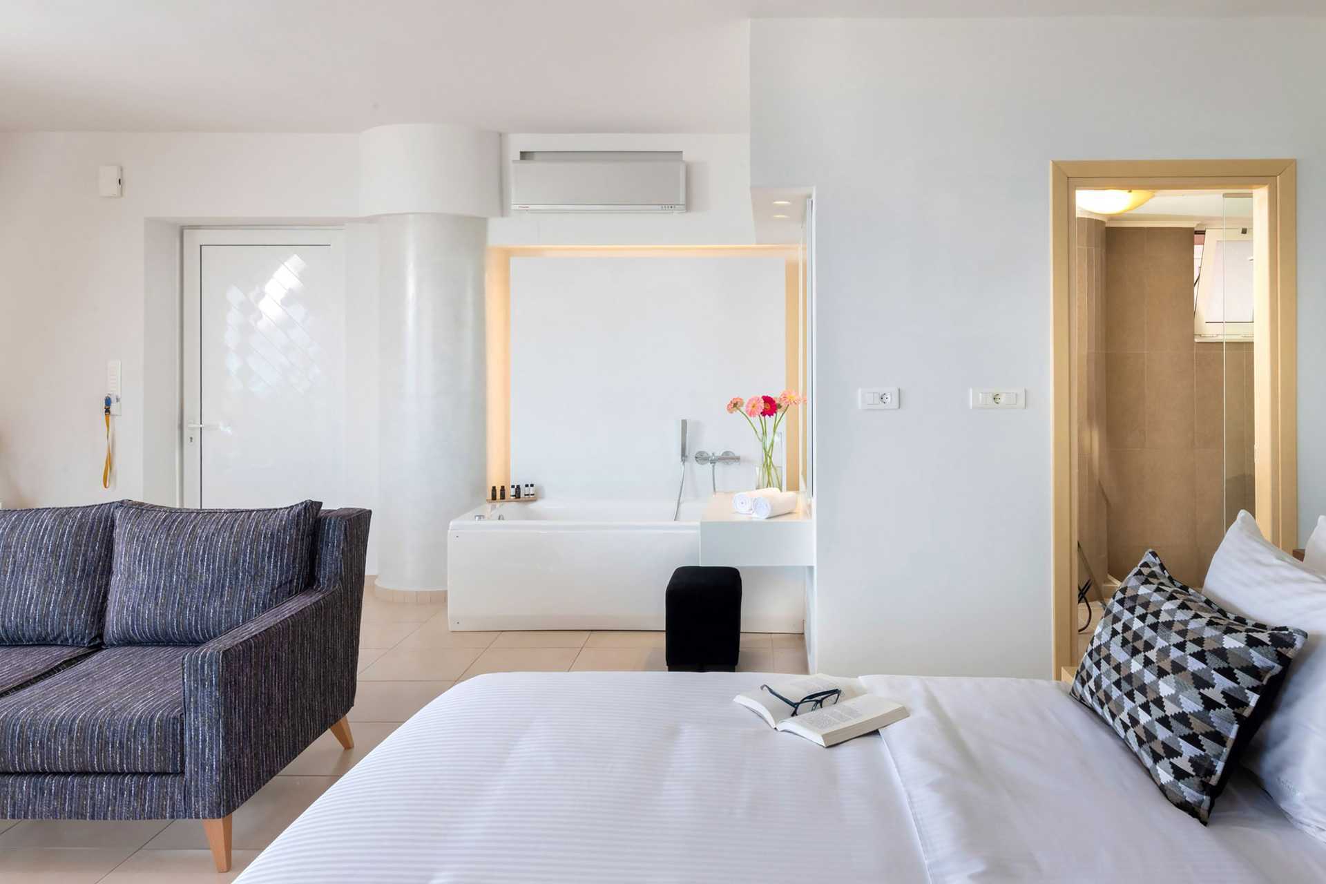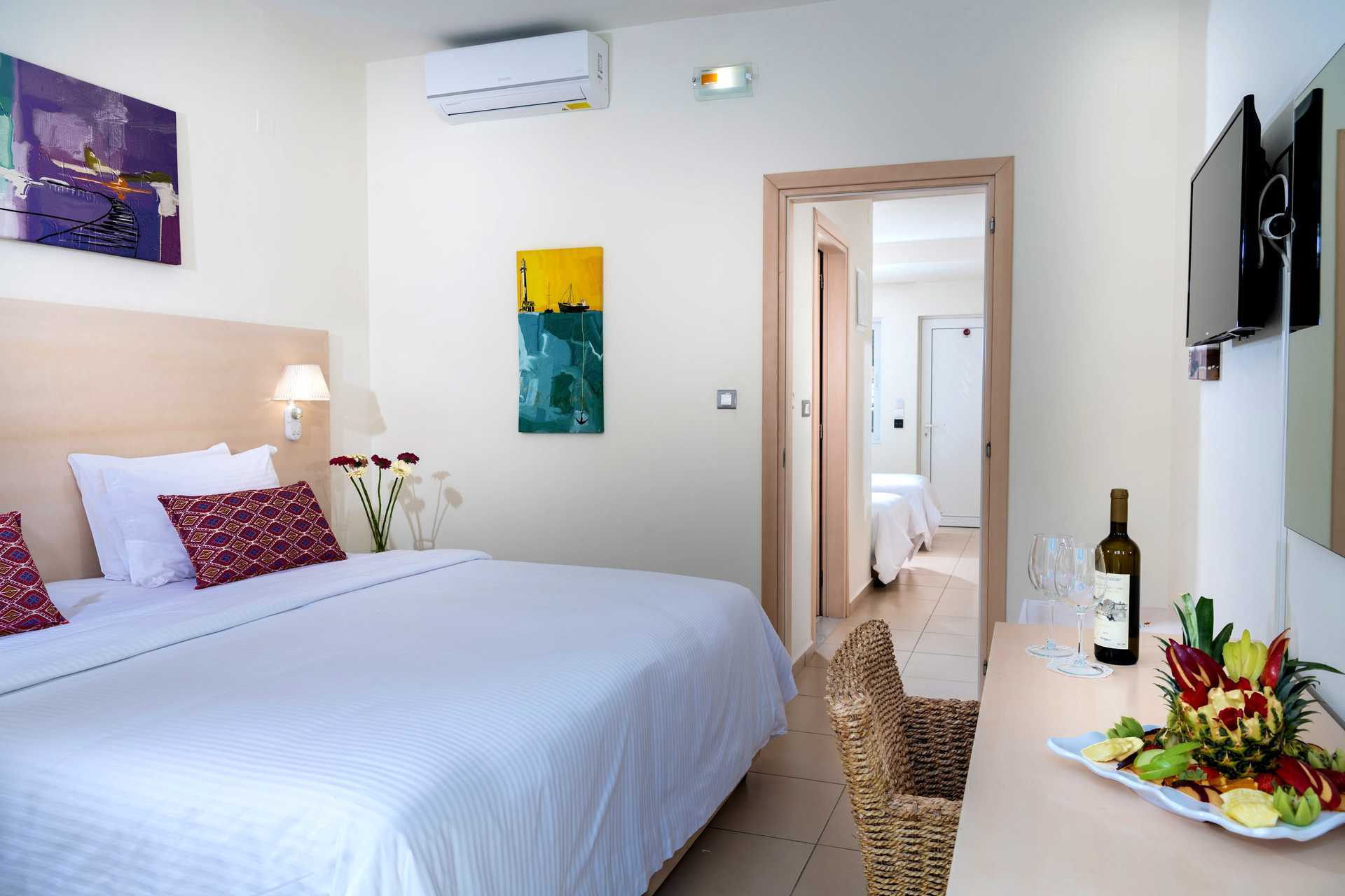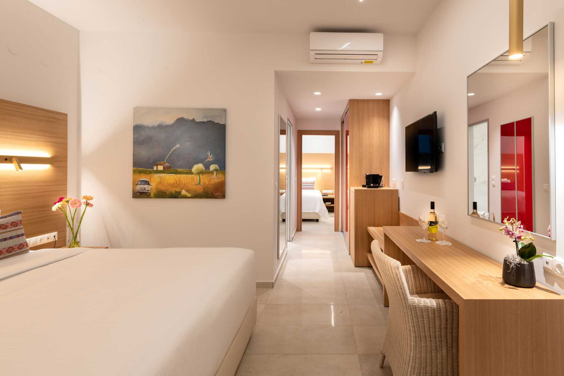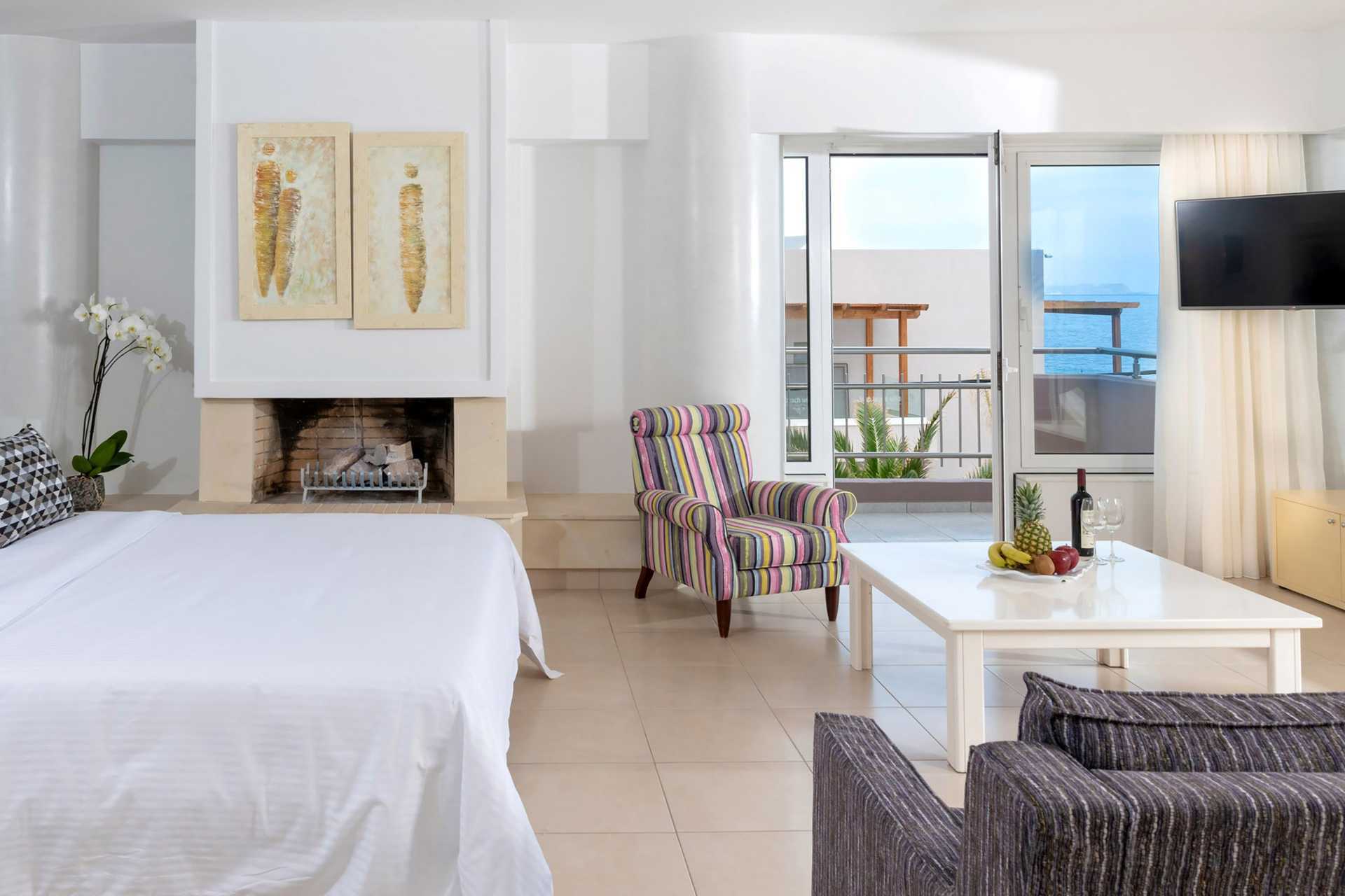 Sviitti, parvekkeella tai terassilla ja merinäköalalla. Parivuode. Lisävuodemahdollisuus vuodesohvasta. Maksuton wifi, tallelokero ja ilmastointi. Jääkaappi – vesipullo sisältyy hintaan ja täytetään päivittäin. Vedenkeitin, kahvia ja teetä. Nespresso-kahvinkeitin - kapselit maksutta. Saapuessasi huoneessa on pullo kreetalaista viiniä, virvoitusjuomia, hedelmiä ja välipaloja. Tv kansainvälisillä kanavilla. Kylpytakit ja tossut. Kylpyhuoneessa kylpyamme, erillinen suihku ja wc. Siivous 7 krt/viikko. Rannalle varattu aurinkovarjo ja kaksi aurinkotuolia.