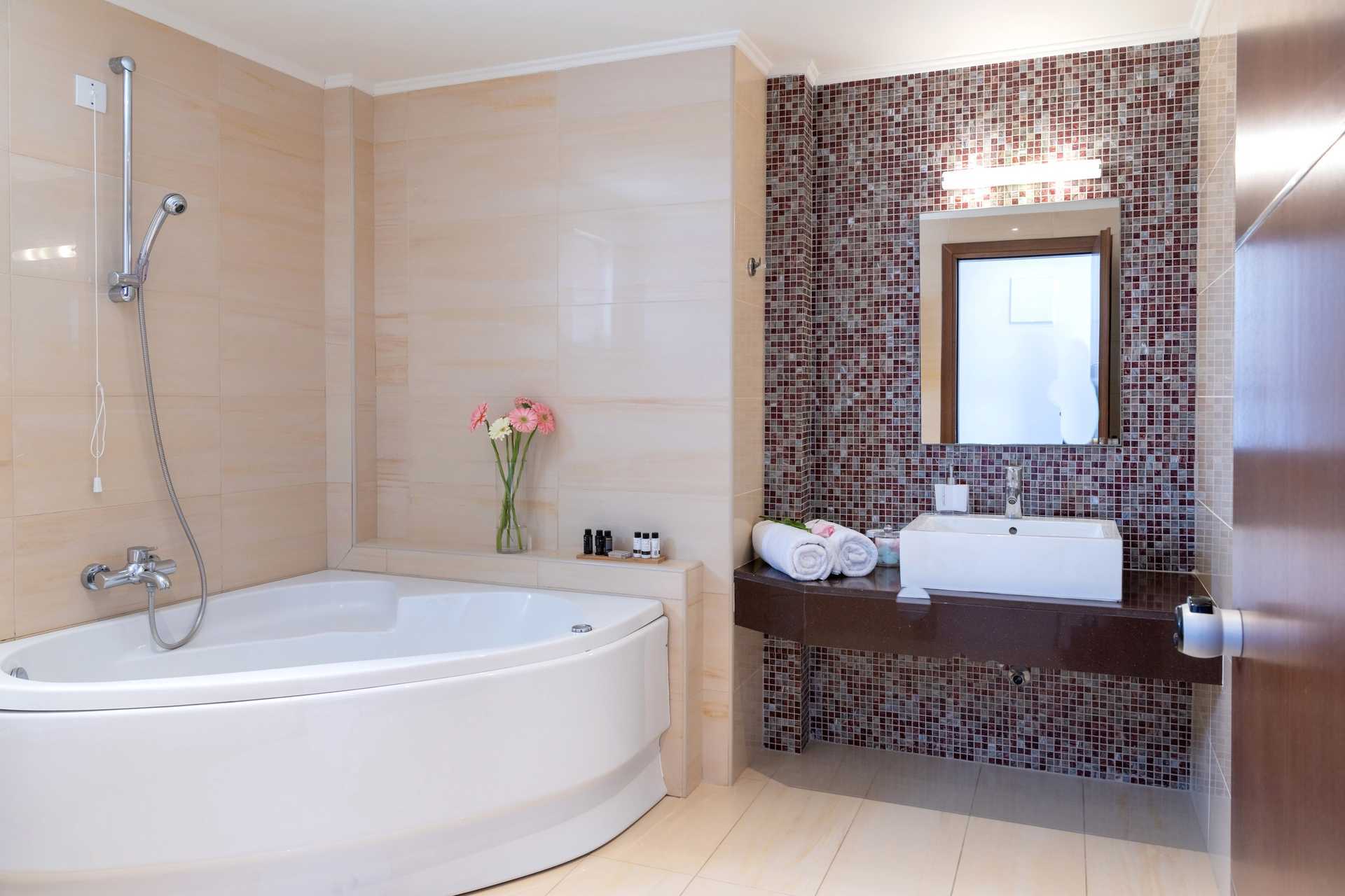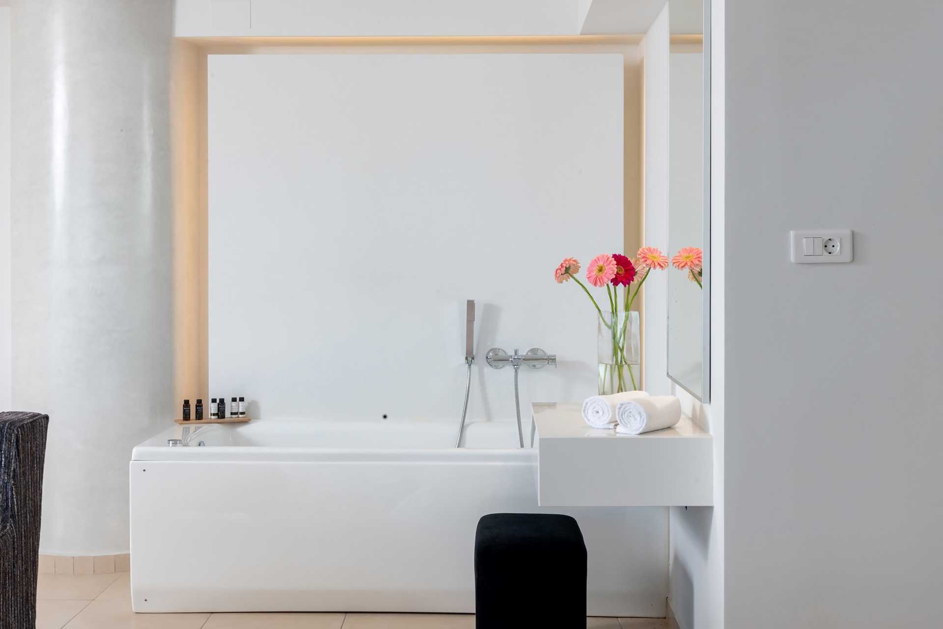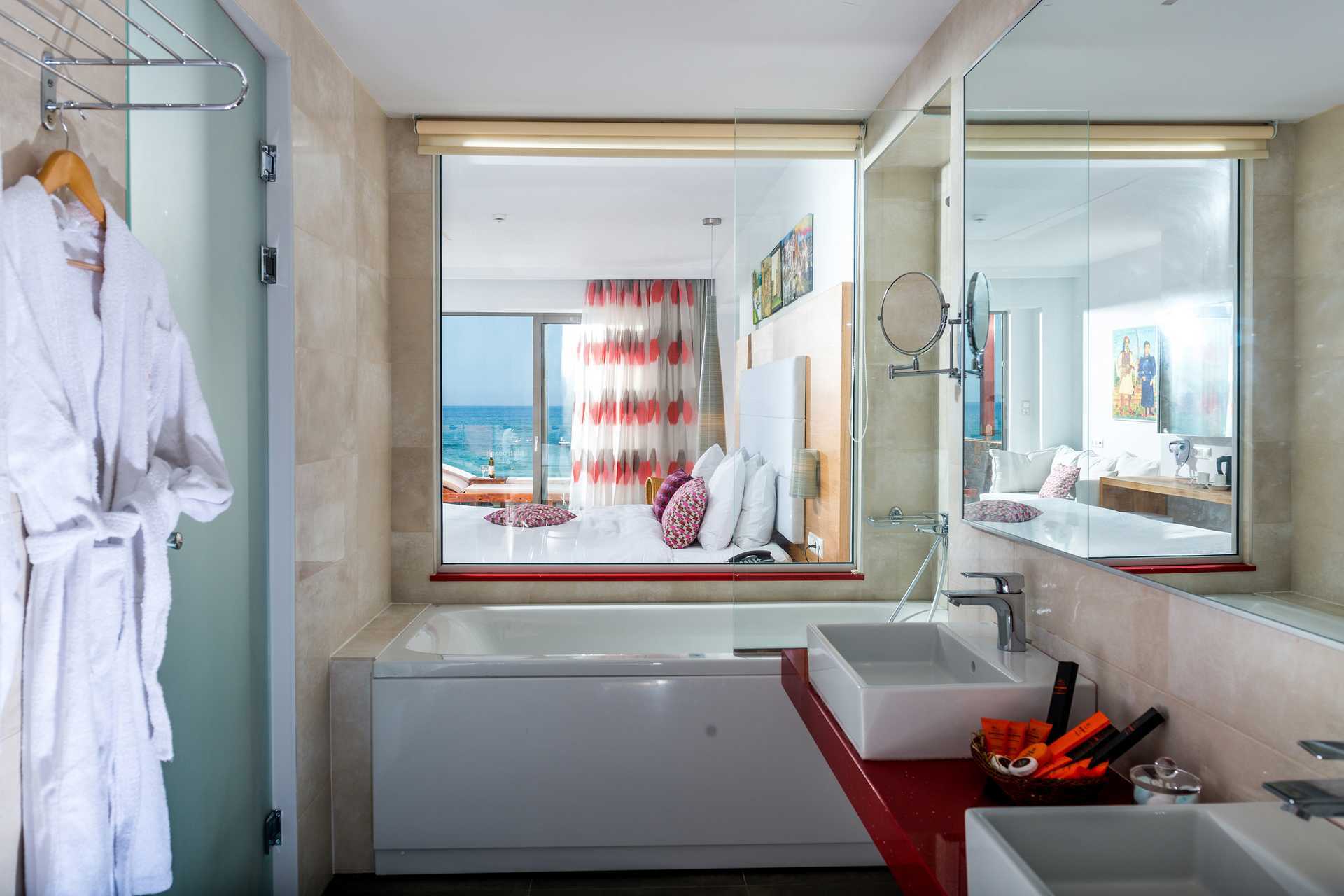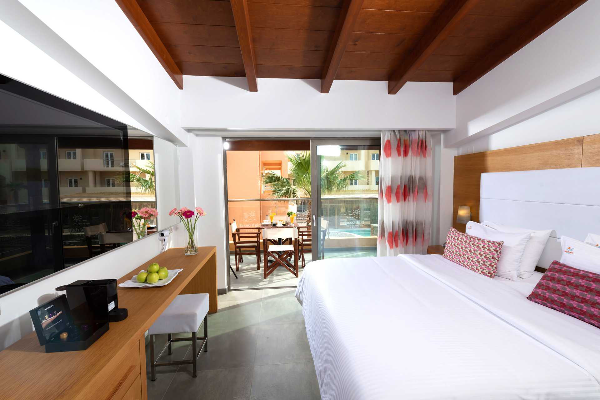 Sviitti, parvekkeella tai terassilla ja merinäköalalla. Parivuode. Lisävuodemahdollisuus vuodesohvasta. Maksuton wifi, tallelokero ja ilmastointi. Jääkaappi – vesipullo sisältyy hintaan ja täytetään päivittäin. Vedenkeitin, kahvia ja teetä. Nespresso-kahvinkeitin - kapselit maksutta. Saapuessasi huoneessa on pullo kreetalaista viiniä, virvoitusjuomia, hedelmiä ja välipaloja. Tv kansainvälisillä kanavilla. Kylpytakit ja tossut. Kylpyhuoneessa kylpyamme, erillinen suihku ja wc. Siivous 7 krt/viikko. Rannalle varattu aurinkovarjo ja kaksi aurinkotuolia.