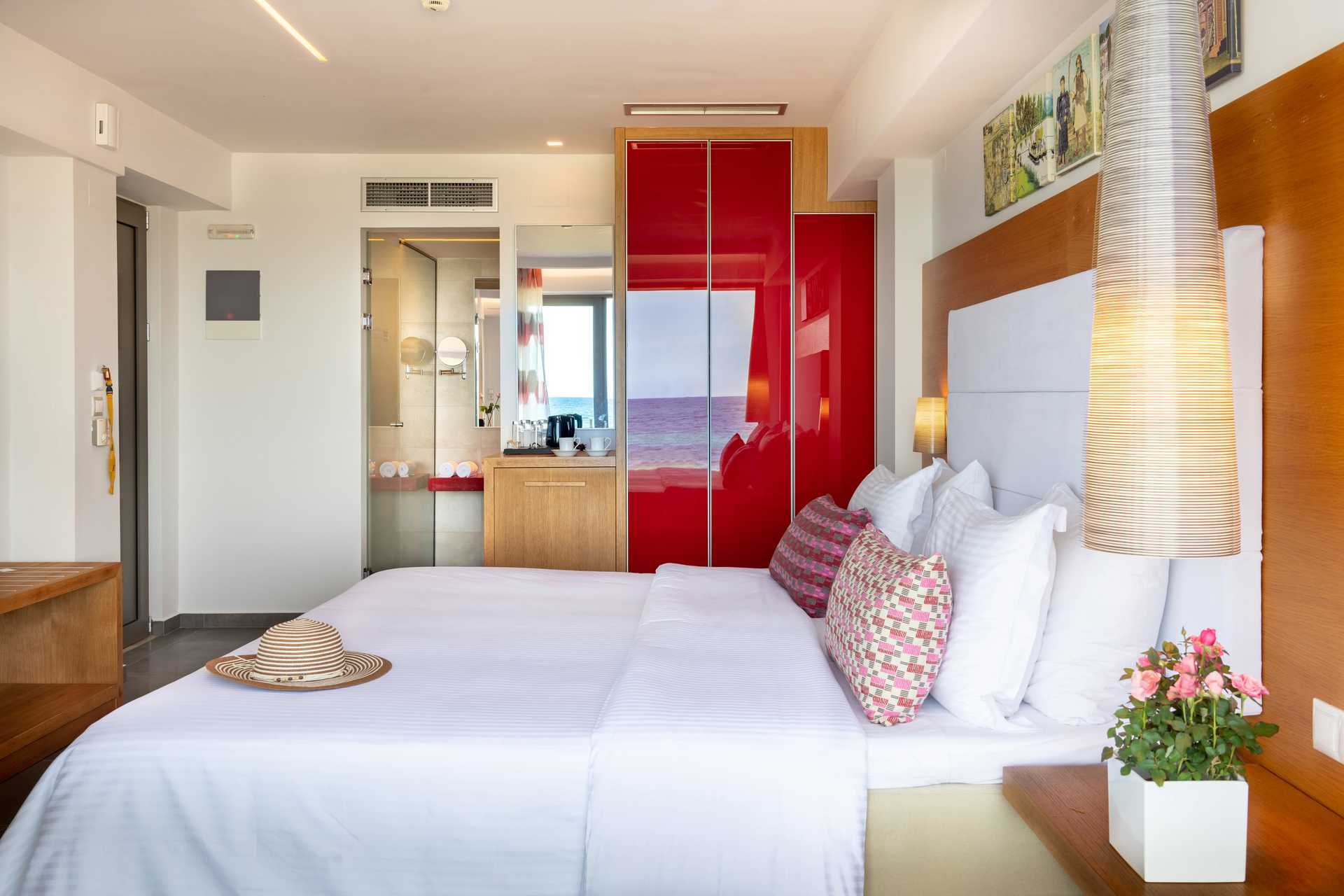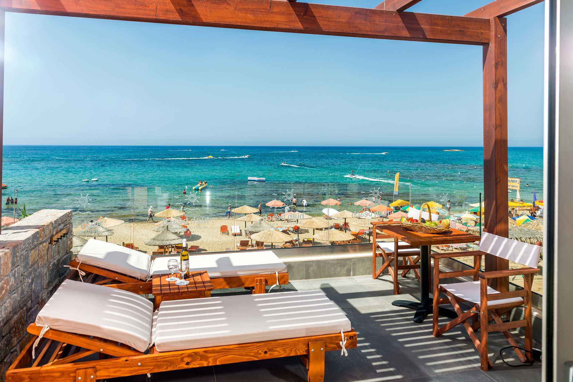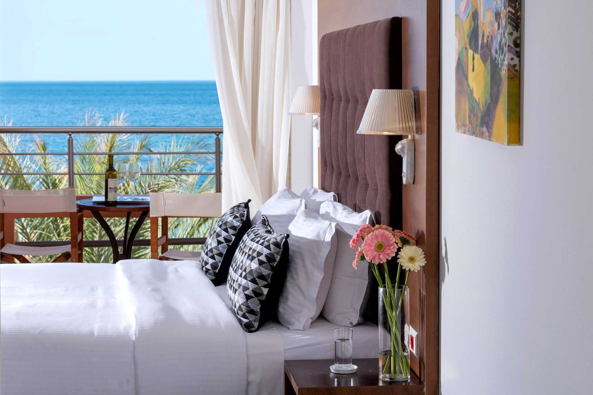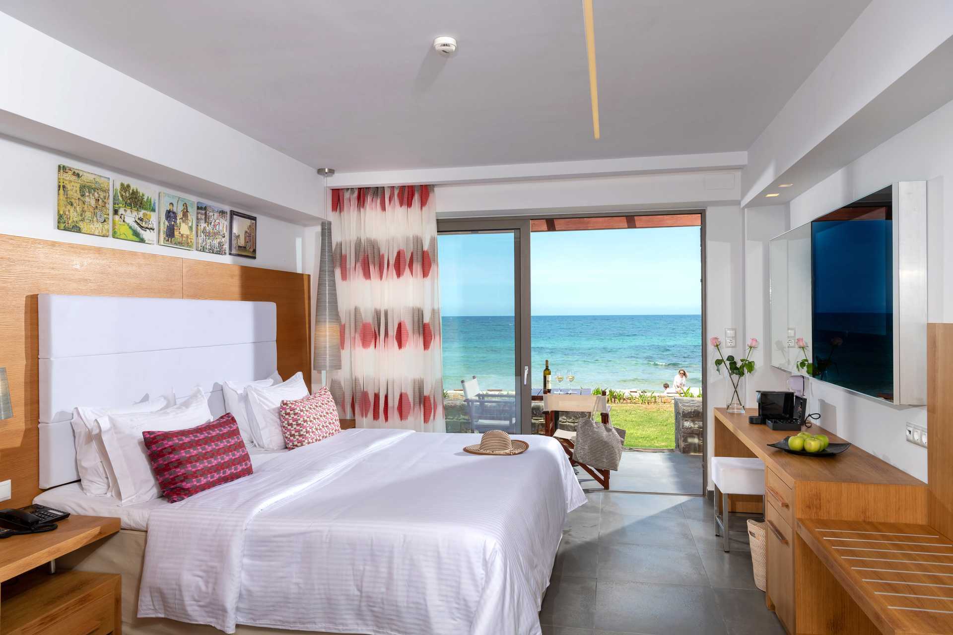 Deluxe juniorsviitit, parveke tai terassi ja merinäköala. Rannalla on varattu aurinkovarjo ja kaksi aurinkotuolia. Parivuode. Lisävuodemahdollisuus vuodesohvaan kolmen hengen huoneessa. Maksuton wifi, tallelokero ja ilmastointi. Jääkaappi – vesipullo sisältyy hintaan ja täytetään päivittäin. Vedenkeitin, kahvia ja teetä. Nespresso-kahvinkeitin - kapselit maksutta. Saapuessasi huoneessa on pullo kreetalaista viiniä, virvoitusjuomia ja hedelmiä. Tv kansainvälisillä kanavilla. Kylpytakit ja tossut. Kylpyamme tai suihku ja wc. Siivous 7 krt/viikko. Alle 2-vuotiaat lapset lasketaan lisävuoteella majoittuviksi henkilöiksi.