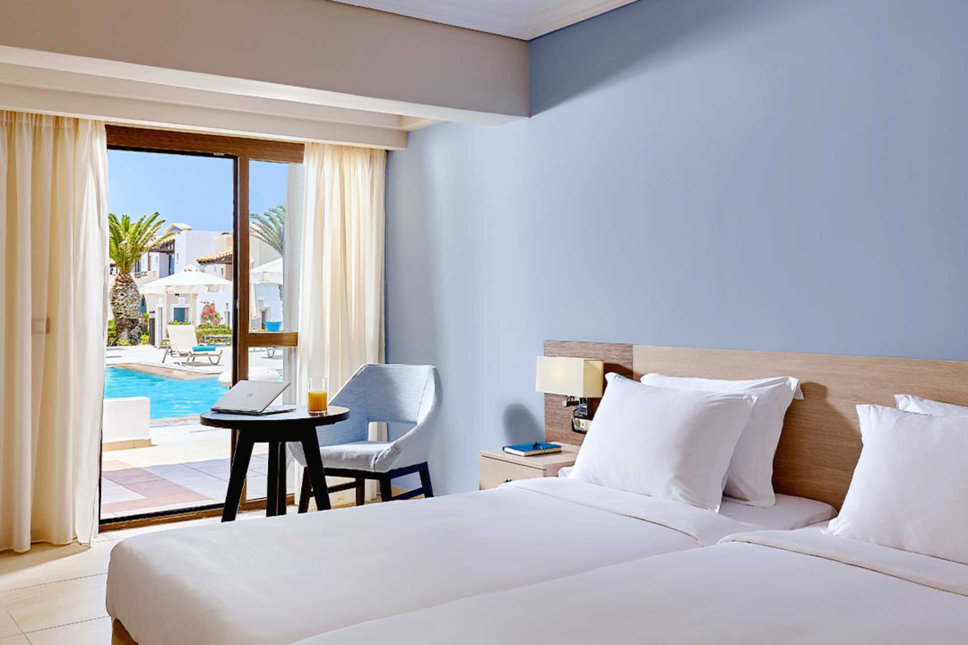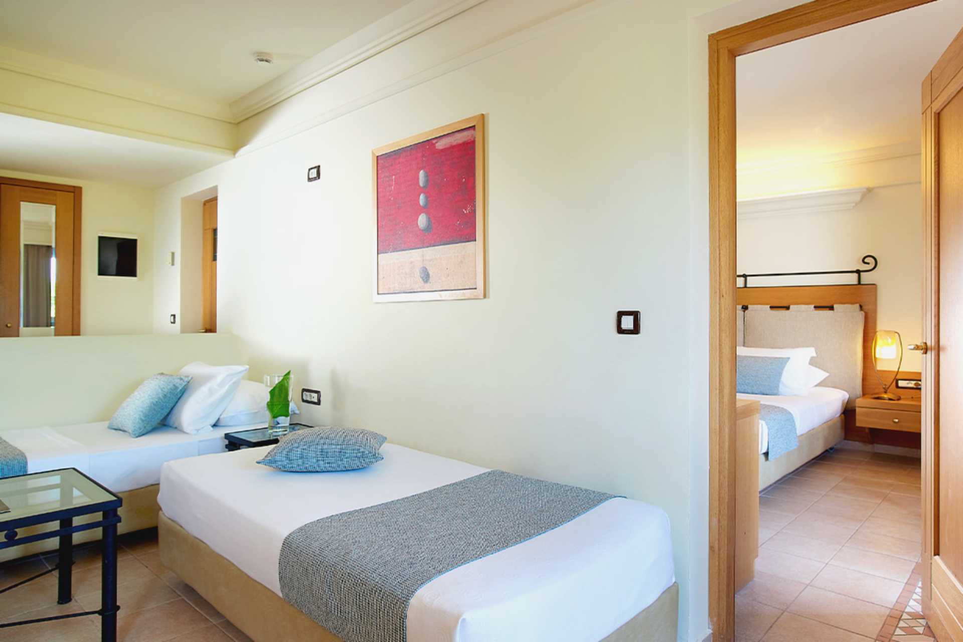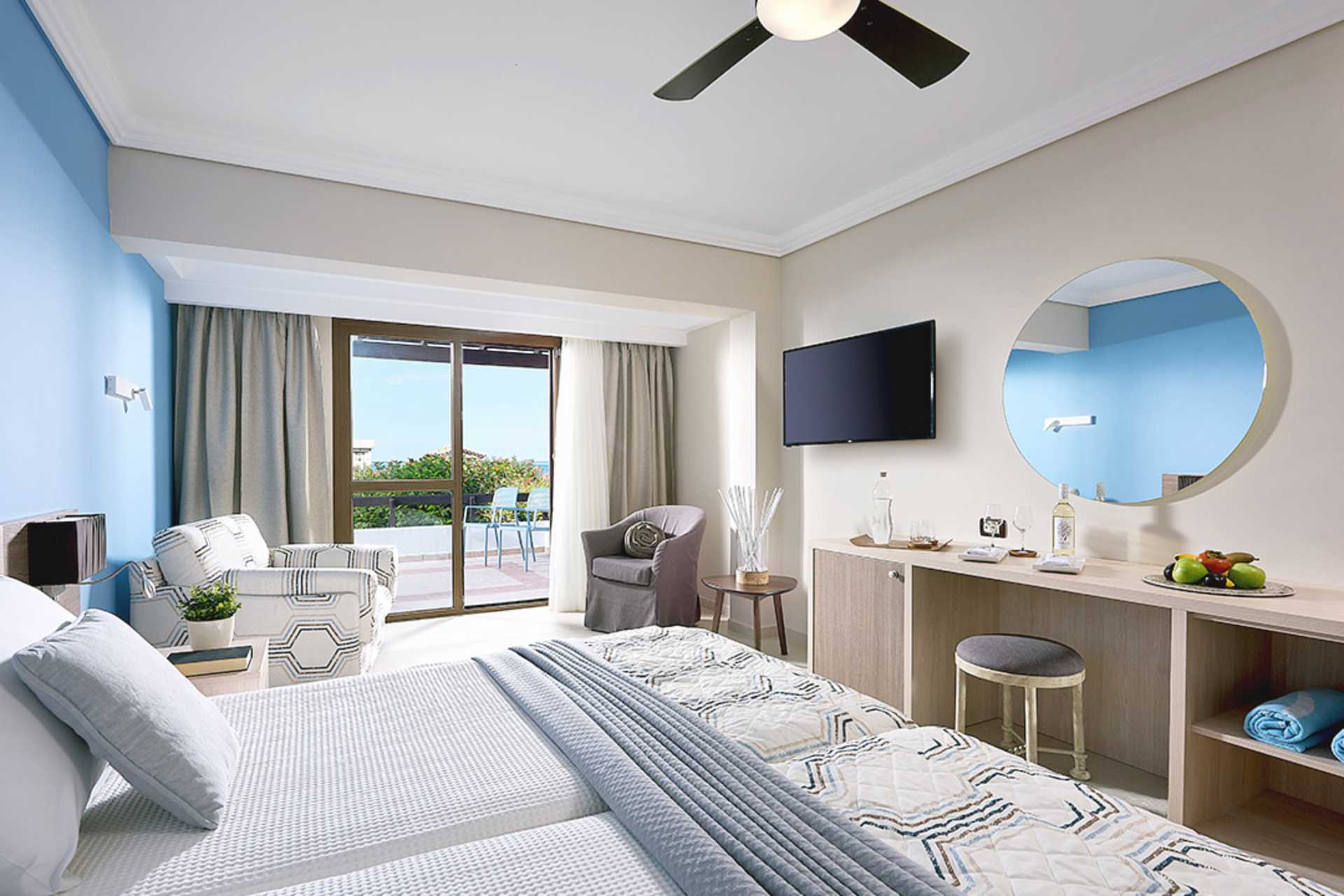 Superior-huone, jossa on terassi merelle ja yhteiselle uima-altaalle päin. Huoneet sijaitsevat merenrantaa lähimpänä olevissa rakennuksissa. Kaksi yhden hengen sänkyä. Lisävuodemahdollisuus vuodesohvasta. Maksuton wifi, ilmastointi ja tallelokero. Jääkaappi. Vedenkeitin, kahvia ja teetä. Tervetuliaispaketti, joka sisältää vettä ja alkoholitonta viiniä saapuessasi. Tv kansainvälisillä kanavilla. Hiustenkuivain. Kylpytakit, tossut sekä allas- ja rantapyyhkeet. Suihku ja wc. Siivous 7 krt/viikko. Alle 2-vuotiaat lapset lasketaan lisävuoteella majoittuviksi henkilöiksi.