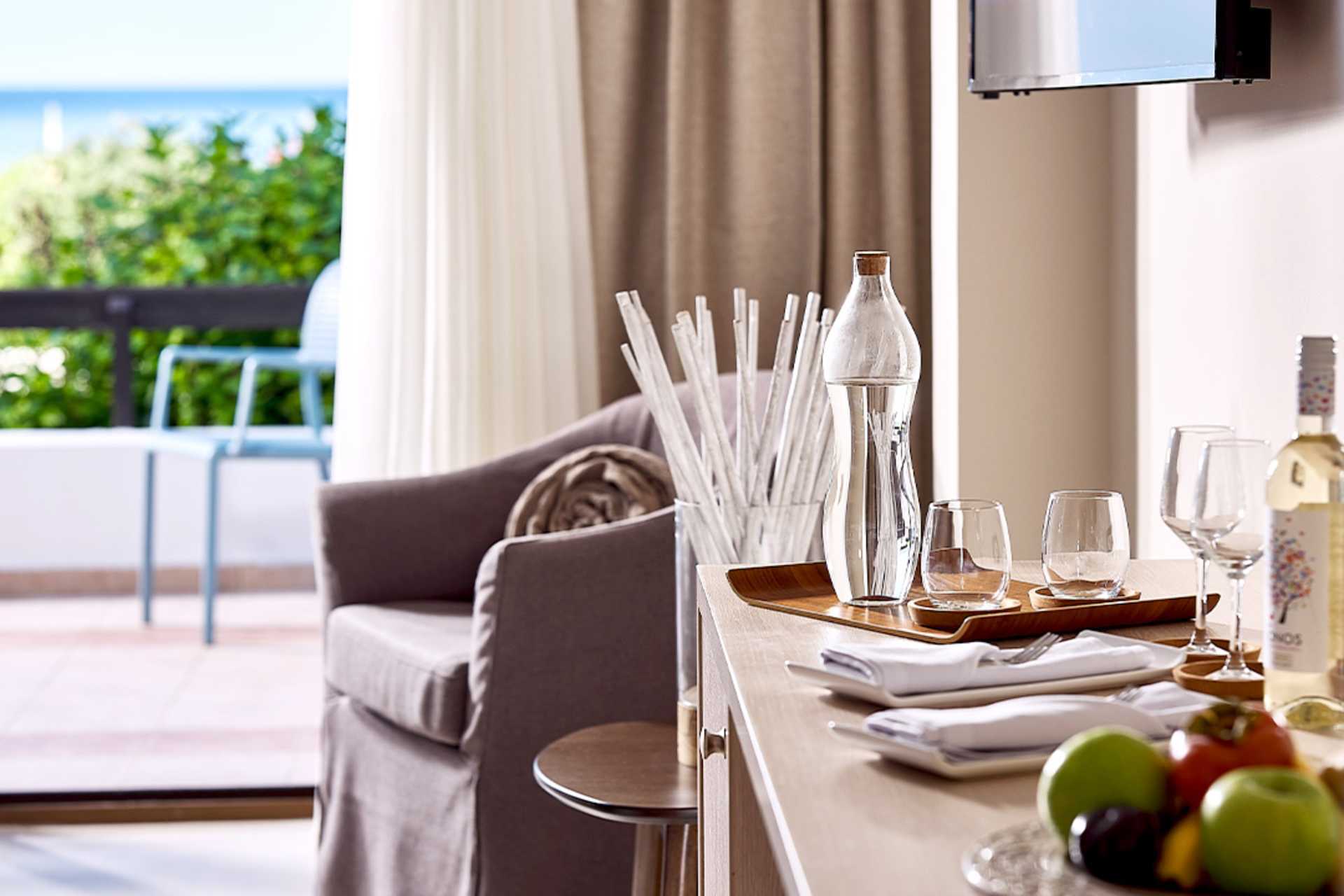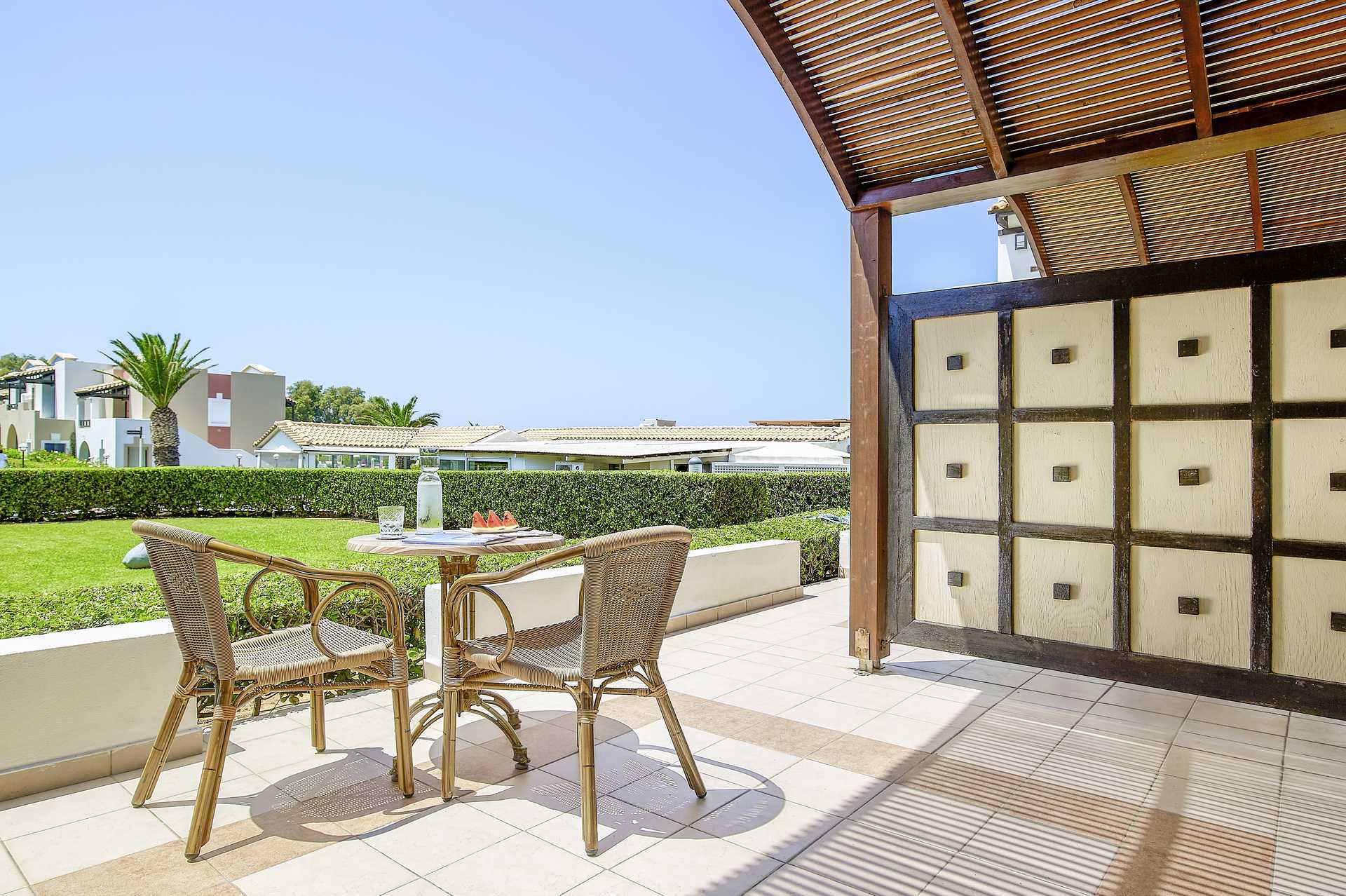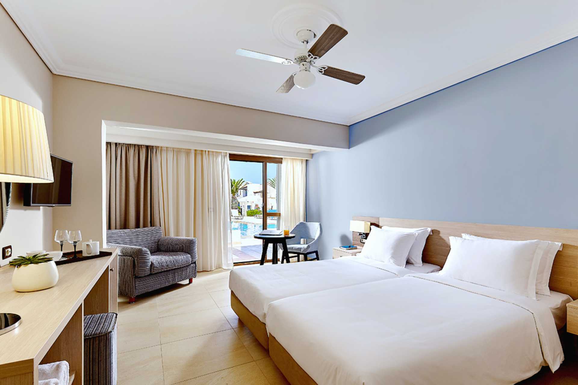 Superior-huone, jossa on terassi merelle ja yhteiselle uima-altaalle päin. Huoneet sijaitsevat merenrantaa lähimpänä olevissa rakennuksissa. Kaksi yhden hengen sänkyä. Lisävuodemahdollisuus vuodesohvasta. Maksuton wifi, ilmastointi ja tallelokero. Jääkaappi. Vedenkeitin, kahvia ja teetä. Tervetuliaispaketti, joka sisältää vettä ja alkoholitonta viiniä saapuessasi. Tv kansainvälisillä kanavilla. Hiustenkuivain. Kylpytakit, tossut sekä allas- ja rantapyyhkeet. Suihku ja wc. Siivous 7 krt/viikko. Alle 2-vuotiaat lapset lasketaan lisävuoteella majoittuviksi henkilöiksi.
