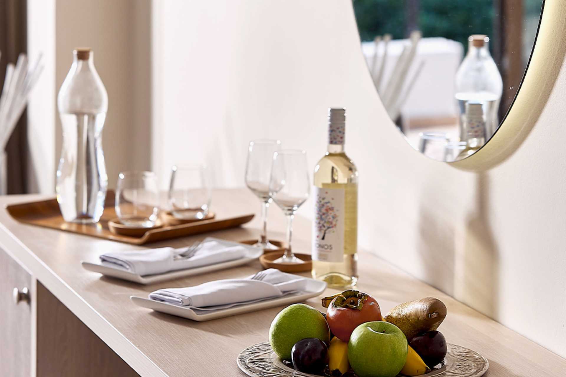 Kahden hengen huoneita, joissa on parveke tai terassi, osassa merinäköala. Parivuode. Lisävuodemahdollisuus vuodesohvasta. Maksuton wifi, ilmastointi ja tallelokero. Jääkaappi. Vedenkeitin, kahvia ja teetä. Tervetulopaketti, jossa vettä ja viiniä saapumisen yhteydessä. Tv kansainvälisillä kanavilla. Hiustenkuivain. Kylpytakit ja tohvelit, sekä allas- ja rantapyyhkeet. Kylpyhuone, jossa kylpyamme ja wc. Huomioithan, että alle 2-vuotiaat lasketaan majoittuvaksi lisävuoteessa. Siivous 7krt/viikko.