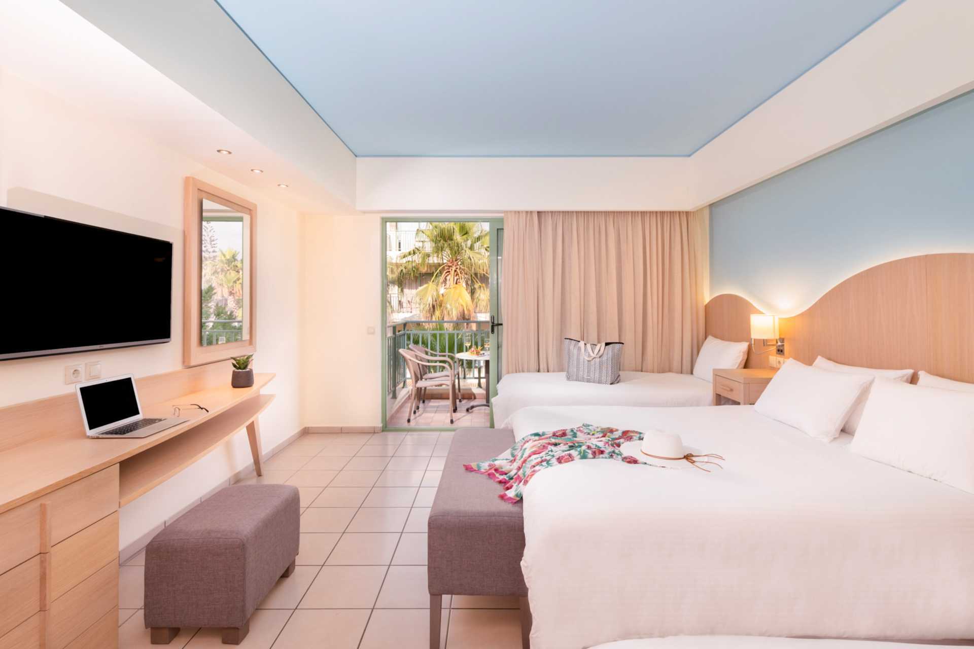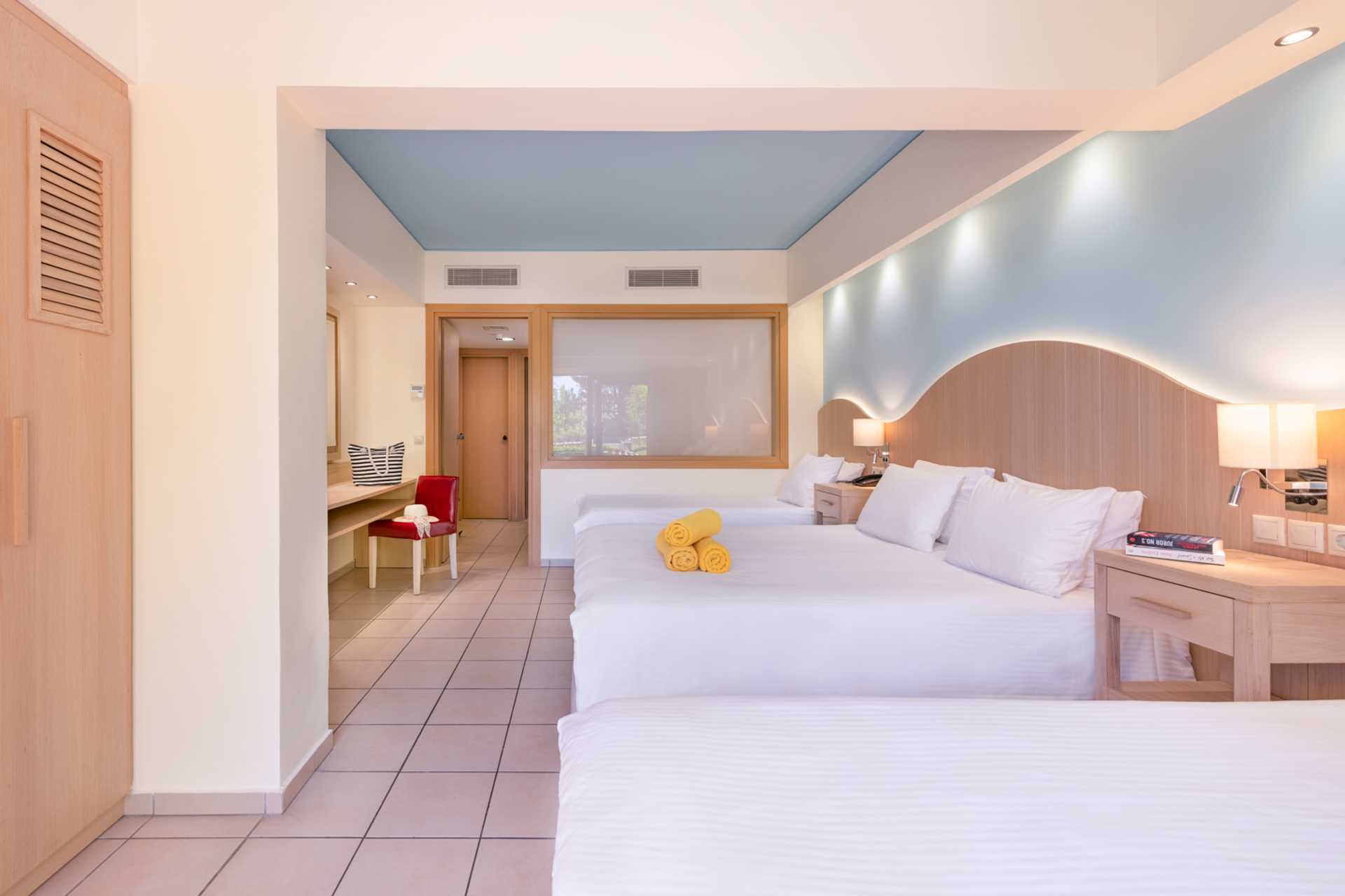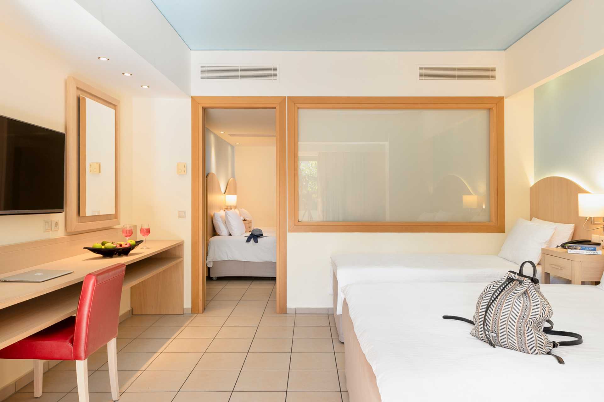 Superior-perhehuone, jossa maaterassi tai parveke. Maaterassilla varustettuihin huoneisiin on sisäänkäynti terassin kautta. Makuuhuone ja olohuone. Parivuode. Mahdollisuus saada lisävuode kolmeen ja/tai neljään yhden hengen sänkyyn. Jääkaappi – kaksi vesipulloa sisältyy hintaan ja täytetään päivittäin. Mikroaaltouuni. Vedenkeitin, kahvia ja teetä. Tv kansainvälisillä kanavilla. Hiustenkuivain. Kylpyamme tai suihku ja wc. Siivous 7 krt/viikko. Alle 2-vuotiaat lapset lasketaan lisävuoteella majoittuviksi henkilöiksi.