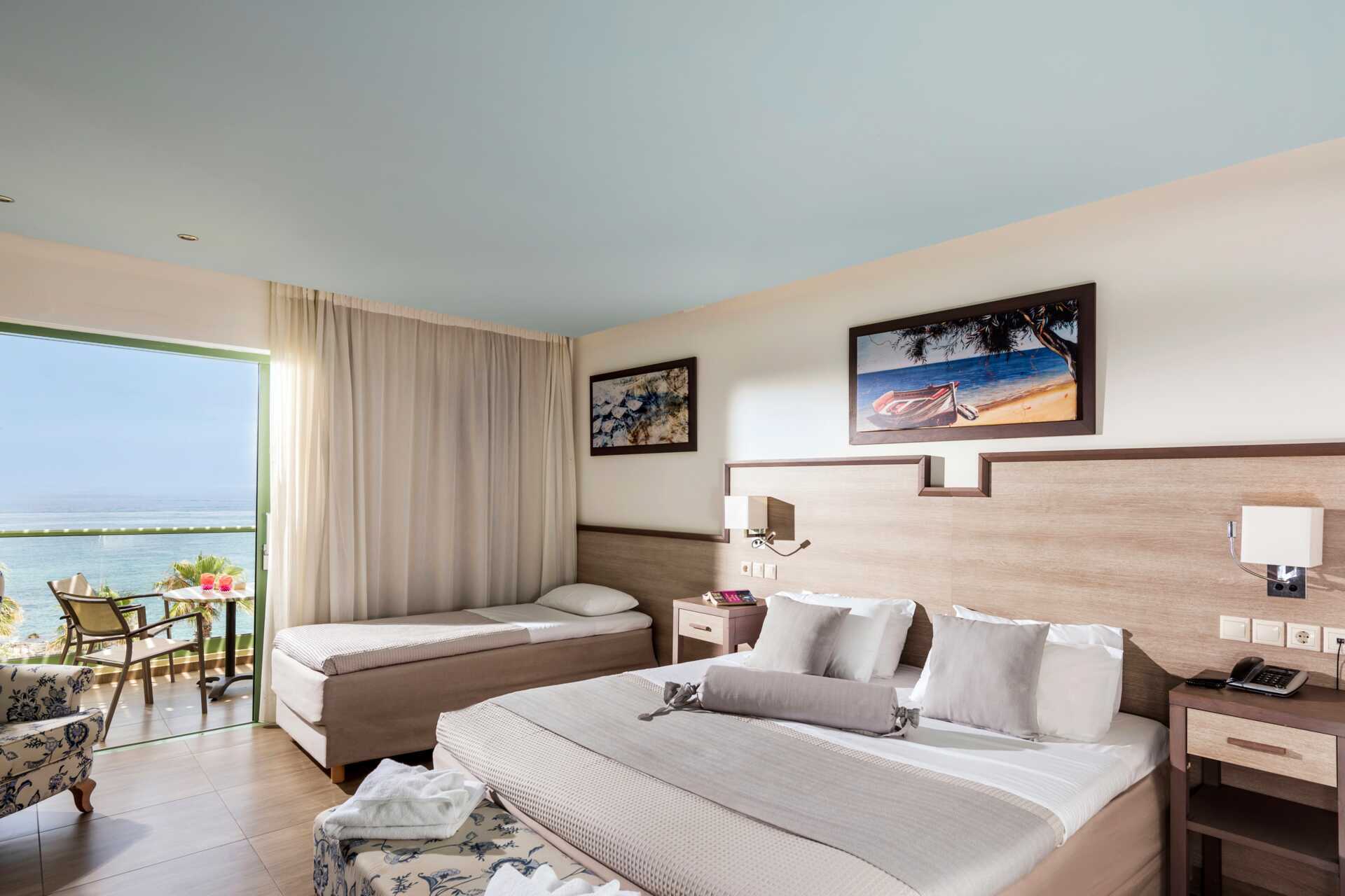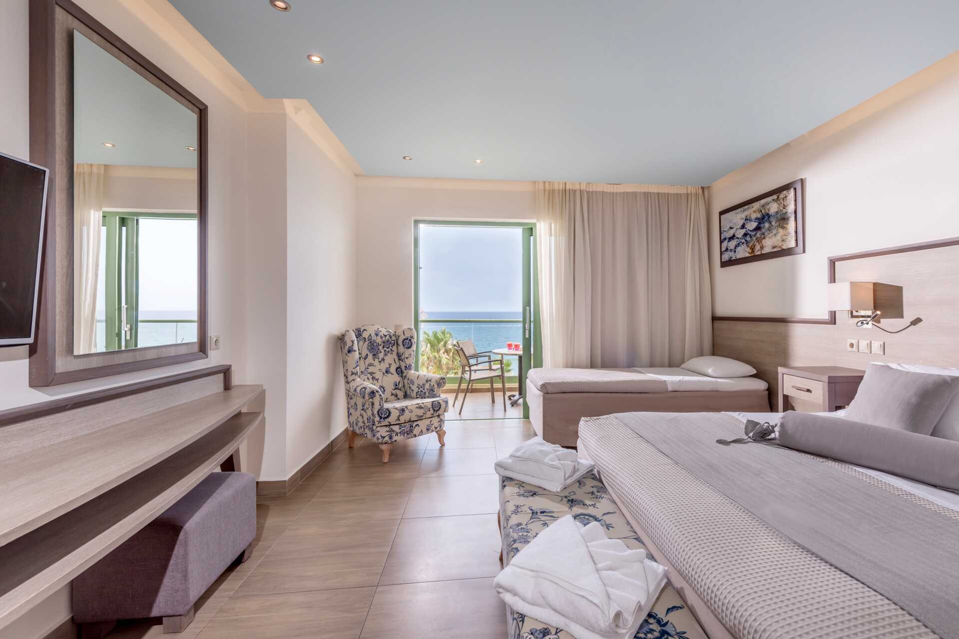 Sviitti parvekkeella ja merinäköalalla. Parivuode. Lisävuodemahdollisuus yhden hengen sängystä. Maksuton wifi, ilmastointi ja tallelokero. Jääkaappi – kaksi vesipulloa sisältyy hintaan ja täytetään päivittäin. Mikroaaltouuni. Vedenkeitin, kahvia ja teetä. Tv kansainvälisillä kanavilla. Hiustenkuivain. Kylpyamme tai suihku ja wc. Siivous 7 krt/viikko. Alle 2-vuotiaat lapset lasketaan lisävuoteella majoittuviksi henkilöiksi.