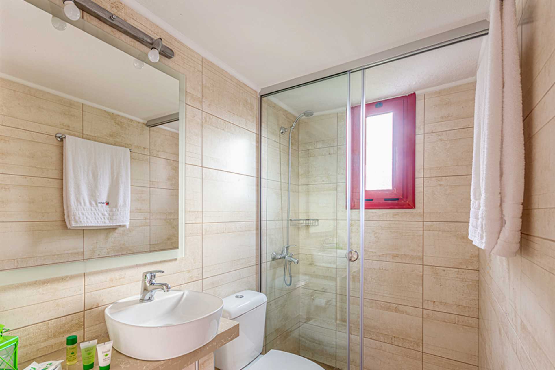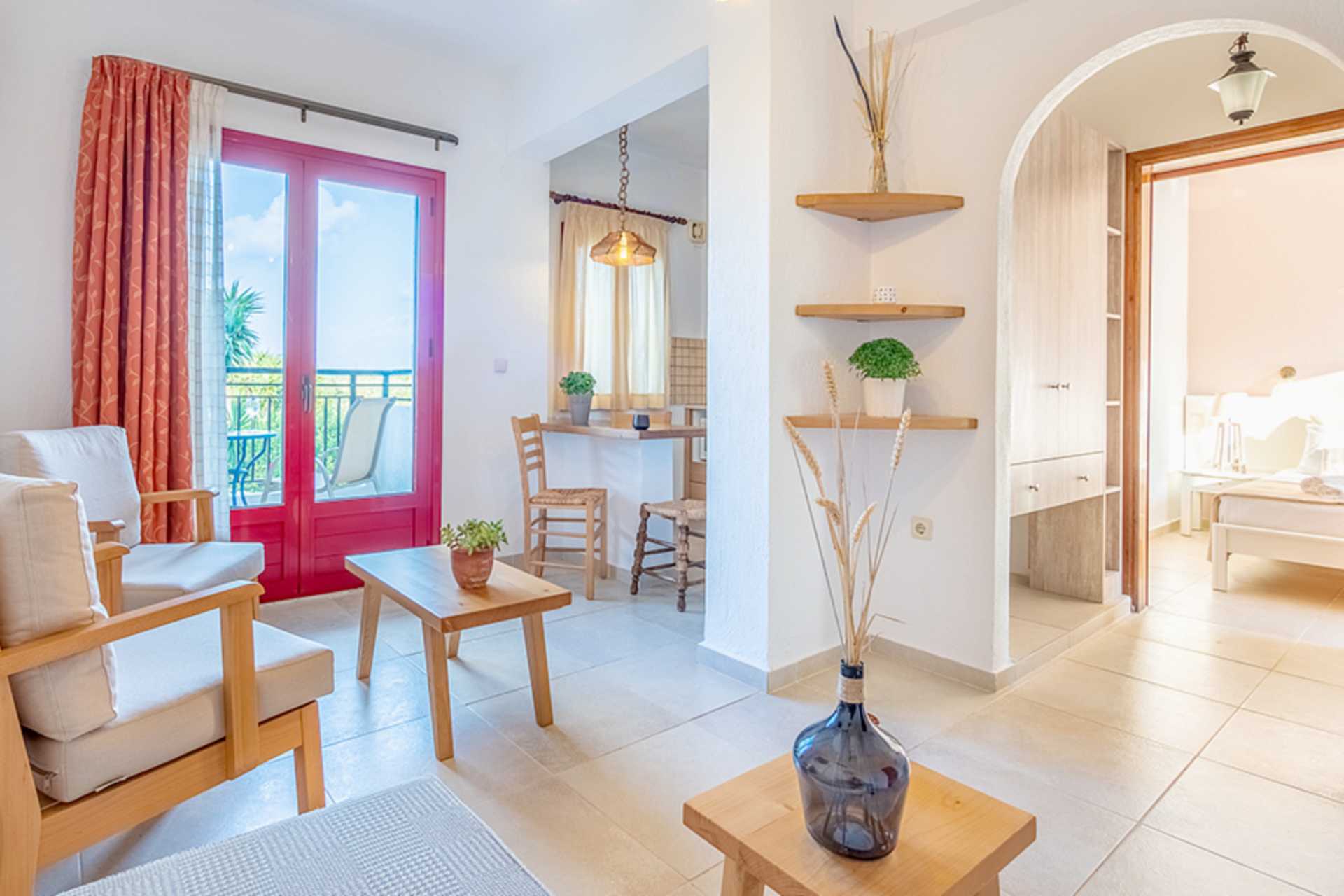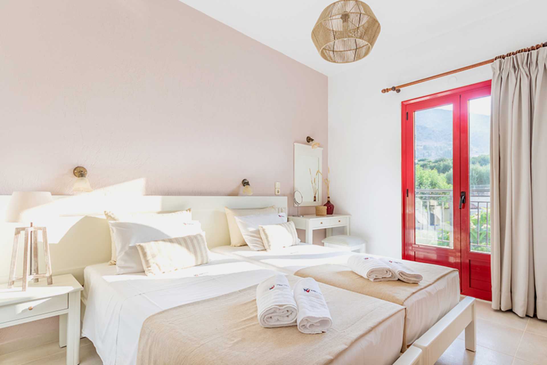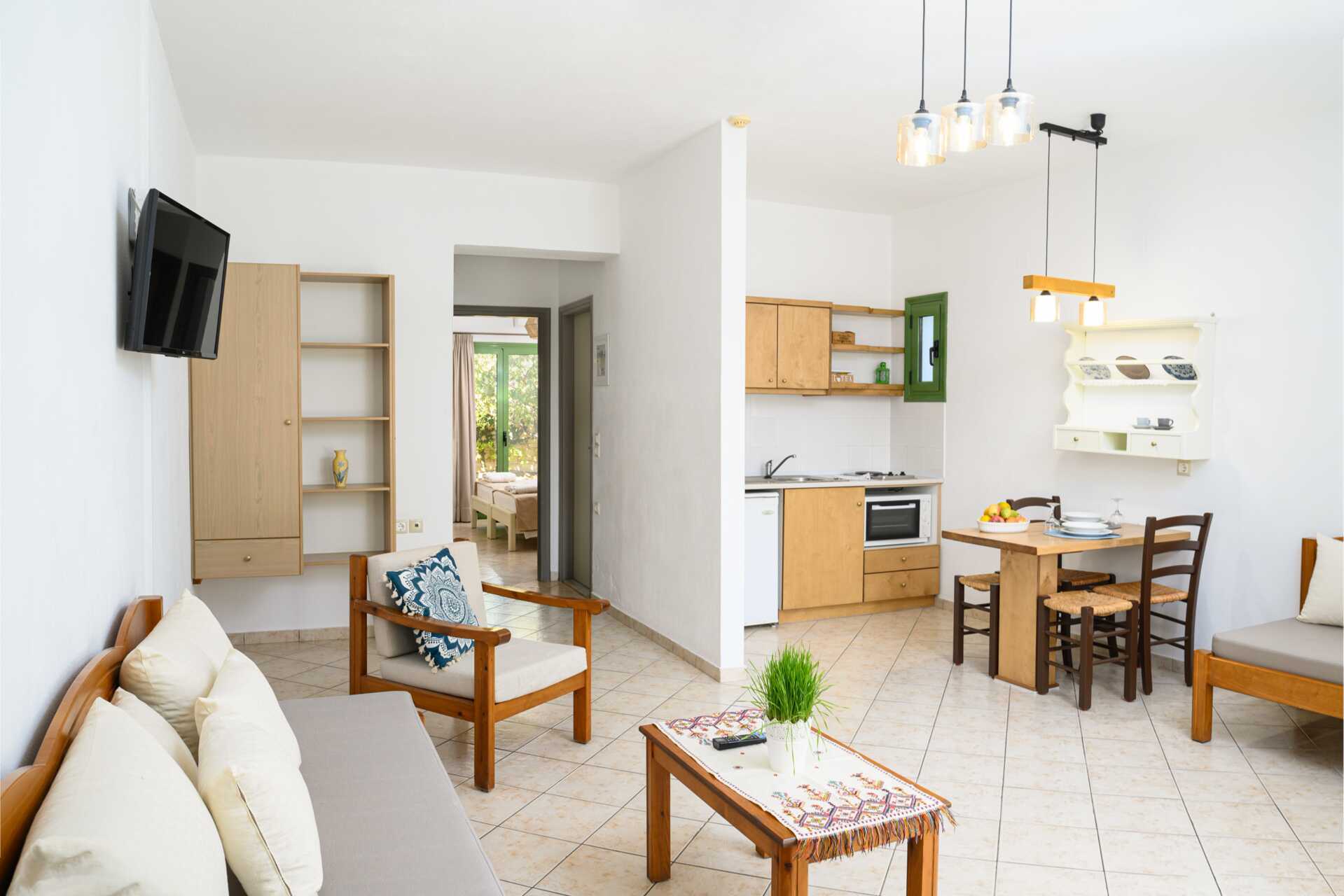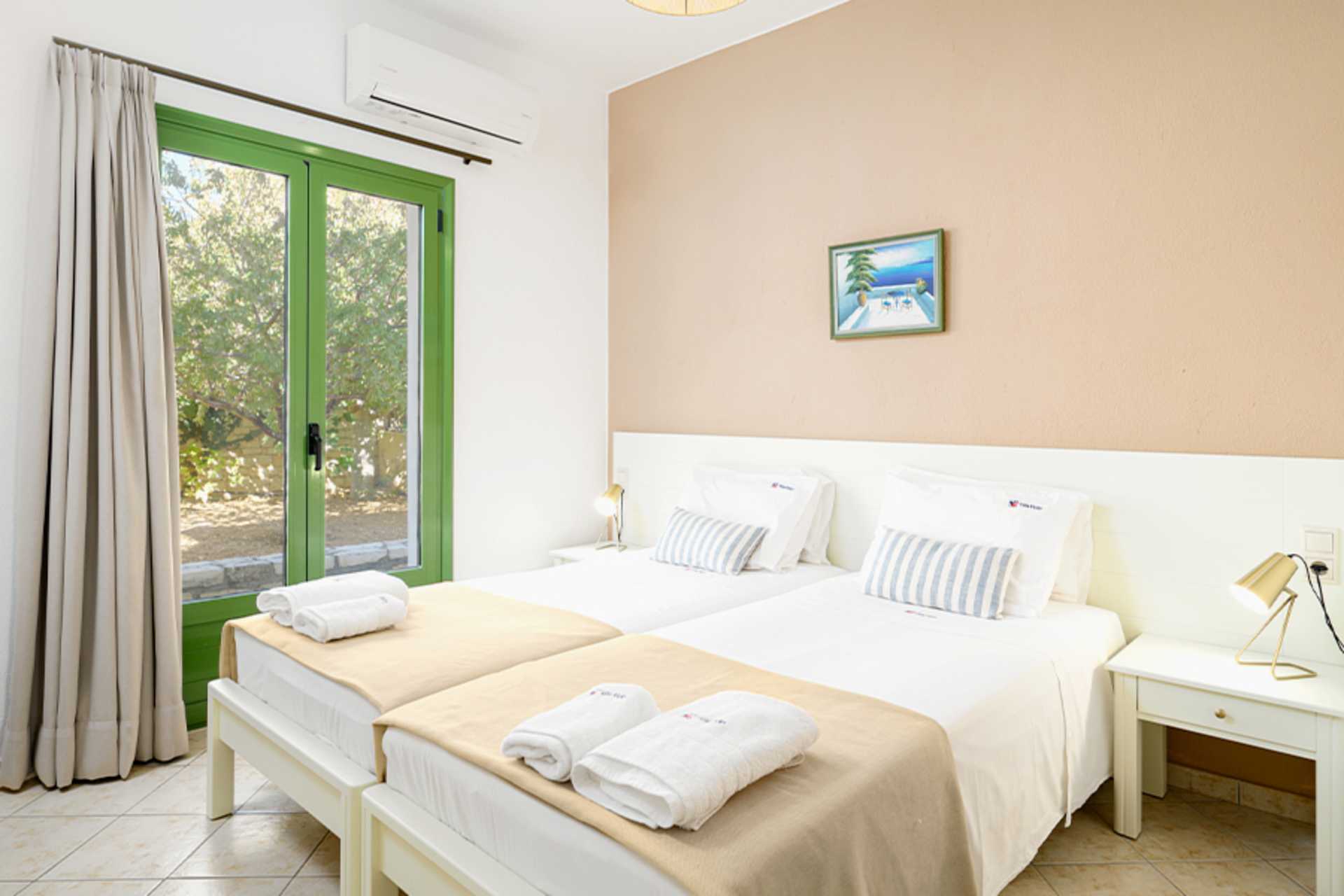 Kaksio eri kokoisilla parvekkeilla tai maaterassilla. Makuuhuone sekä yhdistetty olohuone ja minikeittiö. Kaksi yhden hengen sänkyä. Lisävuodemahdollisuus vuodesohvasta. Minikeittiö, jossa on keittolevyt, jääkaappi, vedenkeitin, kahvinkeitin ja leivänpaahdin sekä yksinkertaiset keittiövälineet. Maksuton wifi ja tallelokero. Ilmastointi lisämaksusta. Hiustenkuivain. Suihku ja wc. Siivous 6 krt/viikko.