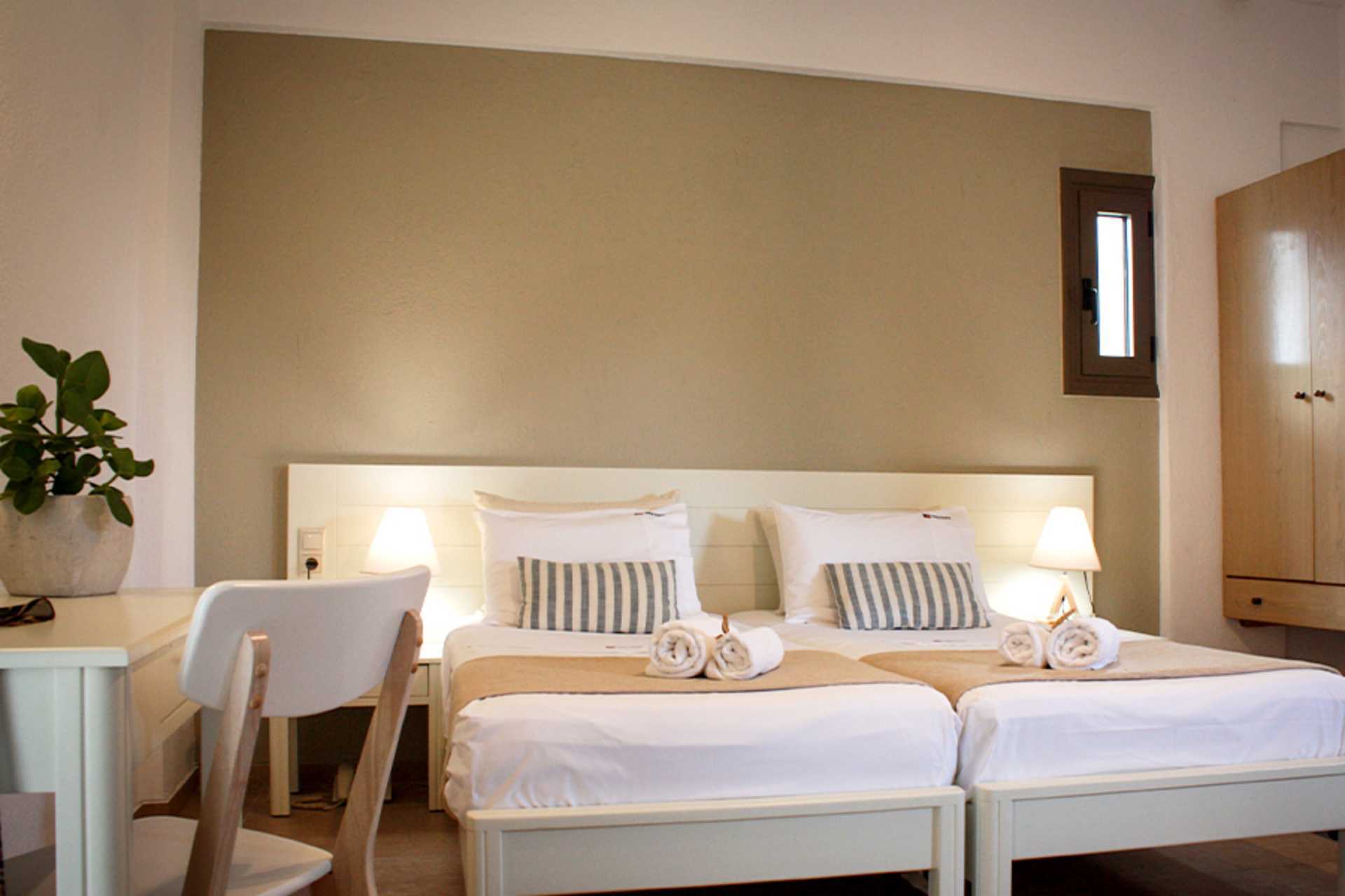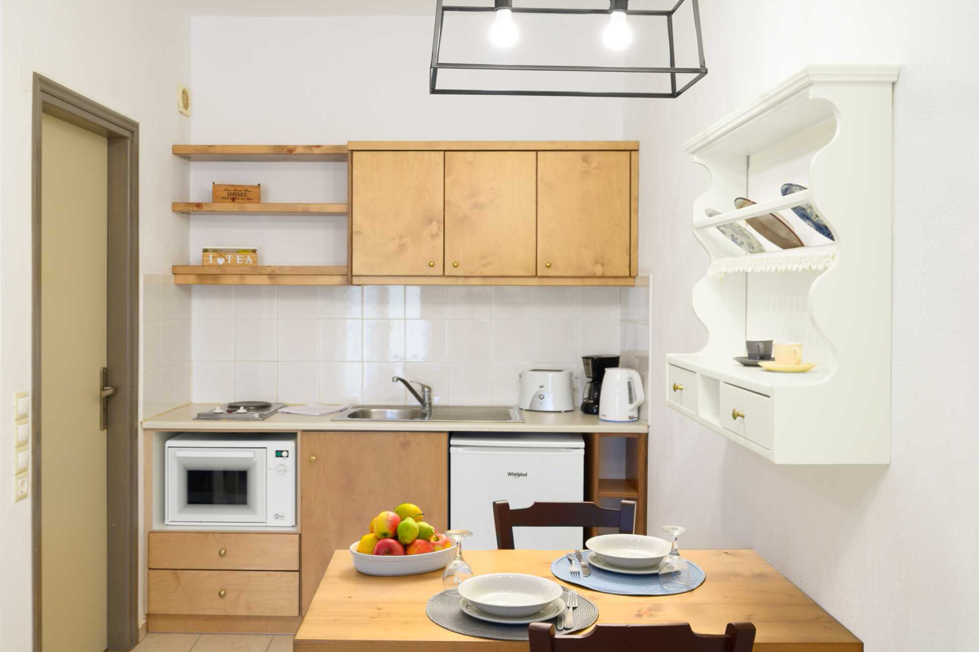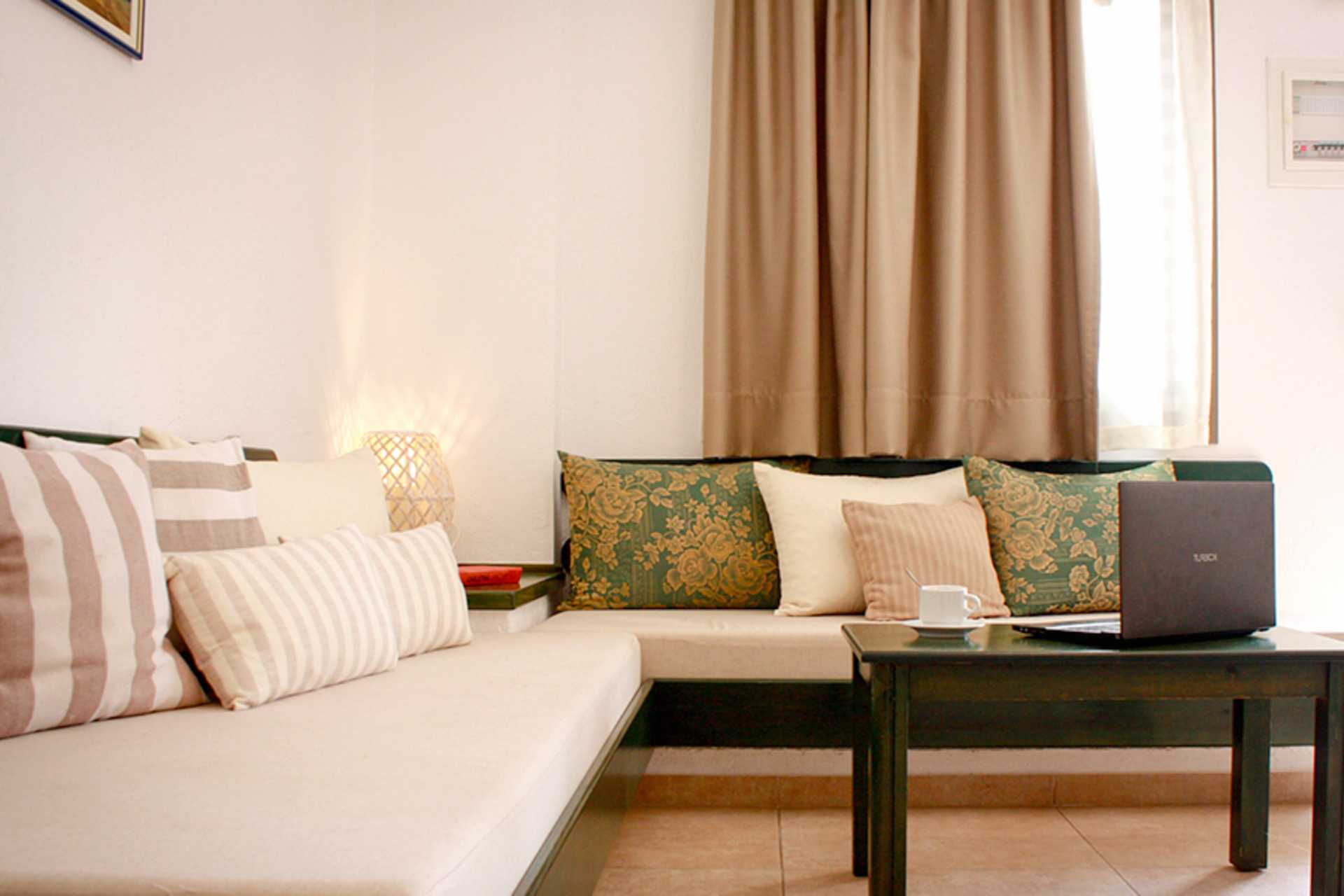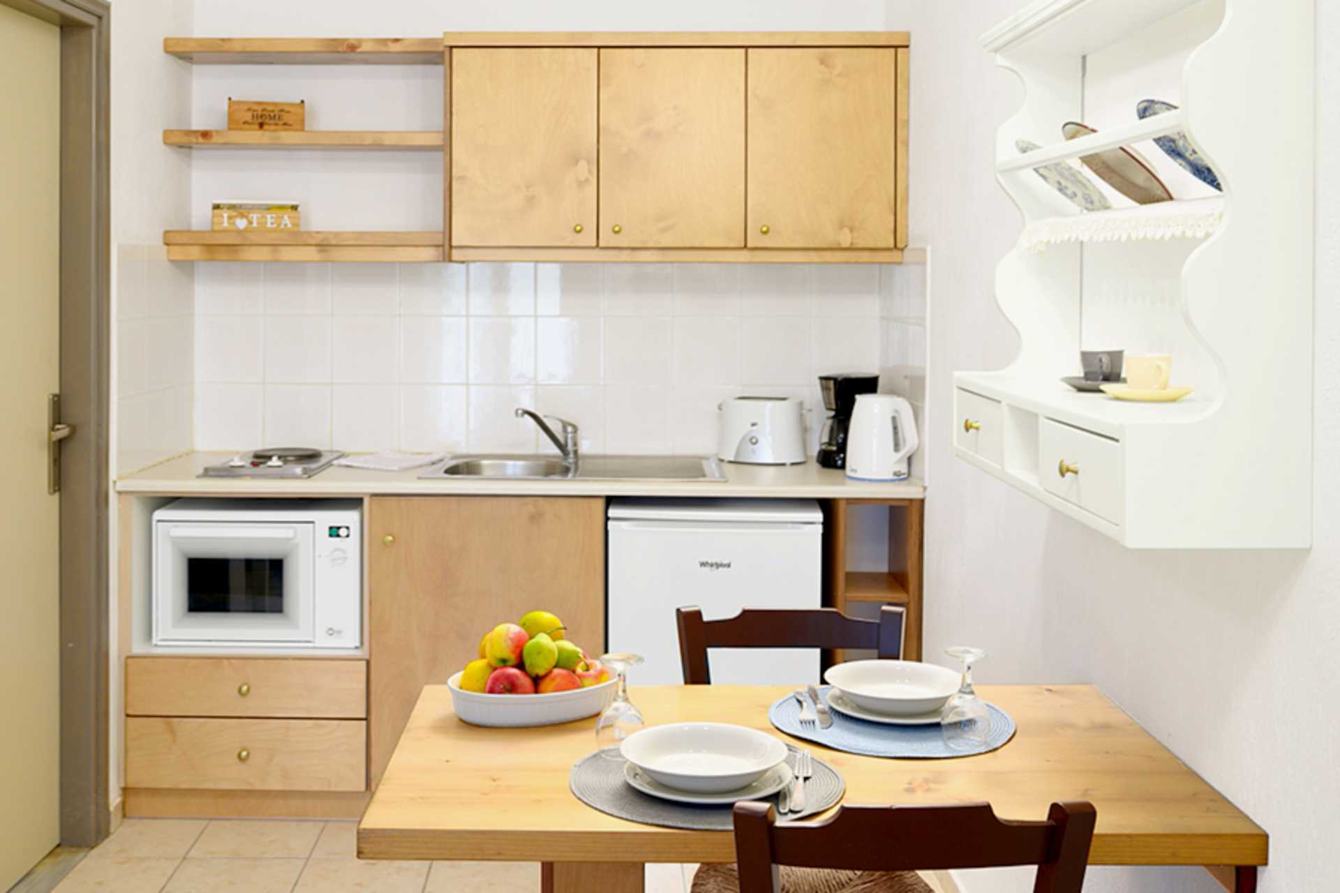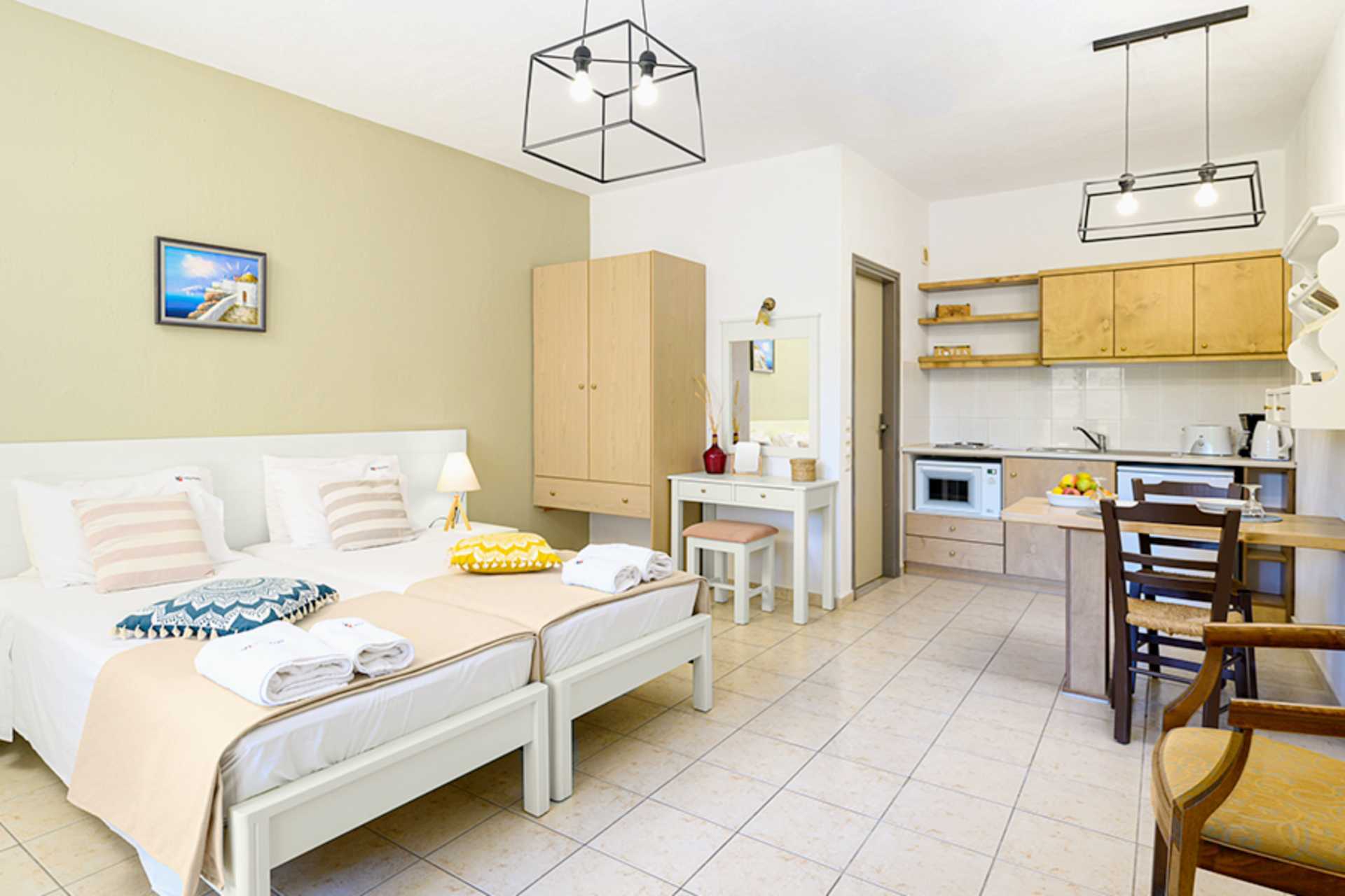 Yksiössä on parveke tai maaterassi. Yhdistetty makuuhuone ja minikeittiö. Kaksi yhden hengen sänkyä. Mahdollisuus lisävuoteeseen vuodesohvassa. Minikeittiössä keittolevyt, uuni, jääkaappi, vedenkeitin, kahvinkeitin, leivänpaahdin ja yksinkertainen keittiövarustus. Wifi ja tallelokero sisältyvät hintaan. Ilmastointi lisämaksusta. Tv kansainvälisillä kanavilla. Hiustenkuivain. Suihku ja wc. Siivous 6 krt/viikko.