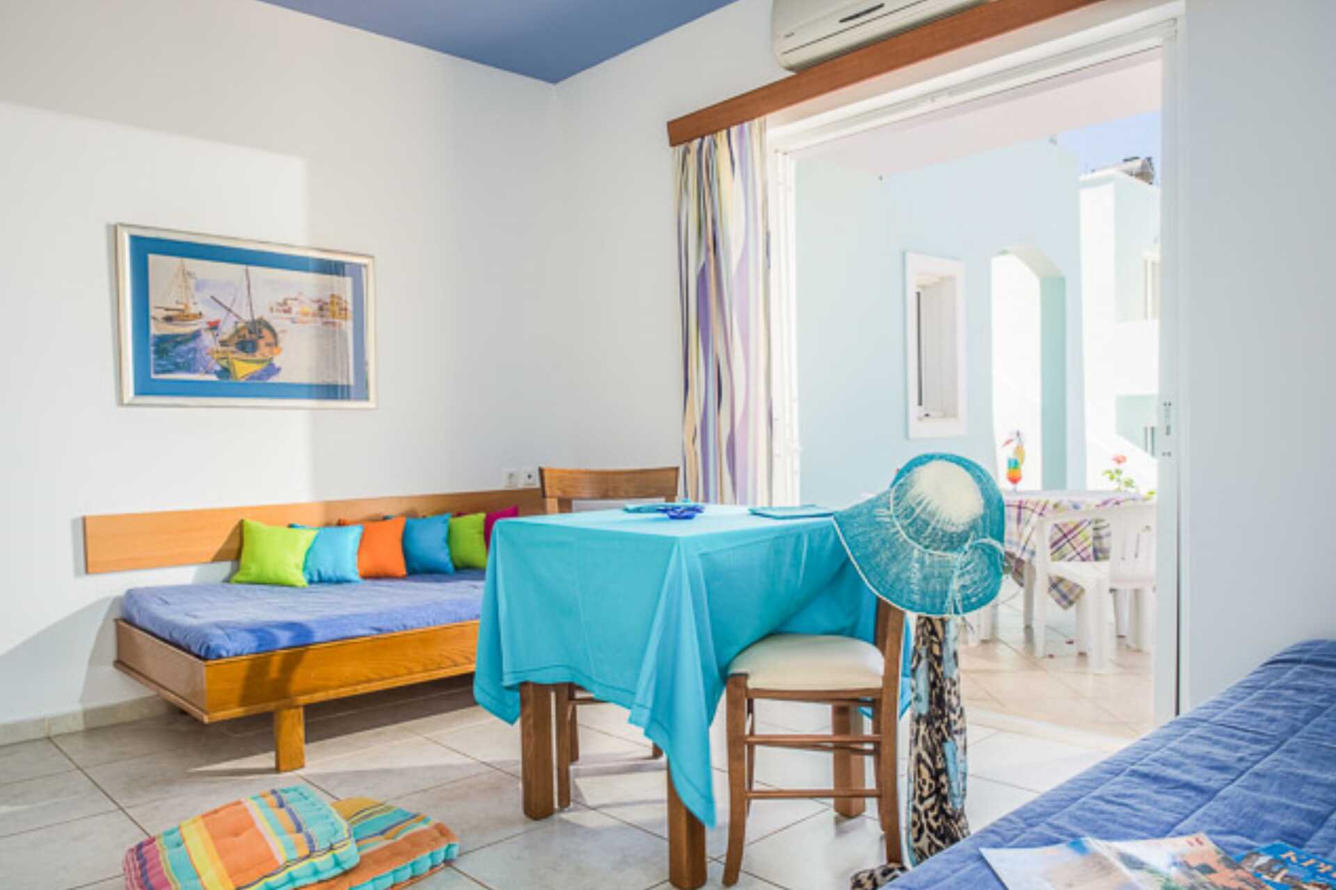 Kolmio parvekkeella tai terassilla. Makuuhuone ja olohuone sekä keittiö ruokailutilalla. Makuuhuoneessa on parivuode ja olohuoneeseen on mahdollista saada kaksi lisävuodetta vuodesohvaan. Minikeittiössä keittolevyt, jääkaappi, kahvinkeitin, vedenkeitin ja yksinkertainen keittiövarustus. Maksuton wifi ja tallelokero. Ilmastointi lisämaksusta. Televisio kansainvälisillä kanavilla on saatavilla joko makuuhuoneessa tai olohuoneessa. Hiustenkuivain. Kylpyhuoneessa suihku ja wc. Siivous 7 krt/viikko.