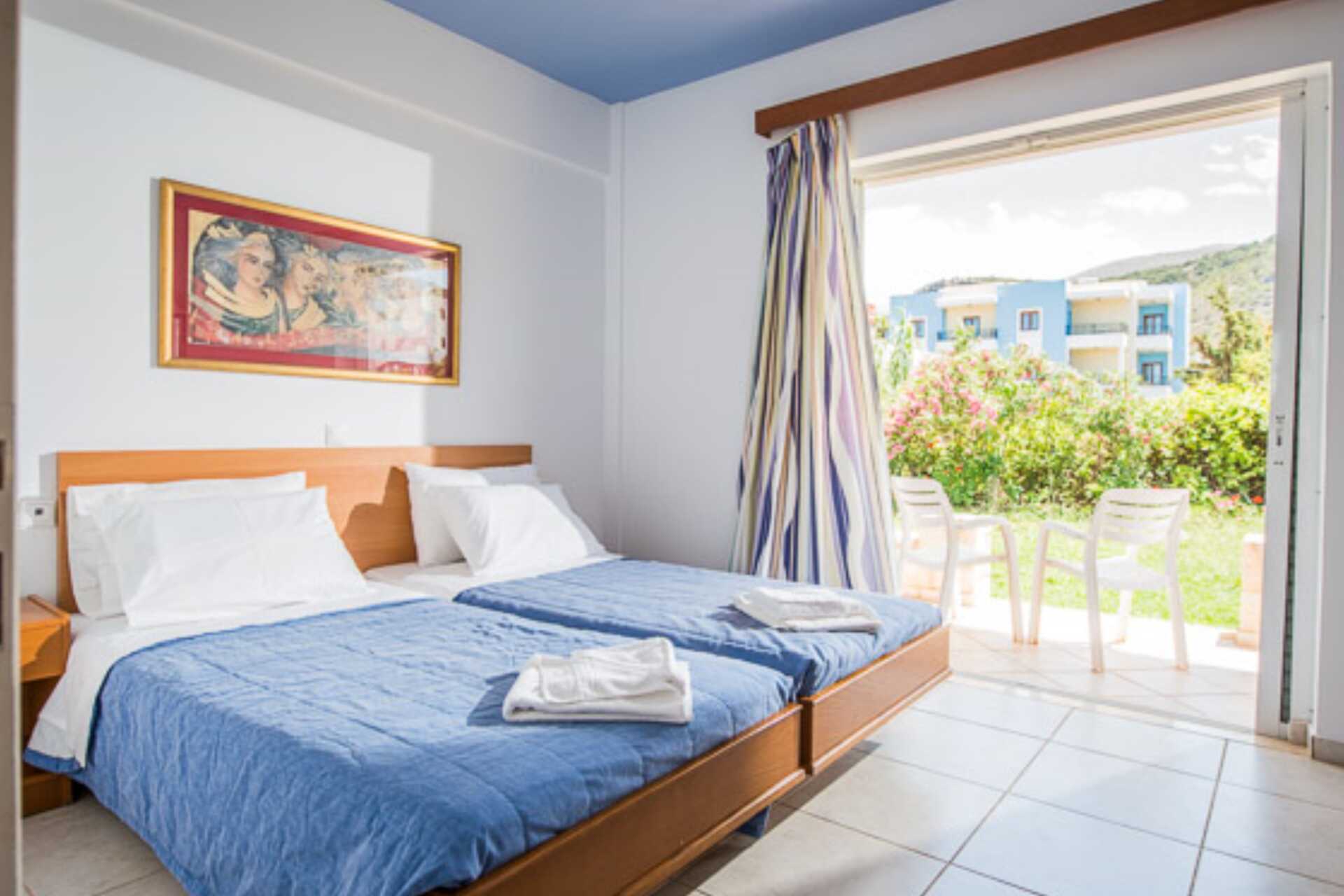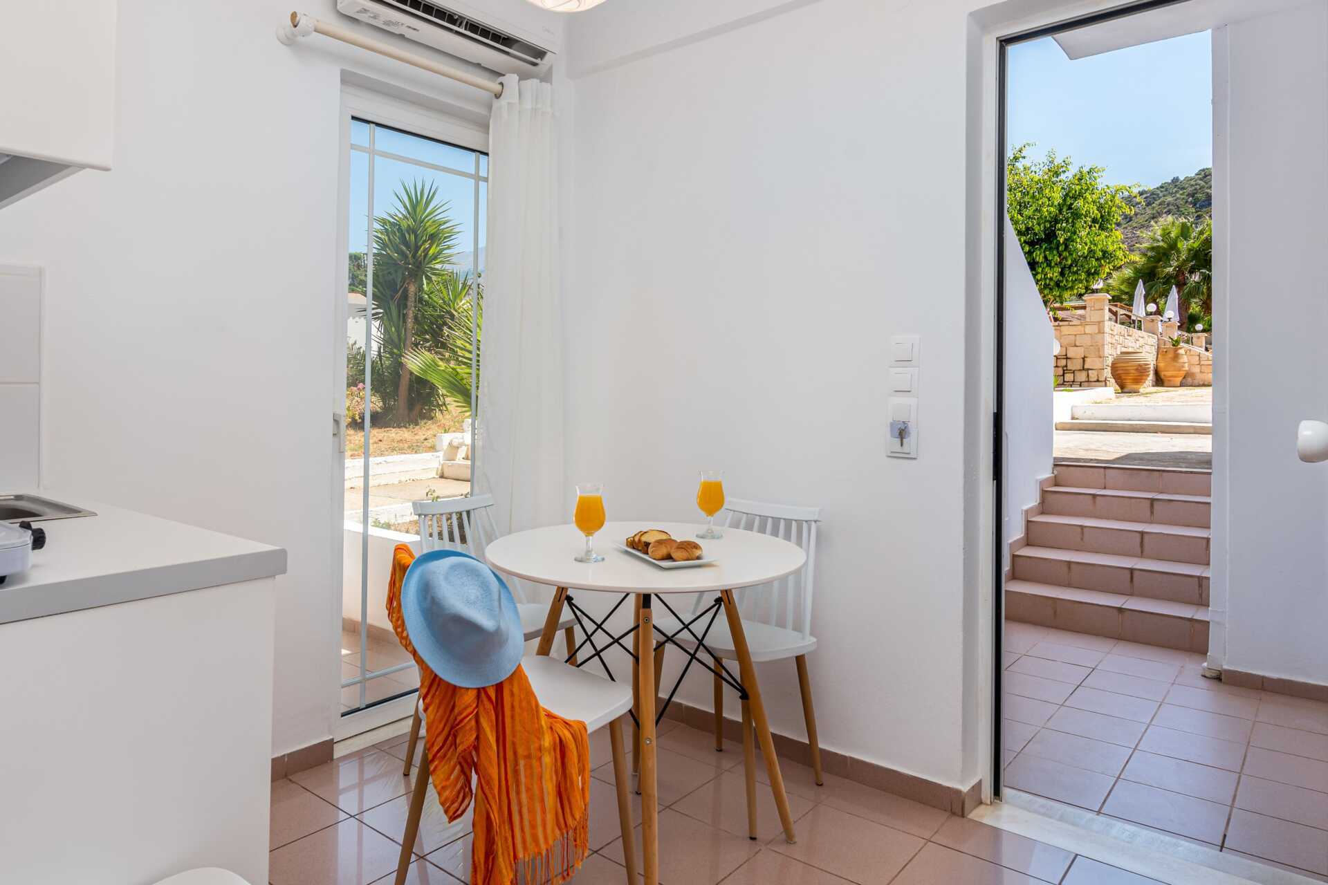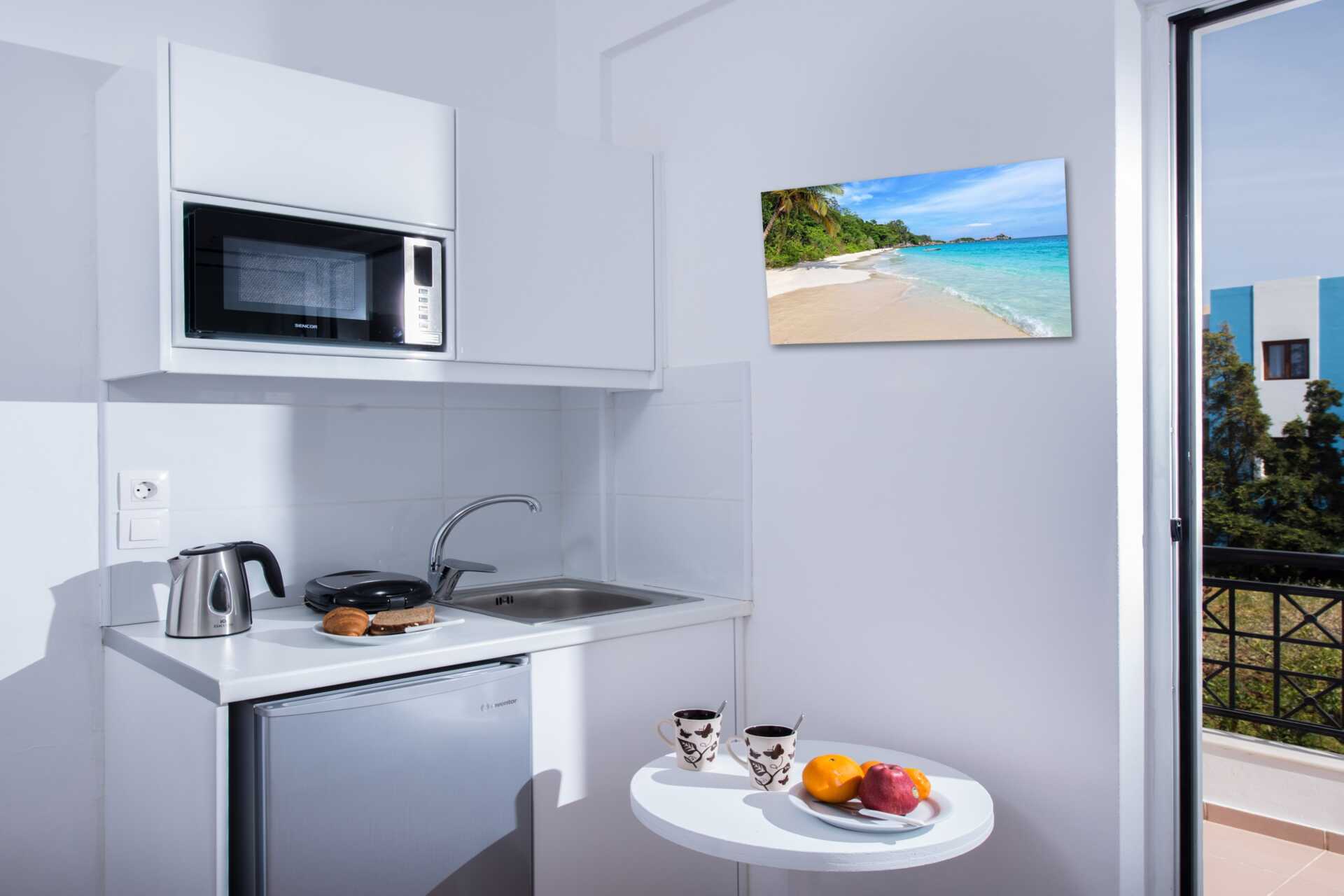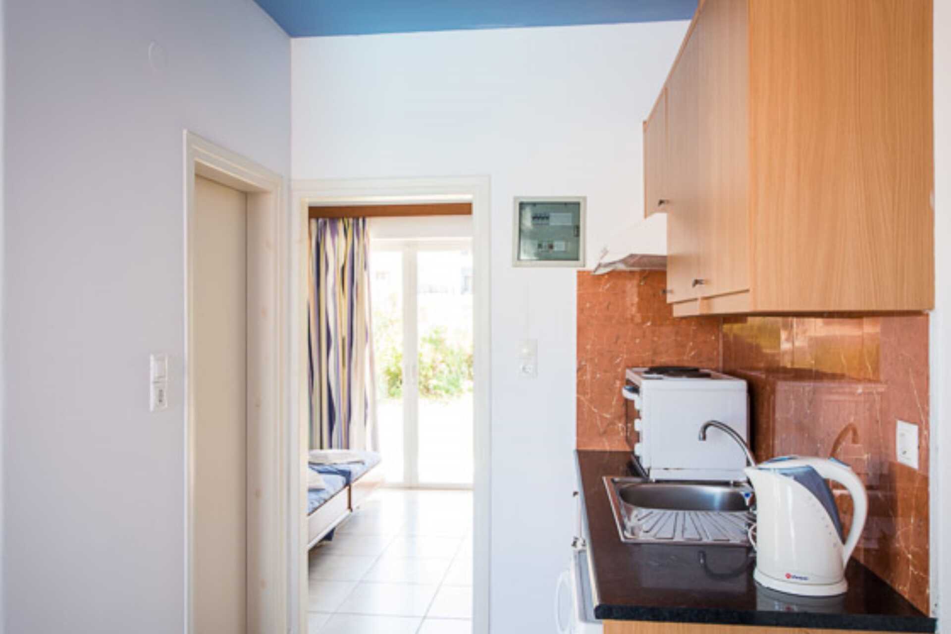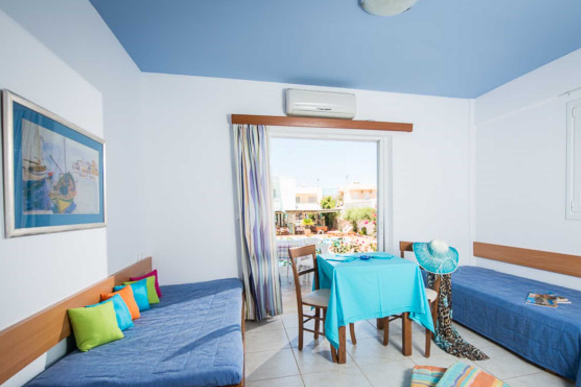 Kaksio parvekkeella tai terassilla. Makuuhuone sekä yhdistetty olohuone ja minikeittiö. Kaksi yhden hengen sänkyä. Lisävuodemahdollisuus kahdesta yhden hengen sängystä. Minikeittiössä keittolevyt, jääkaappi, kahvinkeitin, vedenkeitin ja yksinkertainen keittiövarustus. Maksuton wifi ja tallelokero. Ilmastointi lisämaksusta. Tv kansainvälisillä kanavilla. Hiustenkuivain. Kylpyhuoneessa suihku ja wc. Siivous 7 krt/viikko.