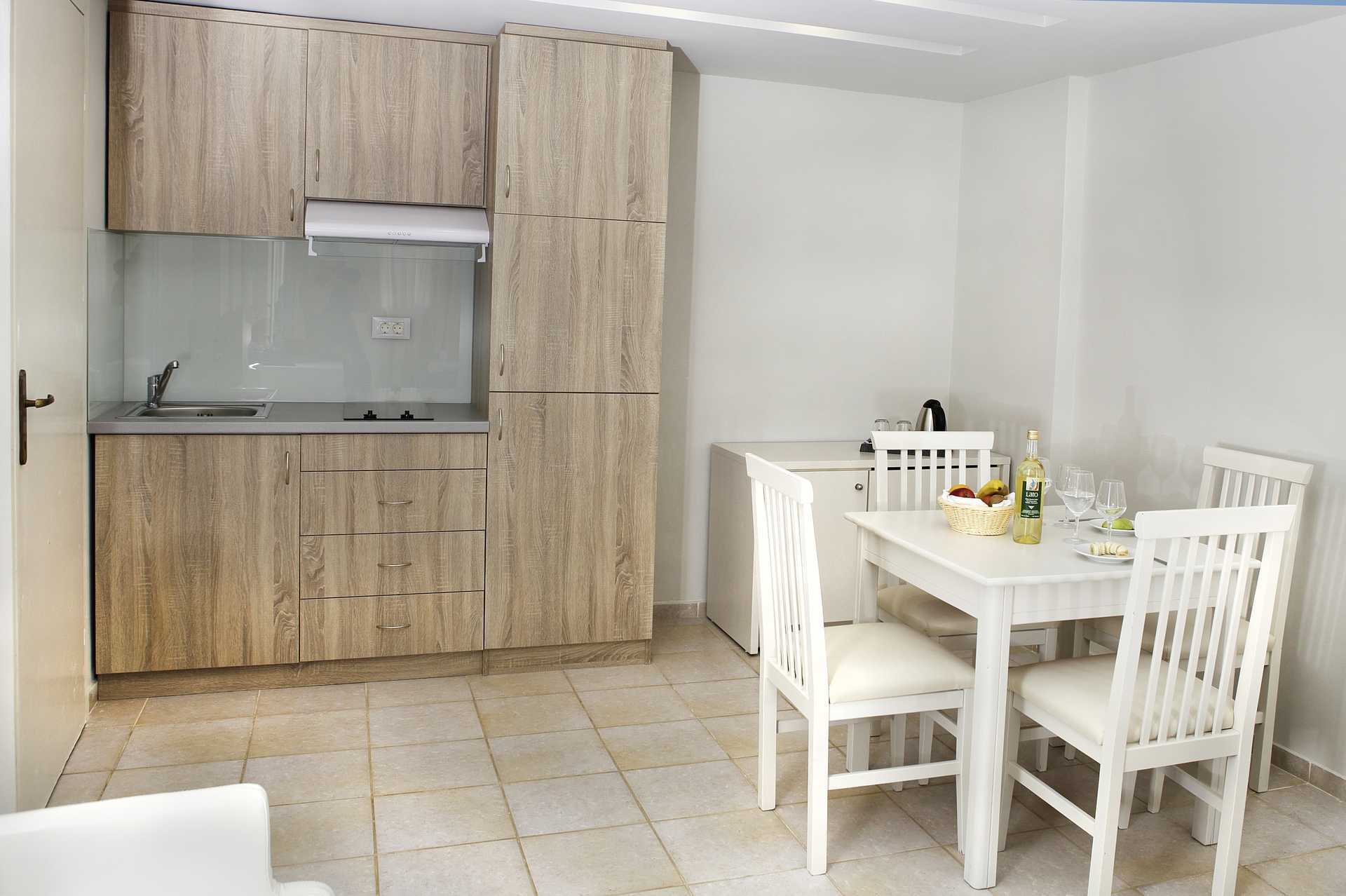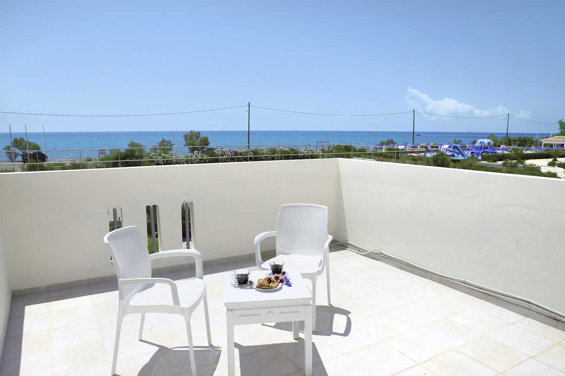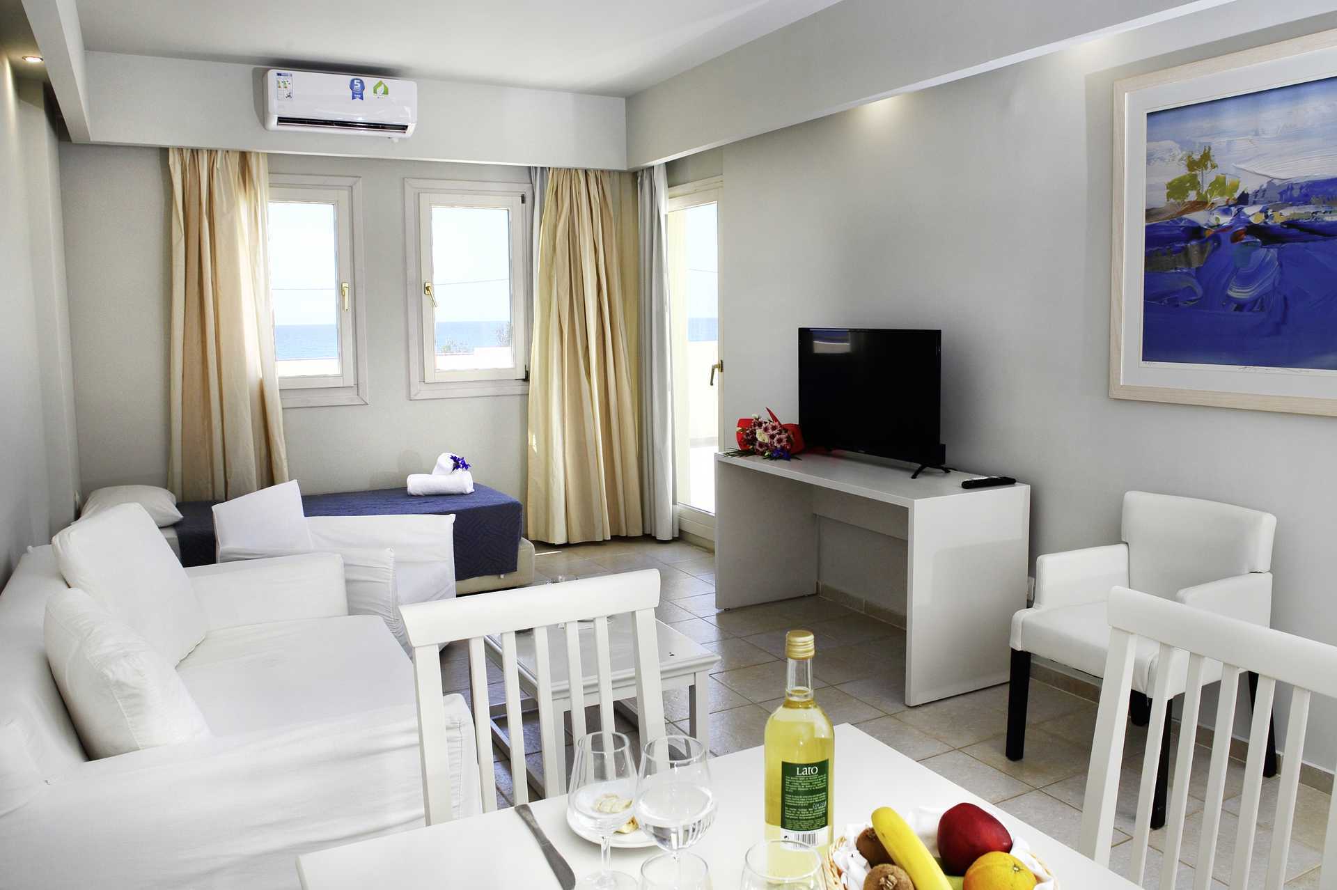 Kaksioita parvekkeella, osasta rajoitettu merinäköala. Parvekkeiden koko vaihtelee. Makuuhuone ja yhdistetty olohuone/keittiö. Kaksi erillistä vuodetta. Mahdollisuus lisävuoteeseen vuodesohvasta. Minikeittiö, jossa keittolevyt, jääkaappi ja yksinkertainen keittovarustus. Mikroja lainattavissa pyynnöstä (rajoitettu määrä). Kahvin ja teen keittomahdollisuus. Maksuton wifi, tallelokero ja ilmastointi. Tv satelliittikanavilla. Hiustenkuivain. Amme ja suihku sekä wc. Siivous 7 krt/viikko.