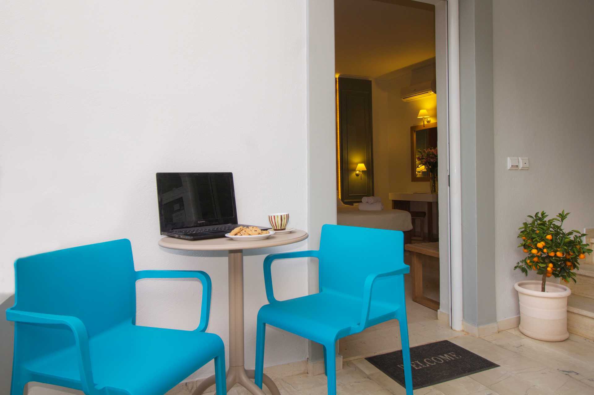 Yksiö parvekkeella, terassilla, jaetulla ulkotilalla tai ilman ulkotilaa. Terassit vaihtelevat kooltaan. Alimman kerroksen asuntoihin kuljetaan portaita pitkin. Yhdistetty makuuhuone ja minikeittiö. Parivuode tai kaksi yhden hengen vuodetta. Lisävuodemahdollisuus vuodesohvasta. Minikeittiö, jossa keittolevyt, jääkaappi, kahvinkeitin, voileipägrilli, vedenkeitin ja yksinkertainen keittiövarustus. Maksuton wifi. Ilmastointi ja tallelokero lisämaksusta. Tv kansainvälisillä kanavilla. Hiustenkuivain. Kylpyamme tai suihku ja wc. Siivous 6 krt/viikko.