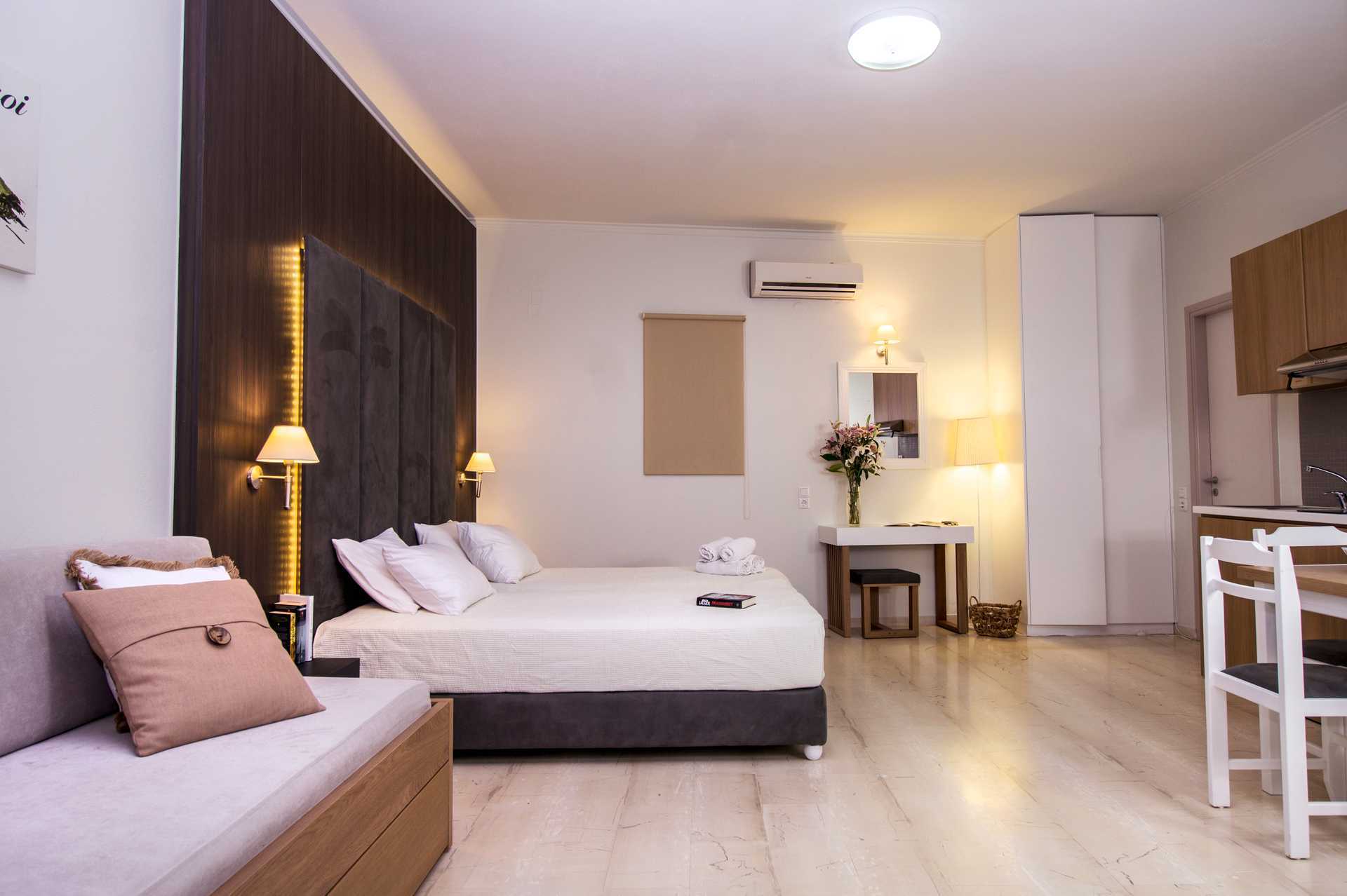 Yksiöitä, joissa on parveke, terassi tai jaettu ulkotila. Ulkotilojen koot vaihtelevat. Osassa huoneistoista ei ole ulkotilaa. Alimman kerroksen asuntoihin pääsee myös portaita pitkin. Yhdistetty makuuhuone ja minikeittiö, jossa on keittolevyt, jääkaappi, kahvinkeitin, leipägrilli, vedenkeitin ja yksinkertainen keittiövarustus. Parivuode tai kaksi yhden hengen vuodetta. Maksuton wifi. Ilmastointi ja tallelokero lisämaksusta. Tv kansainvälisillä kanavilla. Hiustenkuivain. Kylpyamme tai suihku ja wc. Siivous 6 krt/viikko.