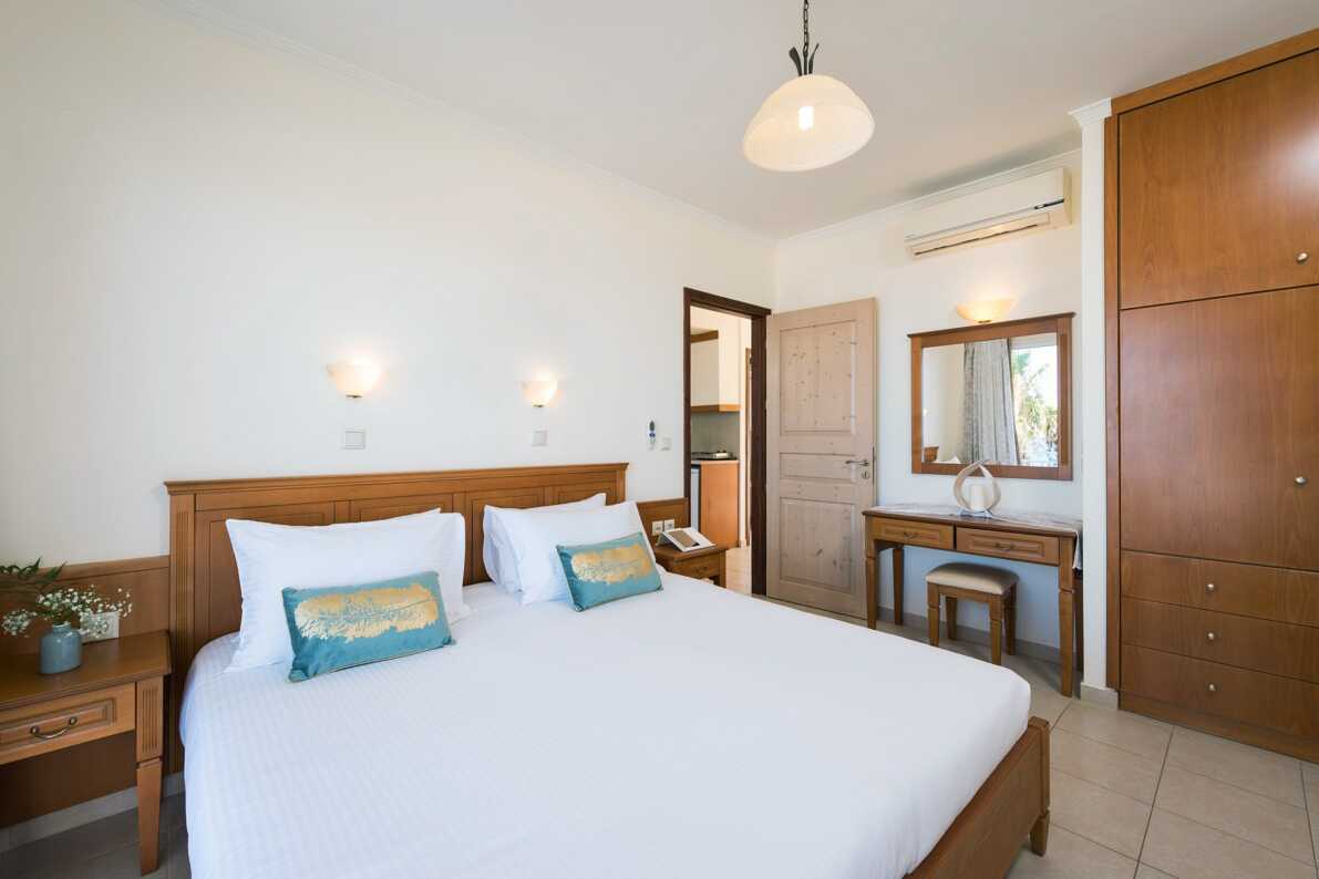Kolmioita, joissa parveke merinäköalalla. Kaksi erillistä makuuhuonetta sekä yhdistetty olohuone/minikeittiö. Parivuode tai kaksi erillistä vuodetta kummassakin makuuhuoneessa. Minikeittiö, jossa keittolevyt, jääkaappi, vedenkeitin, kahvinkeitin ja yksinkertainen keittiövarustus. Tv kansainvälisillä kanavilla. Maksuton wifi ja ilmastointi. Tallelokero lisämaksusta. Hiustenkuivain. Kylpyamme ja wc. Siivous 6 krt/vk.