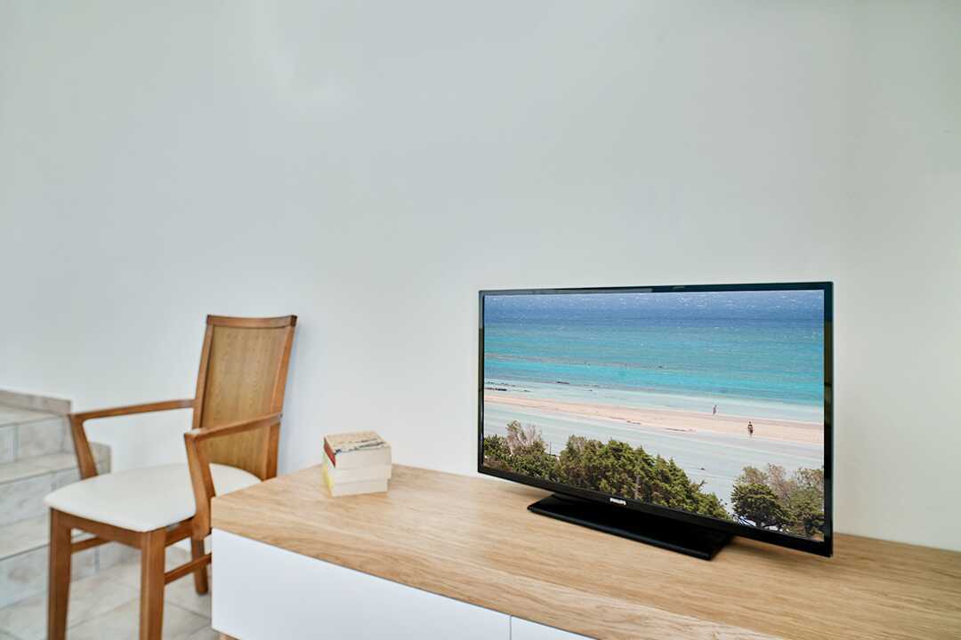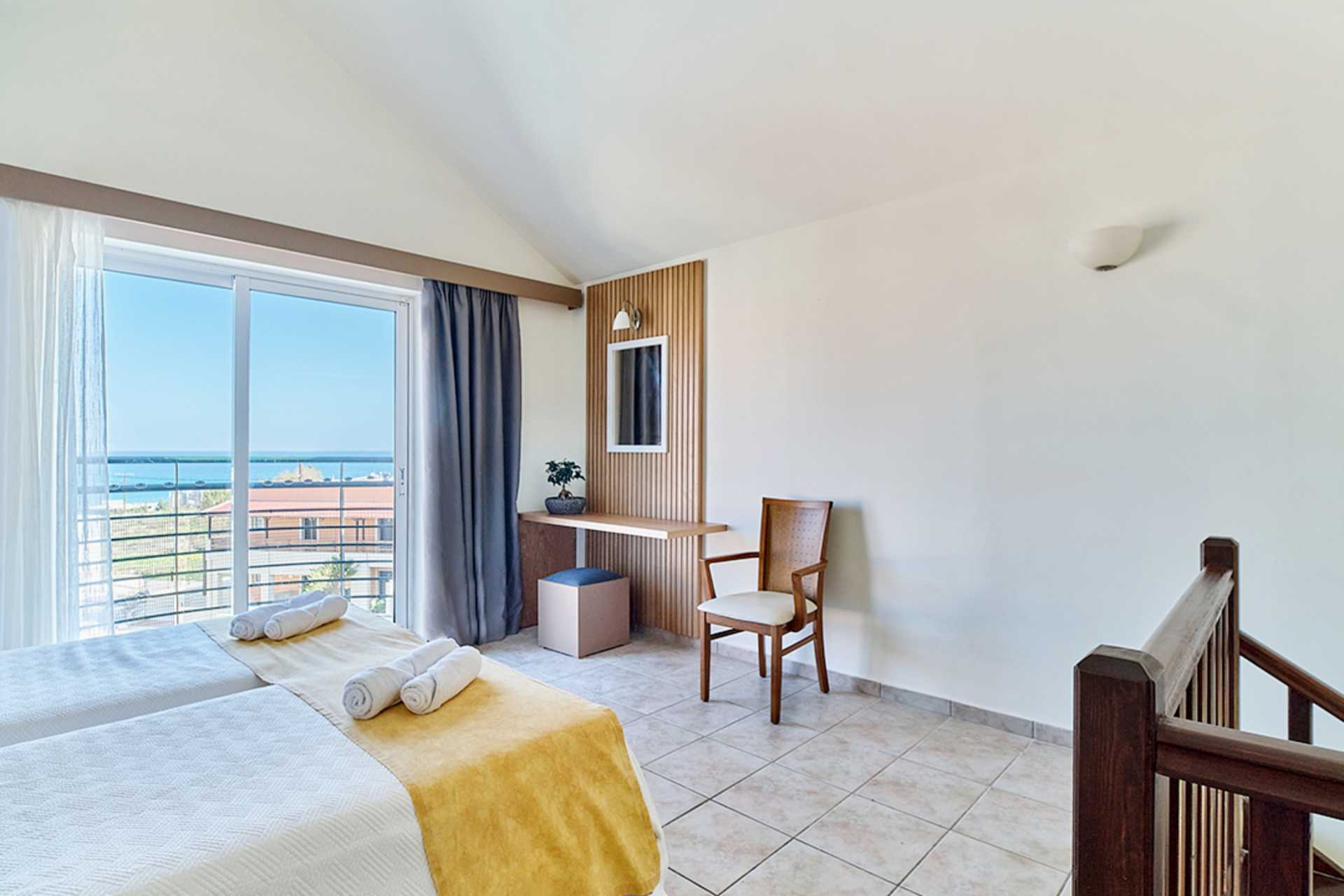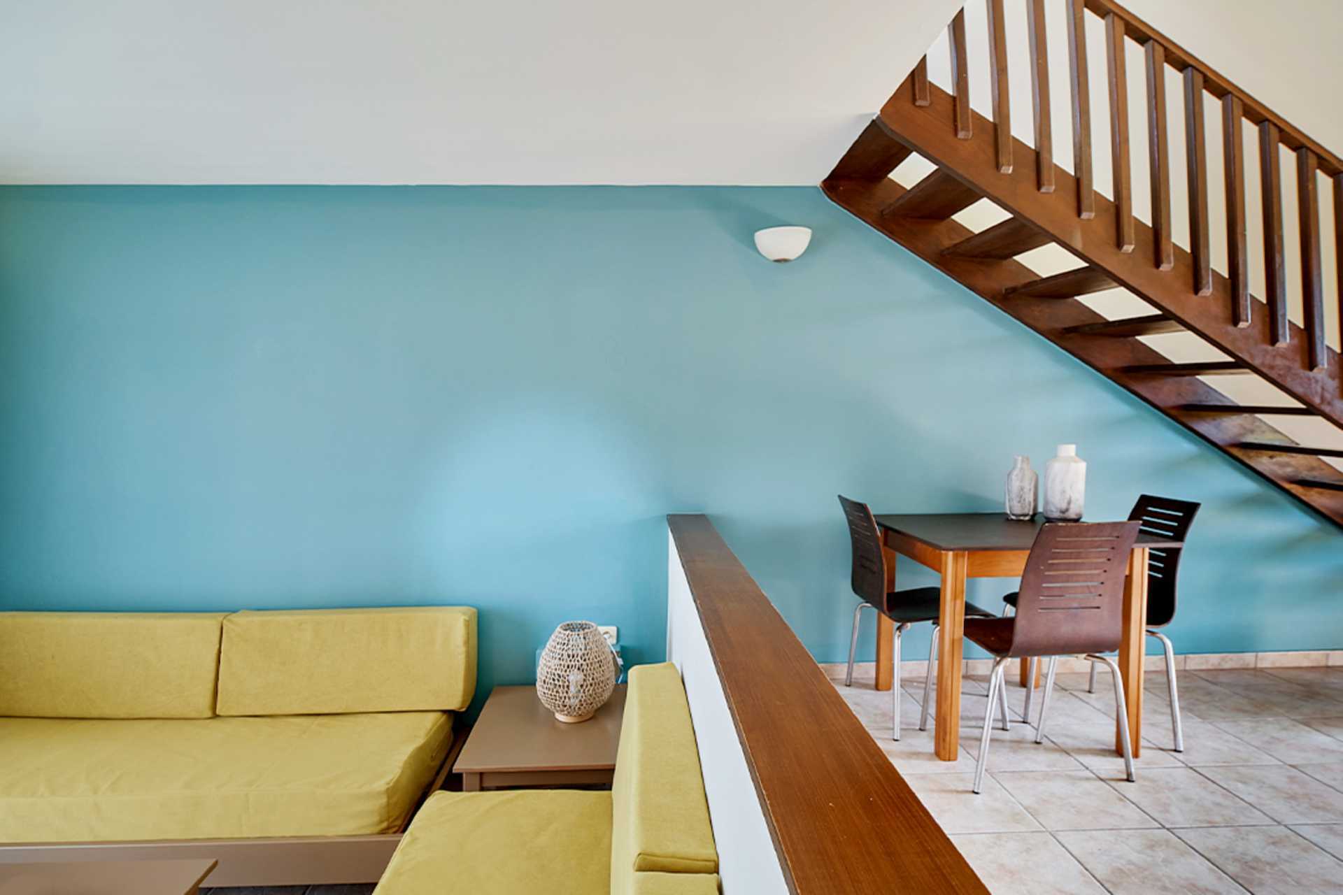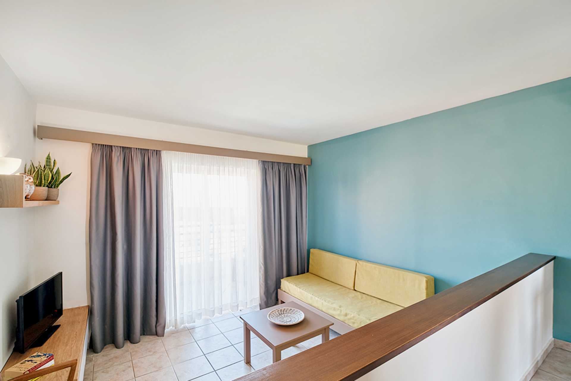 Kaksikerroksinen kaksio, parvekkeella ja näköalalla uima-altaalle. Pohjakerroksessa on olohuone kahdella vuodesohvalla yhdistettynä minikeittiöön ja kylpyhuone hiustenkuivaajalla, kylpyammeella tai suihkulla ja wc sekä parveke. Yläkerrassa on makuuparvi, jossa kaksi erillistä sänkyä, kylpyhuone hiustenkuivaajalla, kylpyamme tai suihku, wc ja parveke. Avoin pohjaratkaisu kerrosten välillä. Maksuton wifi, ilmastointi ja tallelokero. Minikeittiössä keittolevyt, jääkaappi, kahvinkeitin, mikro, vedenkeitin, leivänpaahdin ja yksinkertainen keittiövarustus. Tv kansainvälisillä kanavilla. Siivous 6 krt/viikko.