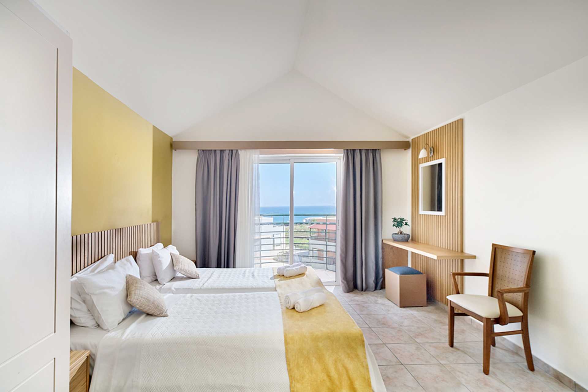 Kolmioita parvekkeella ja allasnäkymällä. Kaksi makuuhuonetta ja yhdistetty olohuone ja minikeittiö. Osassa huoneistoja portaita tai tasoeroja. Kaksi yhden hengen vuodetta kummassakin huoneessa. Lisävuodemahdollisuus vuodesohvasta ja kokoontaitettavasta sängystä. Minikeittiö, jossa keittolevy, jääkaappi, kahvinkeitin, mikro, vedenkeitin, leivänpaahdin ja yksinkertainen keittovarustus. Maksuton wifi, ilmastointi ja tallelokero. Tv kansainvälisillä kanavilla. Hiustenkuivain. Kylpyhuone, jossa amme ja suihku tai vain suihku ja wc. Siivous 6 krt/viikko.