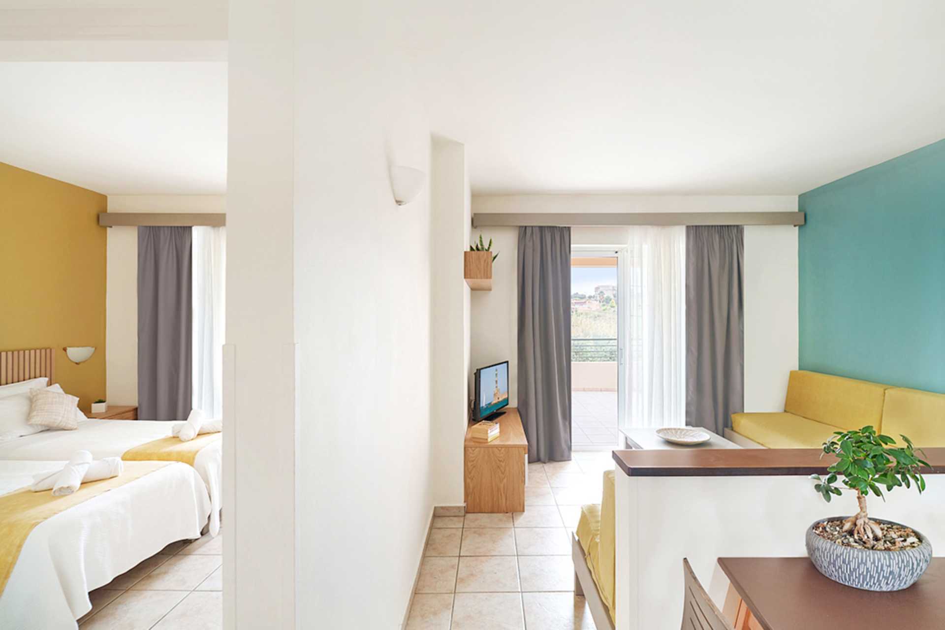 Kolmioita, joissa on parveke allasnäköalalla. Kaksi makuuhuonetta sekä yhdistetty olohuone ja minikeittiö. Kaksi yhden hengen sänkyä molemmissa makuuhuoneissa. Mahdollisuus lisävuoteeseen nojatuolissa tai kokoontaitettavassa sängyssä. Joissakin huoneistoissa on tasoeroja muutamalla askelmalla. Minikiettiössä keittolevyt, jääkaappi, kahvinkeitin, mikro, vedenkeitin, leivänpaahdin ja yksinkertainen keittiövarustus. Maksuton wifi, ilmastointi ja tallelokero. Tv kansainvälisillä kanavilla. Hiustenkuivain. Kylpyamme tai suihku ja wc. Siivous 6 krt/viikko.