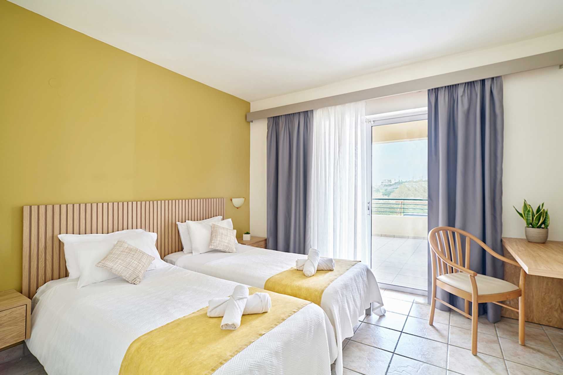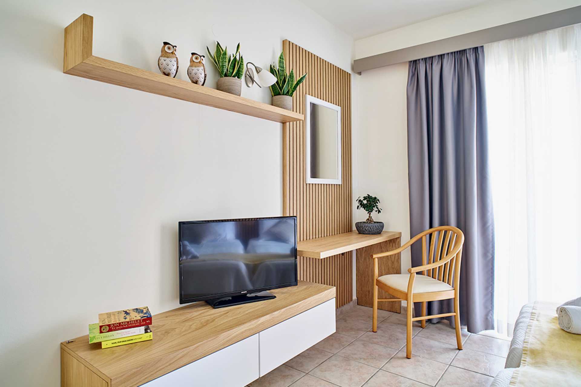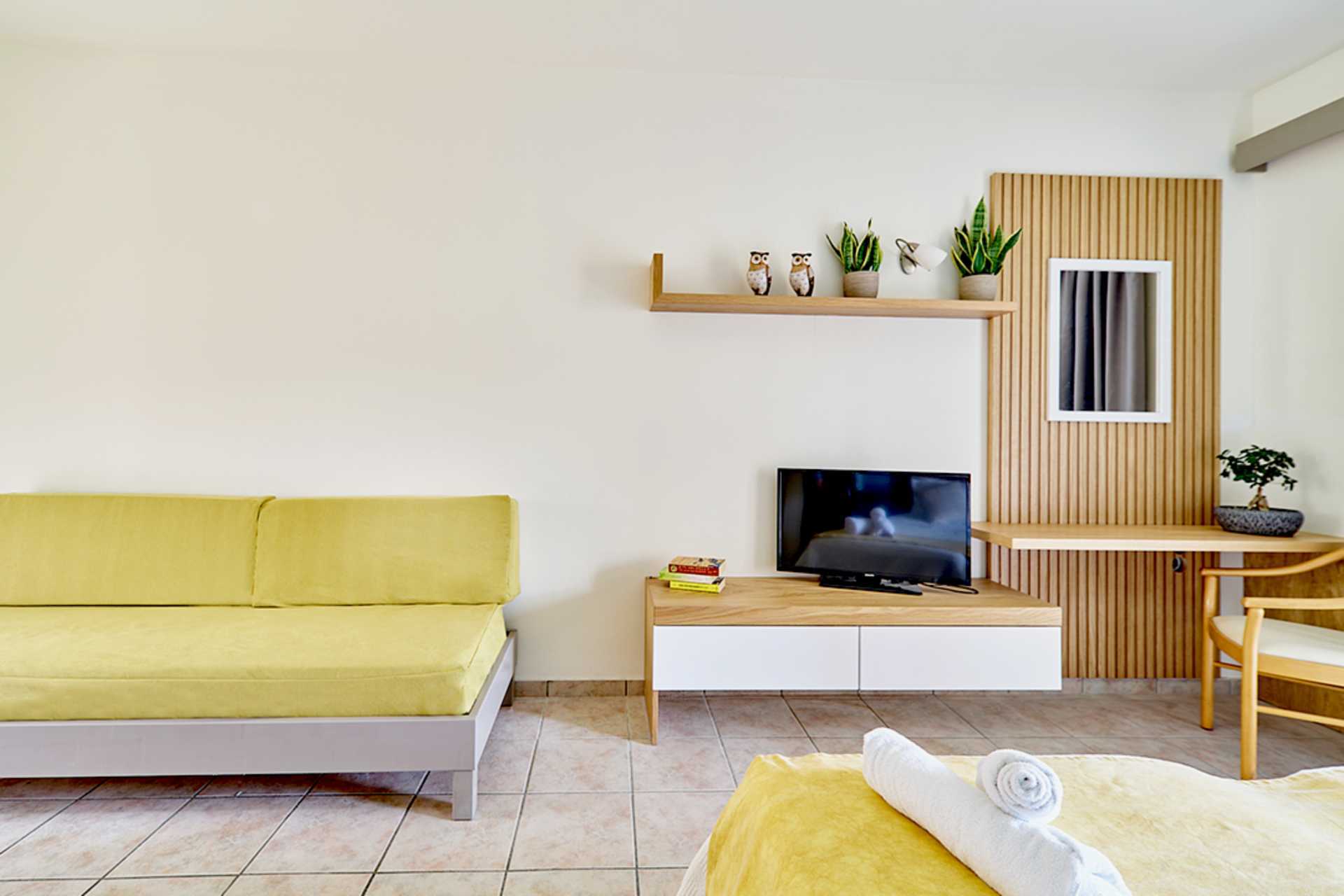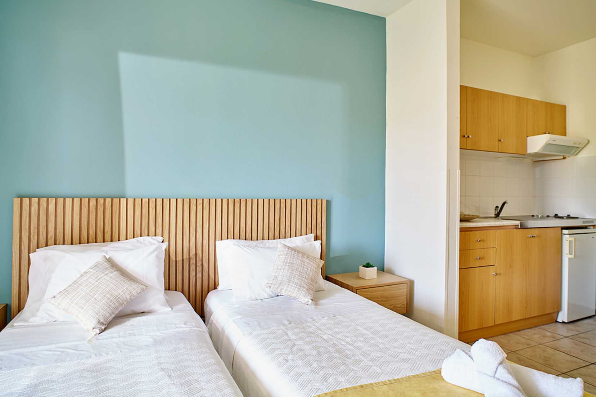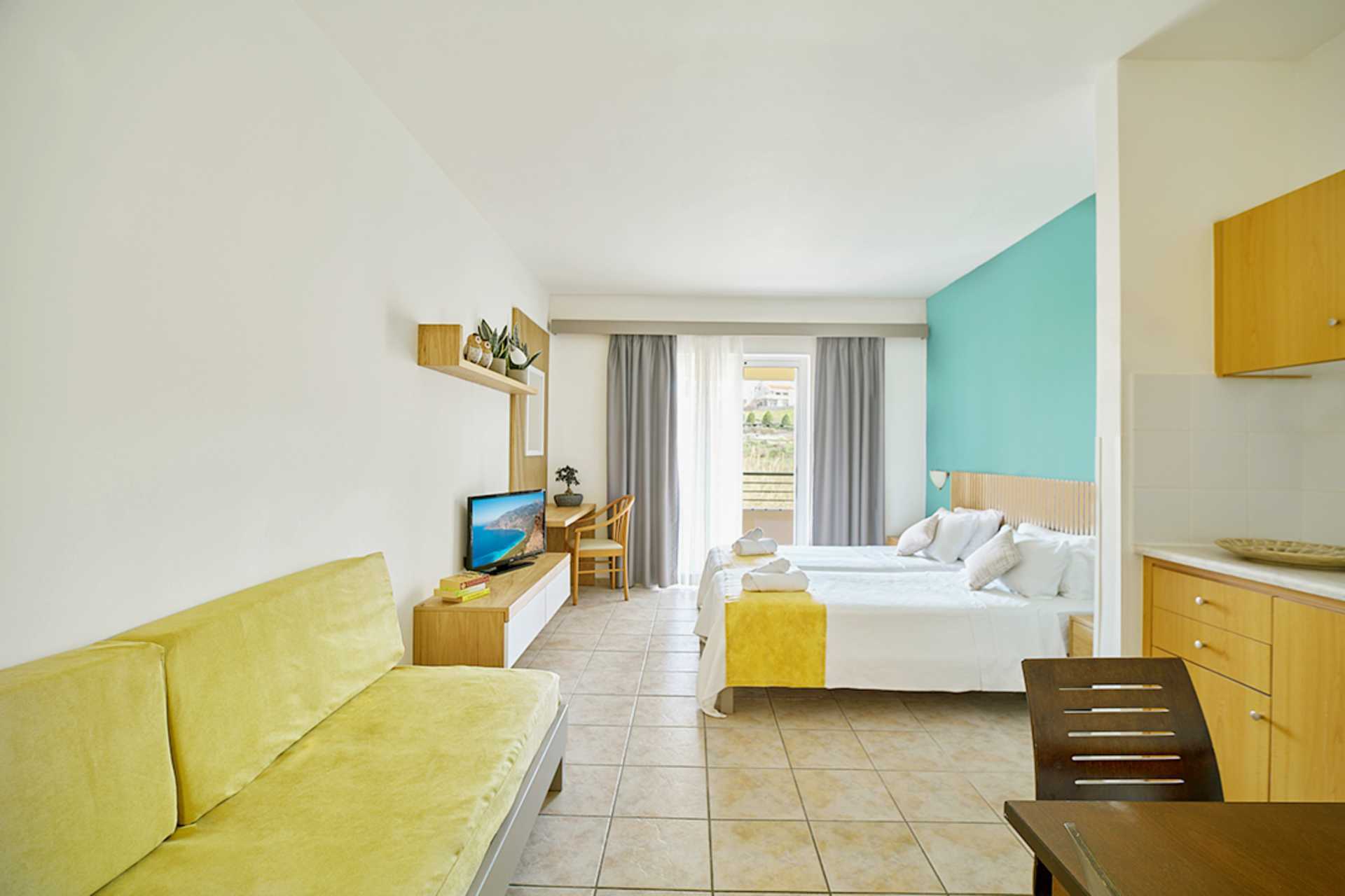 Yksiö, parvekkeella tai maaparvekkeella, joista osasta on näkymä uima-altaalle. Yhdistetty makuuhuone ja minikeittiö. Joissakin huoneistoissa on muutama askelma. Kaksi yhden hengen sänkyä. Lisävuodemahdollisuus vuodesohvasta. Minikeittiössä keittolevyt, jääkaappi, kahvinkeitin, mikro, vedenkeitin, leivänpaahdin ja yksinkertainen keittiövarustus. Maksuton wifi, ilmastointi ja tallelokero. Tv kansainvälisillä kanavilla. Hiustenkuivain. Suihku ja wc. Siivous 6 krt/viikko.