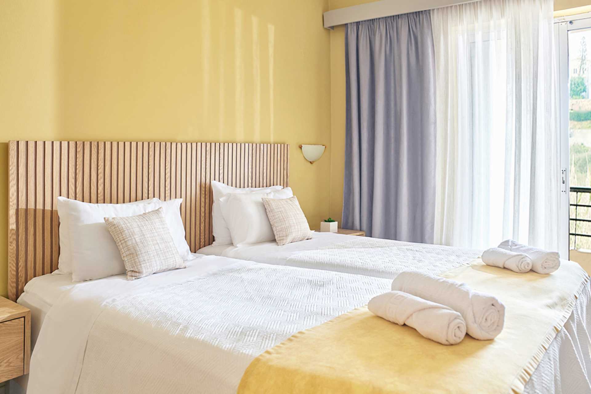 Kaksio parvekkeella tai maaparvekkeella, osassa näköala altaalle. Makuuhuone sekä yhdistetty olohuone ja minikeittiö. Joissakin huoneistoissa on tasoeroja muutaman askelman verran. Kaksi yhden hengen sänkyä. Lisävuodemahdollisuus kahteen vuodesohvaan. Minikeittiössä keittolevyt, jääkaappi, kahvinkeitin, mikro, vedenkeitin, leivänpaahdin ja yksinkertainen keittiövarustus. Maksuton wifi, ilmastointi ja tallelokero. Tv kansainvälisillä kanavilla. Hiustenkuivain. Kylpyamme tai suihku ja wc. Siivous 6 krt/viikko.