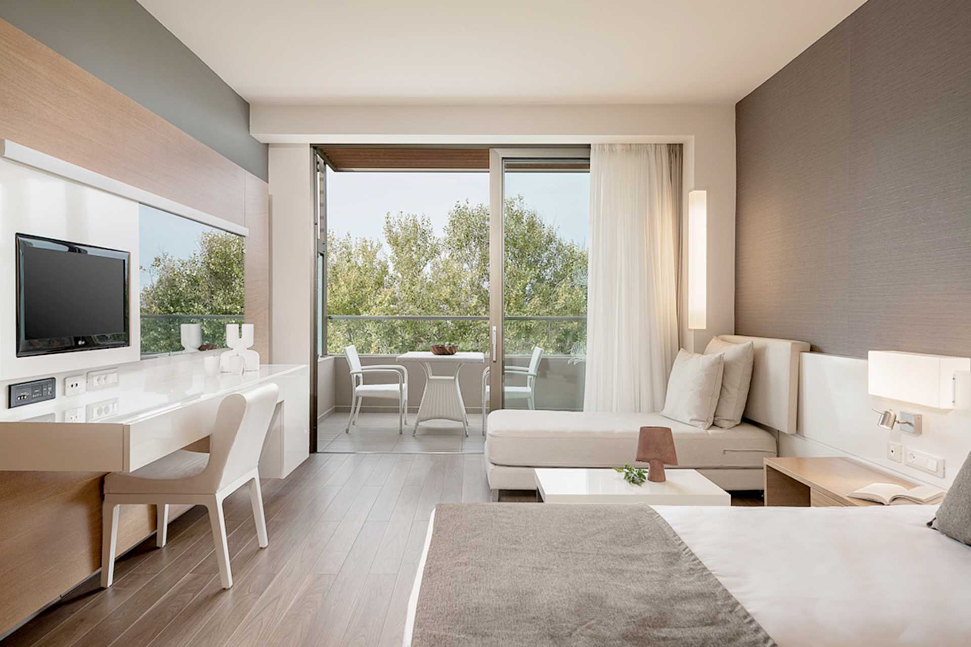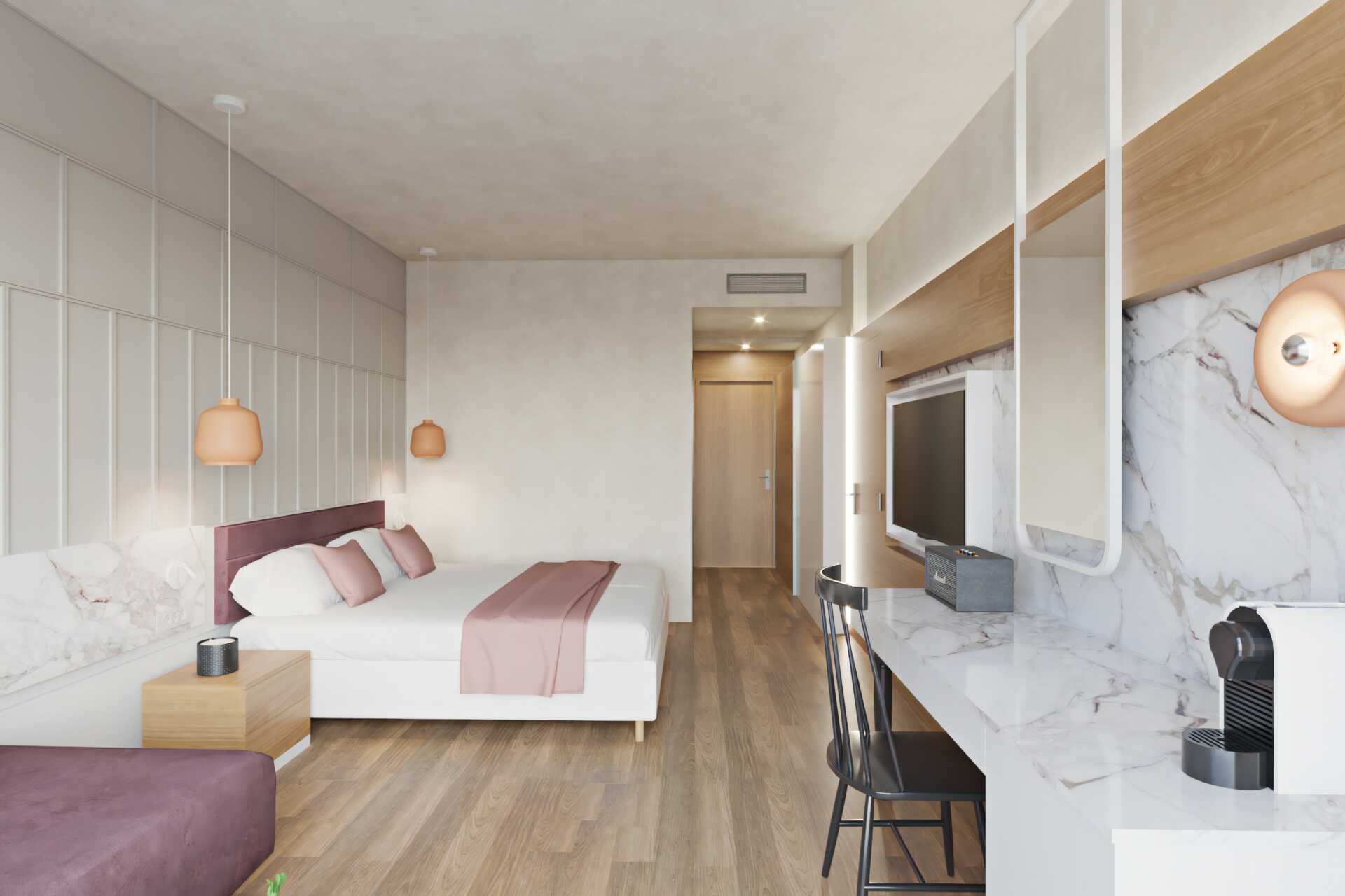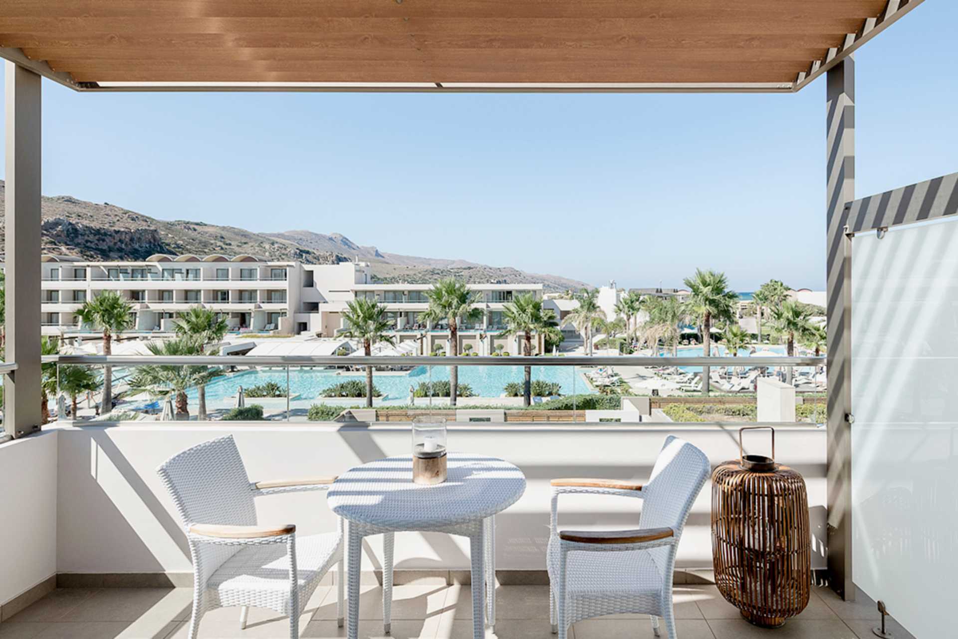Deluxe -huone, jossa parveke tai terassi ja allasnäköala. Parivuode tai kaksi yhden hengen sänkyä. Lisävuodemahdollisuus vuodesohvasta. Maksuton wifi, ilmastointi ja tallelokero. Minibaari lisämaksulla. Vedenkeitin, kahvia ja teetä. Tv kansainvälisillä kanavilla. Hiustenkuivain. Kylpytakit ja tossut. Kylpyhuoneessa kylpyamme, erillinen suihku ja wc. Siivous 7 krt/viikko. Alle 2-vuotiaat lapset lasketaan lisävuoteella majoittuviksi henkilöiksi.