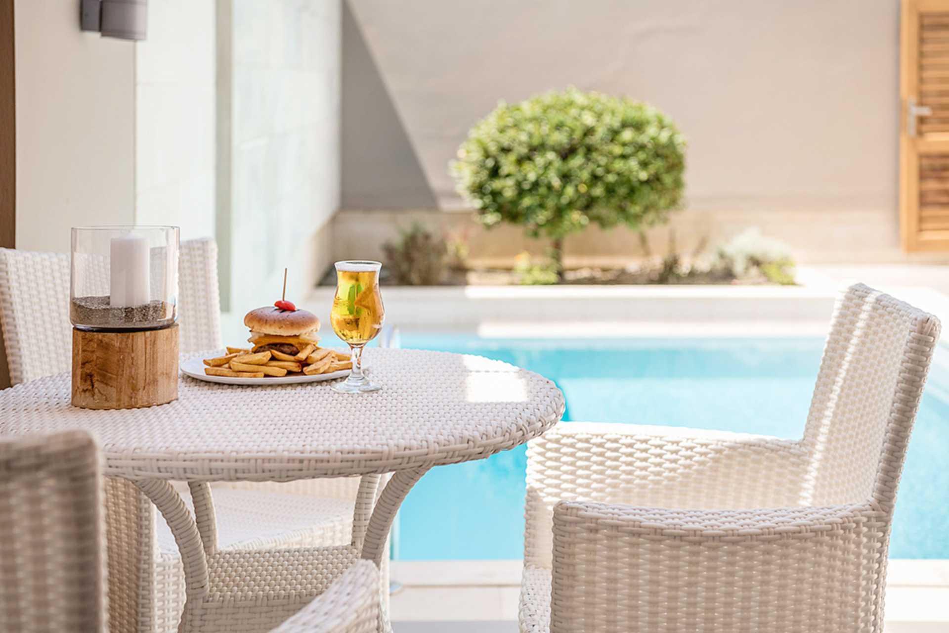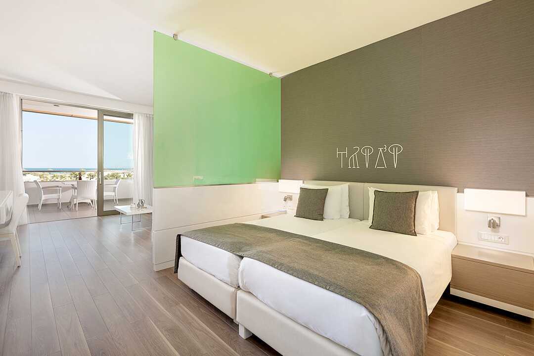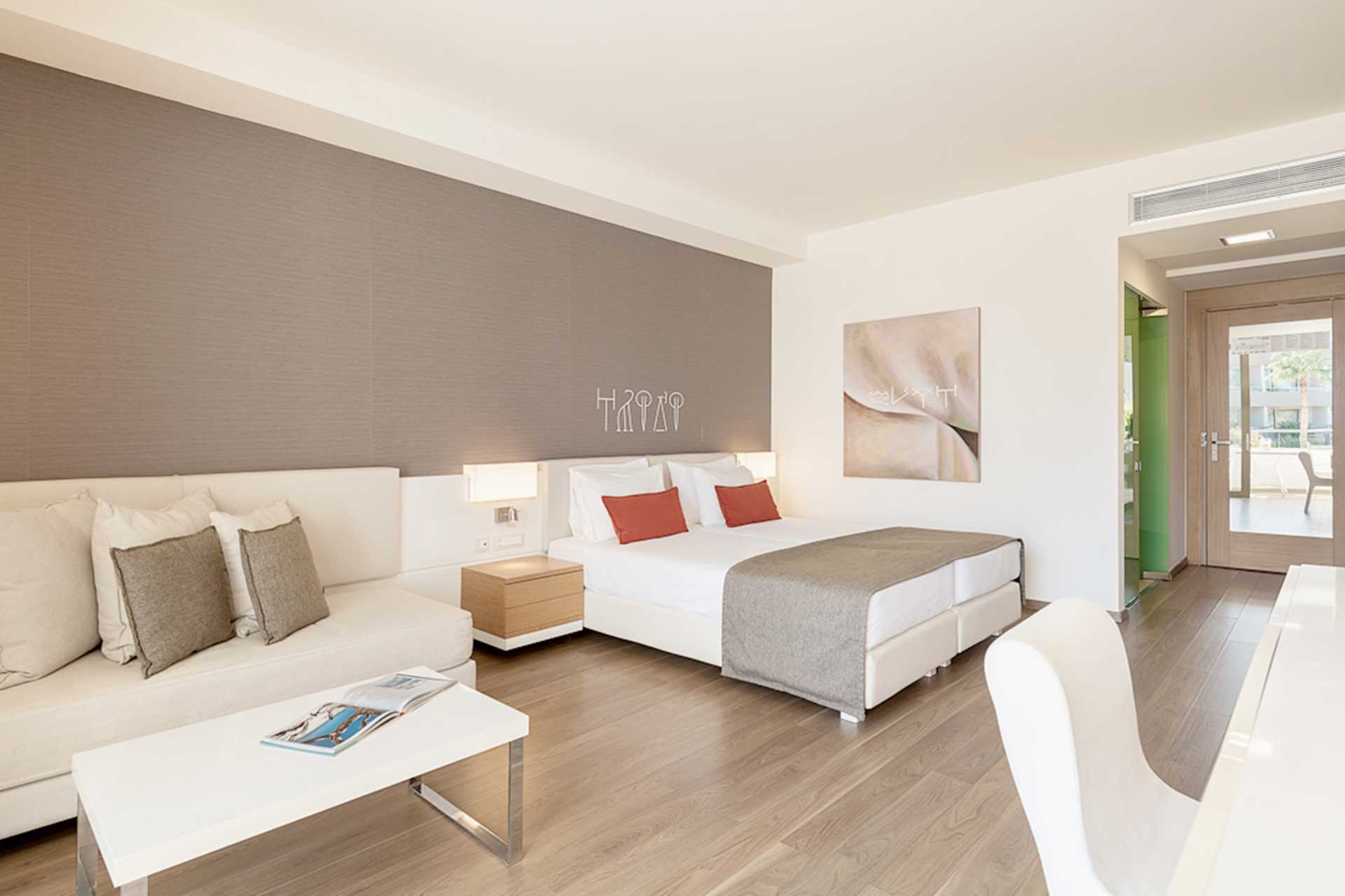 Deluxe-sviitti oma uima-allas ja iso terassi. Portaat altaaseen. Terassilla on aurinkotuoleja sekä pöytiä ja tuoleja. Sviitti koostuu makuuhuoneesta ja olohuoneesta, jotka voidaan erottaa liukuovella. Makuuhuoneessa on parivuode ja kylpyhuone kylpyammeella ja erillisellä suihkulla sekä wc vieressä. Mahdollisuus lisävuoteisiin olohuoneen vuodesohvalla. Olohuoneen vieressä wc. Maksuton wifi, ilmastointi ja tallelokero. Minibaari lisämaksulla. Vedenkeitin, kahvia ja teetä. Tv kansainvälisillä kanavilla. Hiustenkuivain. Kylpytakit ja tossut. Siivous 7 krt/viikko. Alle kaksivuotiaat lapset lasketaan lisävuoteella majoittuviksi henkilöiksi.