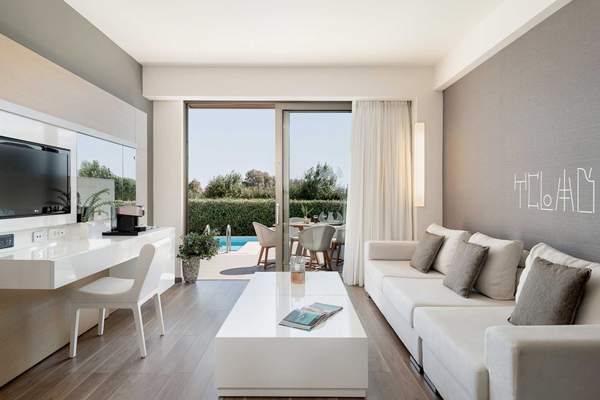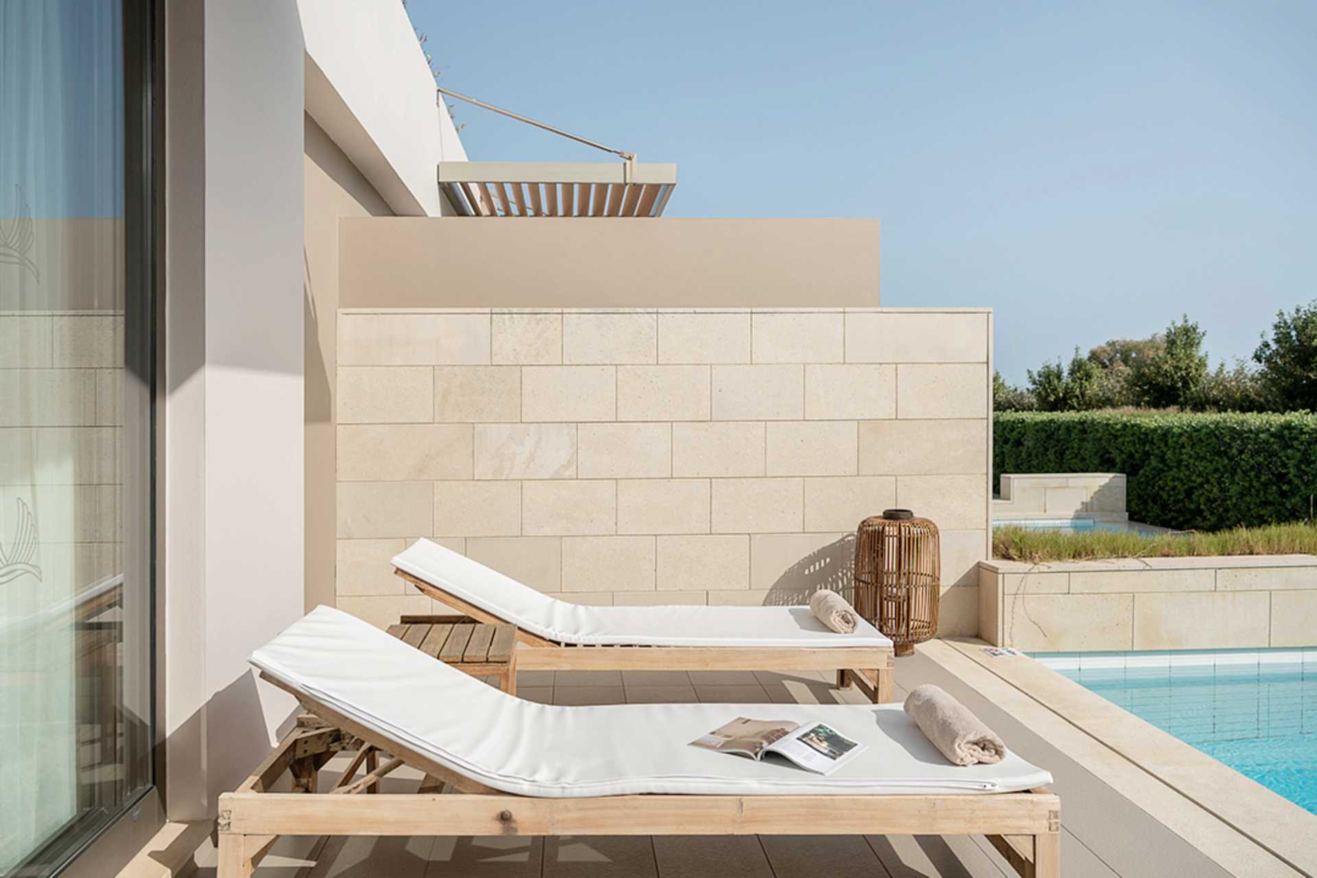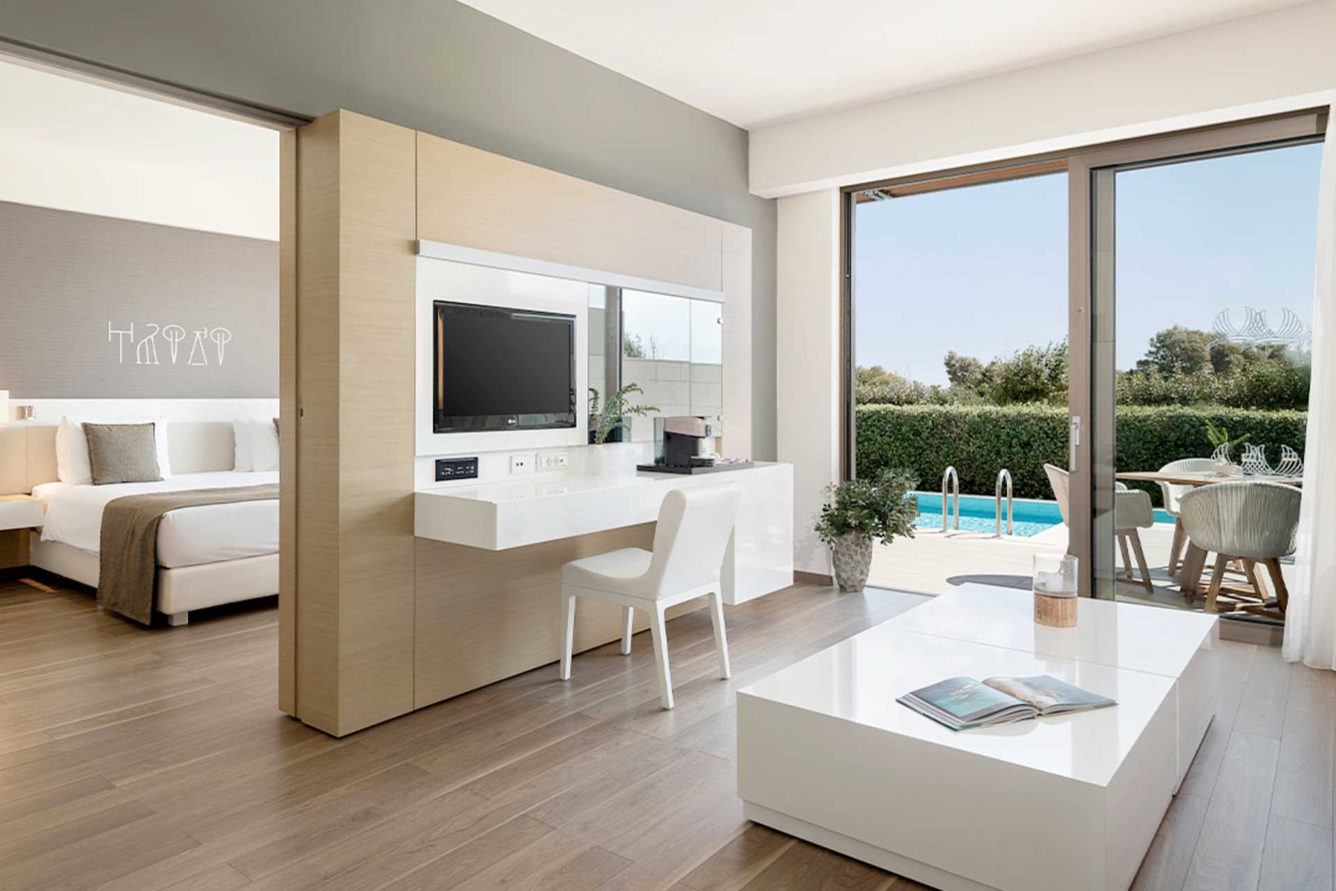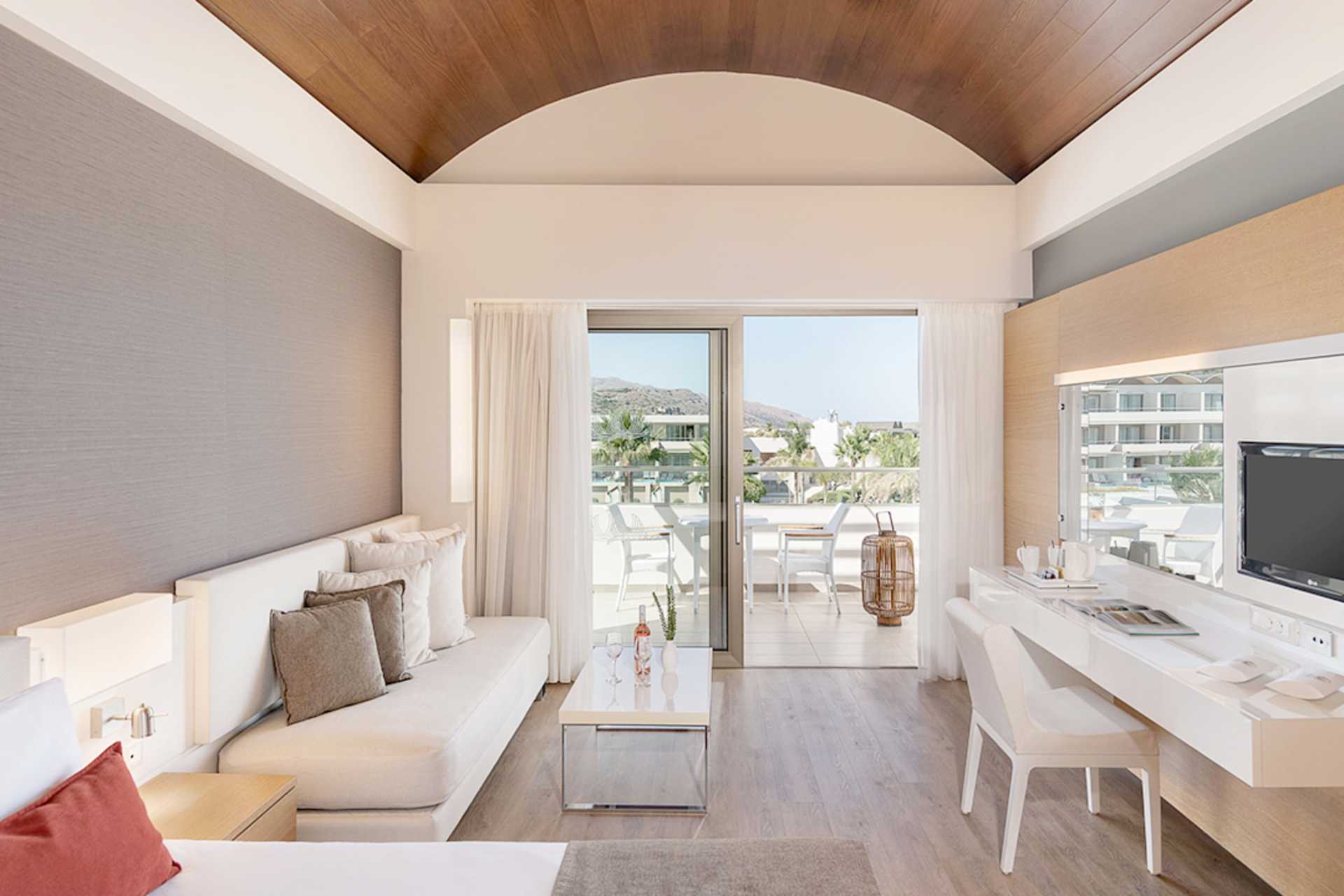 Juniorsviitti Premium oma uima-allas. Portaat altaaseen. Terassilla on aurinkotuolit sekä pöytä ja tuolit. Parivuode. Lisävuodemahdollisuus vuodesohvasta. Tyynymenu. Maksuton wifi, ilmastointi ja tallelokero. Minibaari lisämaksulla. Vedenkeitin, kahvia ja teetä. Tv kansainvälisillä kanavilla. Hiustenkuivain. Kylpytakit ja tossut. Kylpyhuoneessa kylpyamme, erillinen suihku ja wc. Siivous 7 krt/viikko.
