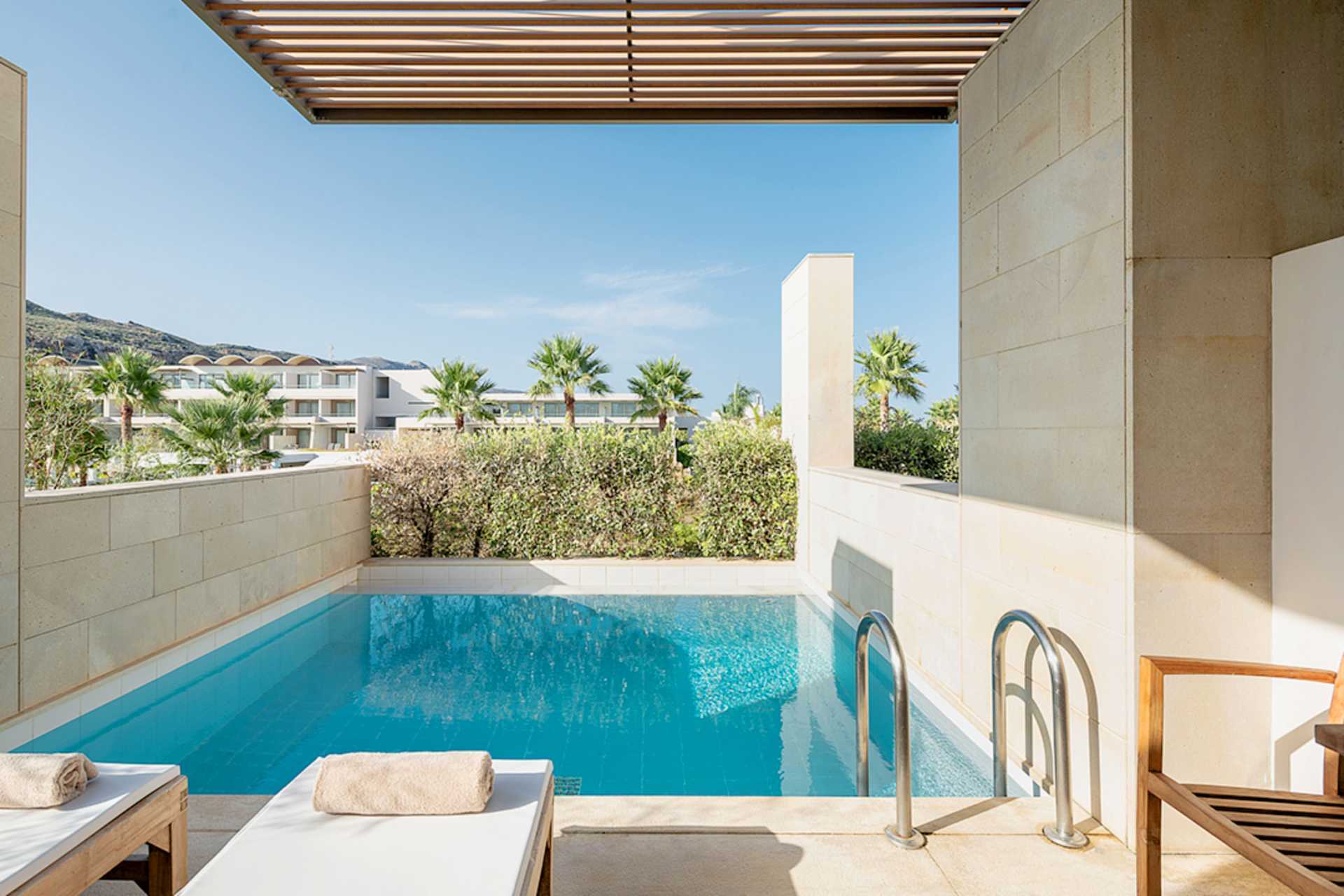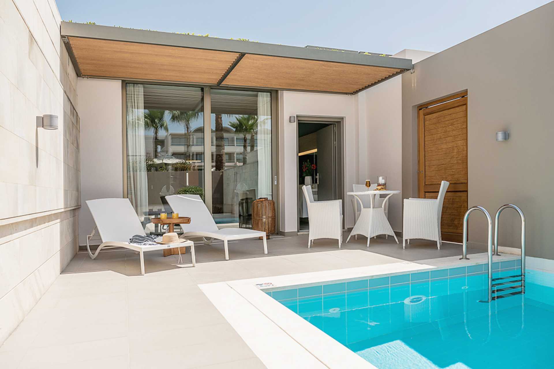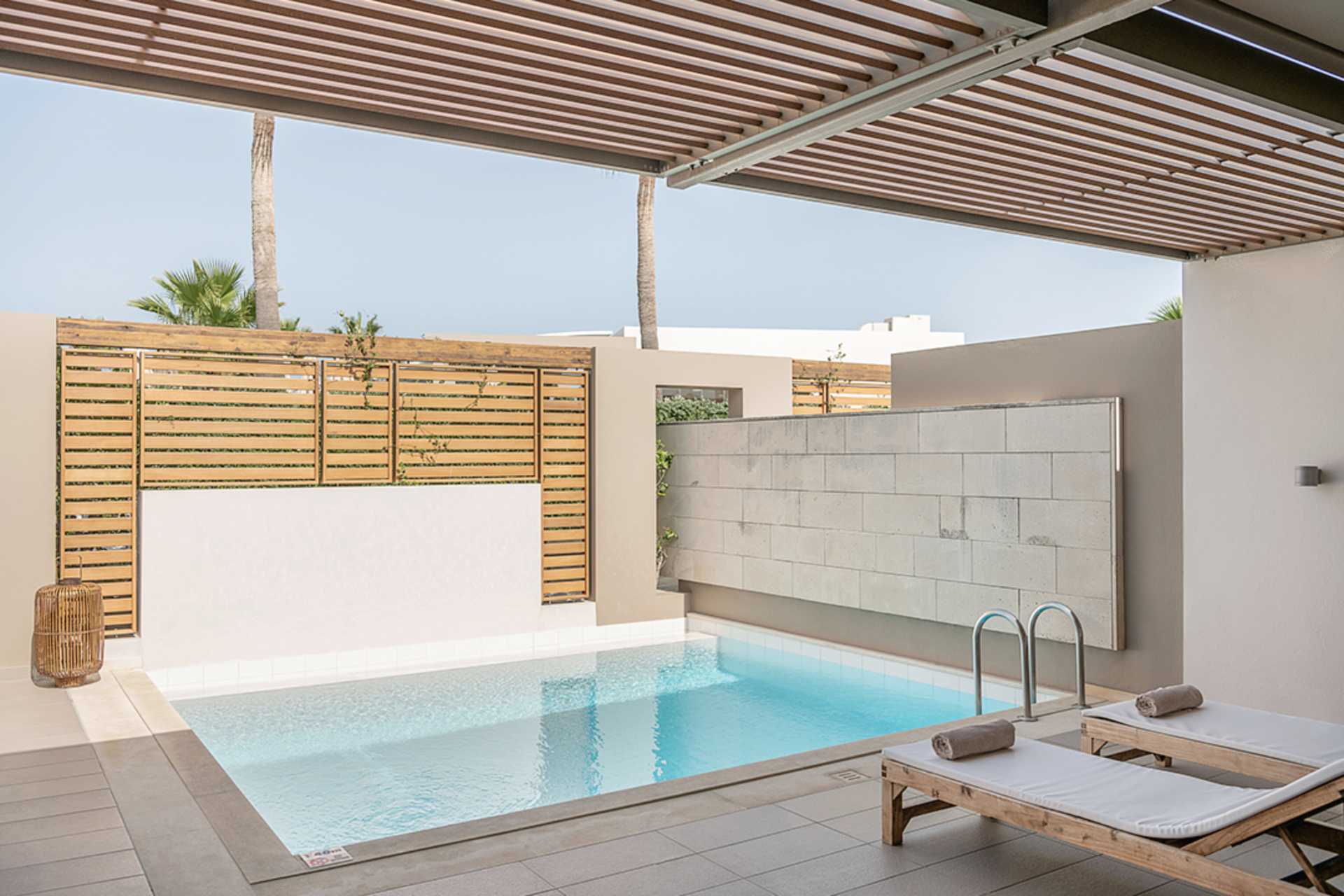Kahden hengen huone, oma-allas maaterassilla. Portaat altaaseen. Terassilla on aurinkotuoleja sekä pöytiä ja tuoleja. Parivuode tai kaksi yhden hengen sänkyä. Maksuton wifi, ilmastointi ja tallelokero. Minibaari lisämaksulla. Vedenkeitin, kahvia ja teetä. Tv kansainvälisillä kanavilla. Hiustenkuivain. Kylpytakit ja tossut. Kylpyhuoneessa kylpyamme, erillinen suihku ja wc. Siivous 7 krt/viikko. Alle 2-vuotiaat lapset lasketaan lisävuoteella majoittuviksi henkilöiksi.