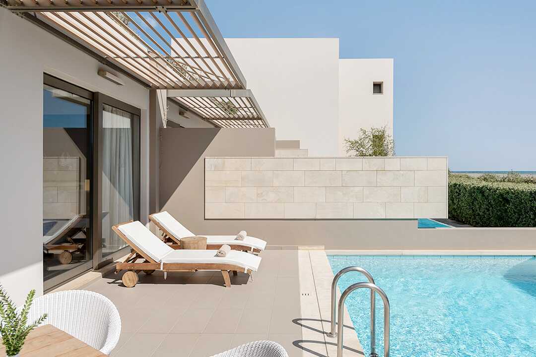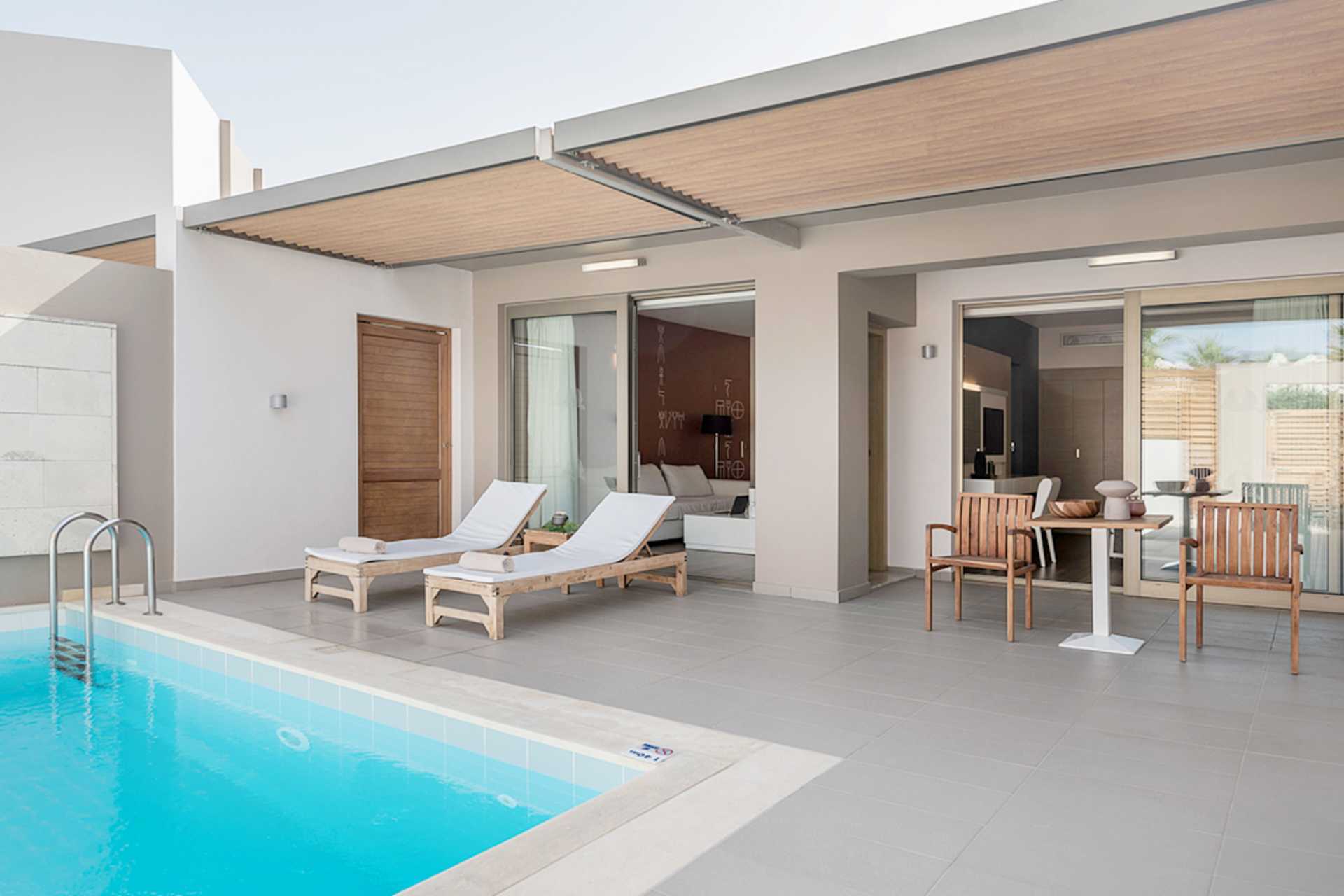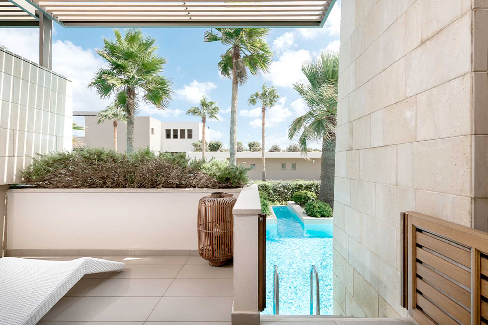 Kahden hengen huone, oma-allas maaterassilla. Portaat altaaseen. Terassilla on aurinkotuoleja sekä pöytiä ja tuoleja. Parivuode tai kaksi yhden hengen sänkyä. Maksuton wifi, ilmastointi ja tallelokero. Minibaari lisämaksulla. Vedenkeitin, kahvia ja teetä. Tv kansainvälisillä kanavilla. Hiustenkuivain. Kylpytakit ja tossut. Kylpyhuoneessa kylpyamme, erillinen suihku ja wc. Siivous 7 krt/viikko. Alle 2-vuotiaat lapset lasketaan lisävuoteella majoittuviksi henkilöiksi.